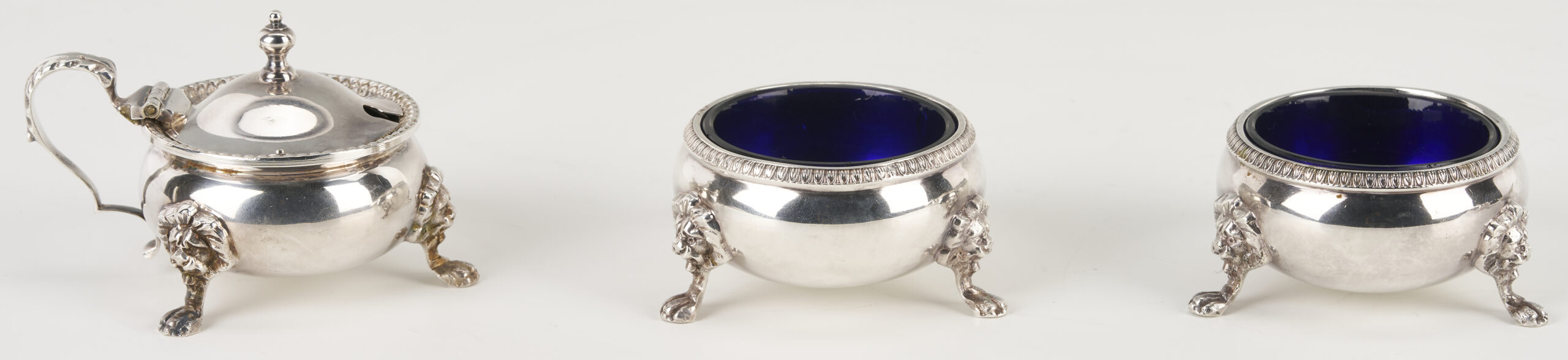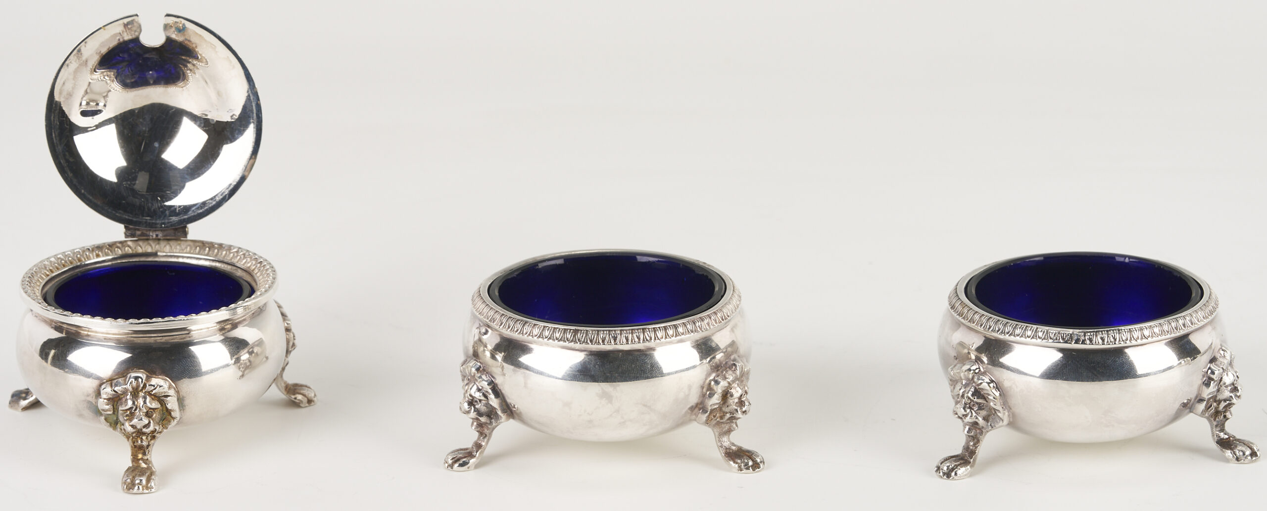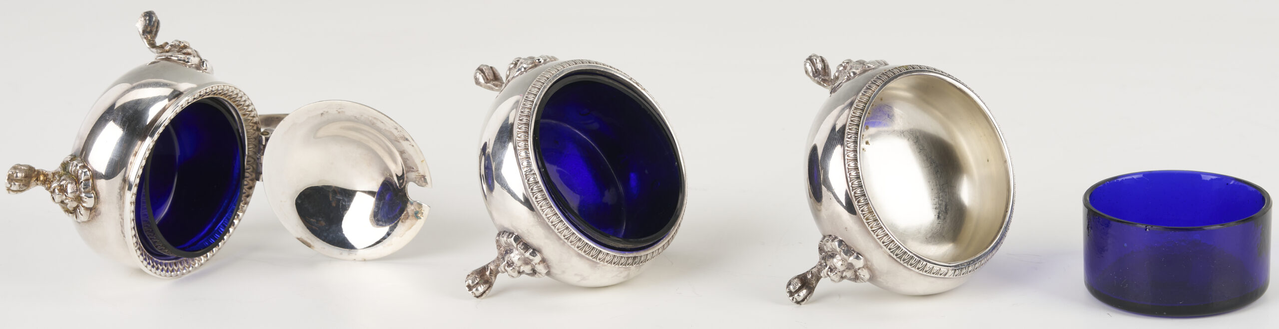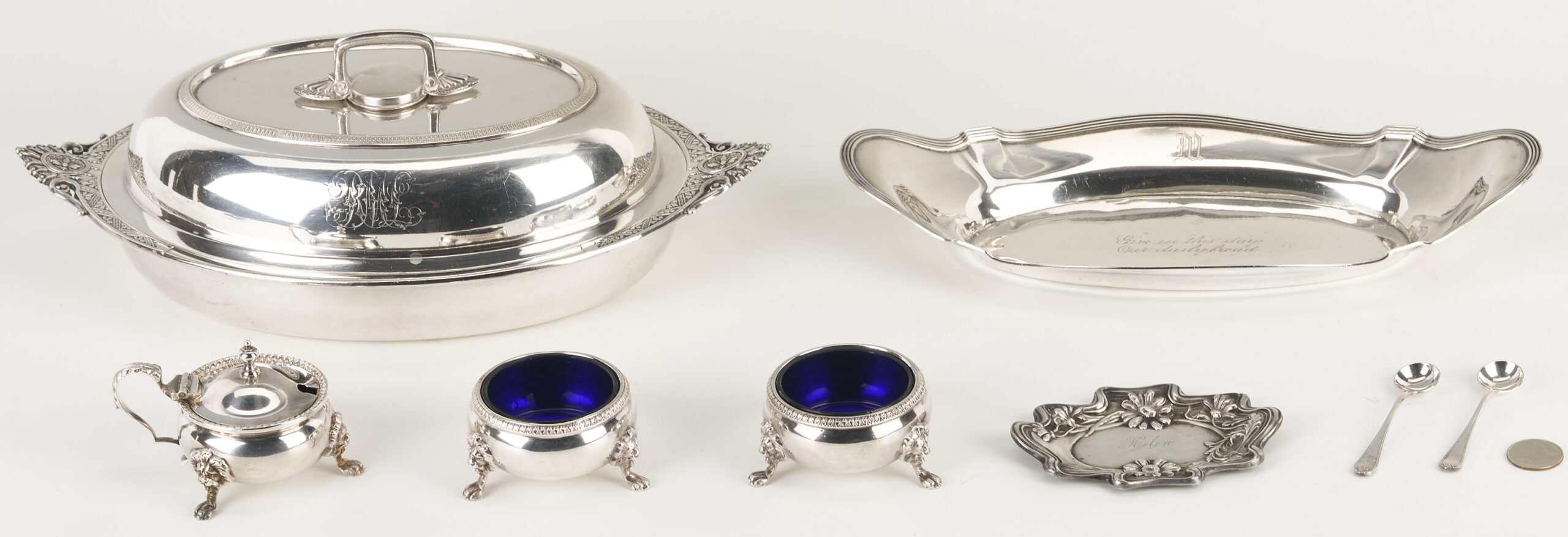 1st item: 1 Art Nouveau sterling daisy pattern pin dish monogrammed “Helen”. 2nd item: 1 Gorham Sterling oval bread tray engraved “Give us this Day our Daily Bread” with monograms. 3rd item: 1 antique Tiffany Aesthetic Movement silverplated oval entree dish. 4th through 6th items: 2 English IFS Ltd. circular silverplated salt cellars with spoons plus 1 matching covered condiment pot, each of the 3 pieces with cobalt glass liners. Sizes range: 1 5/8 in. dia x 2 5/8 in. H to 5 in. H x 13 in. W x 8 in. D. Combined weight, sterling items: 7.82 oz troy.