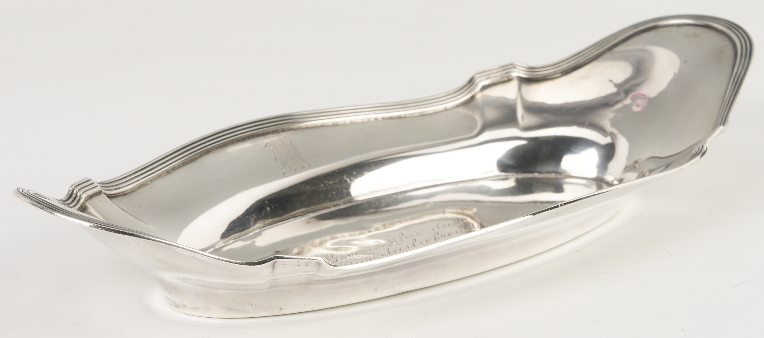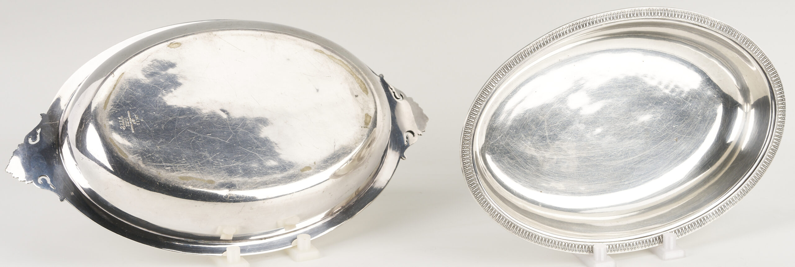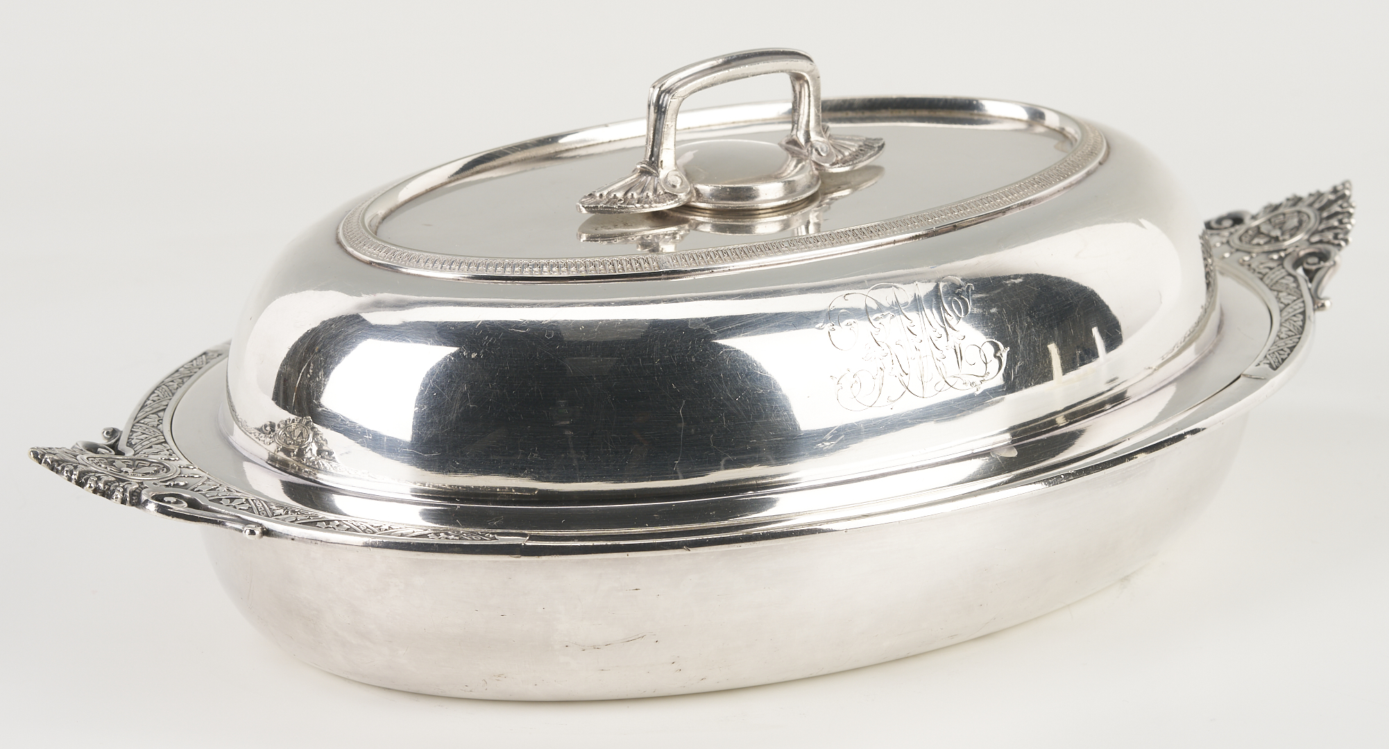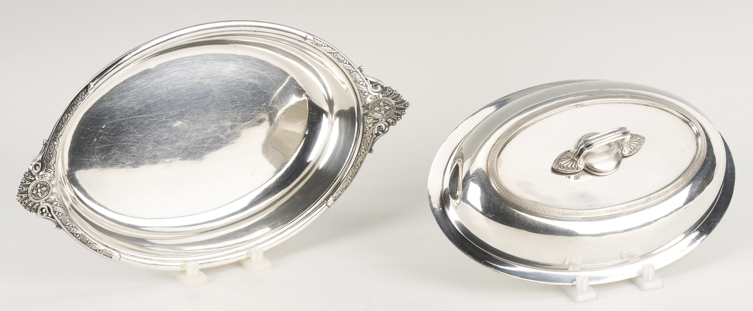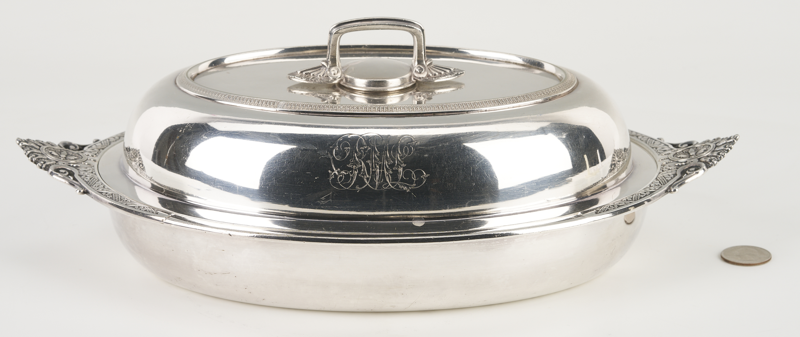 Both sterling items and the silverplated Tiffany entree dish are monogrammed. Tiffany dish with scratches and small spots of wear.