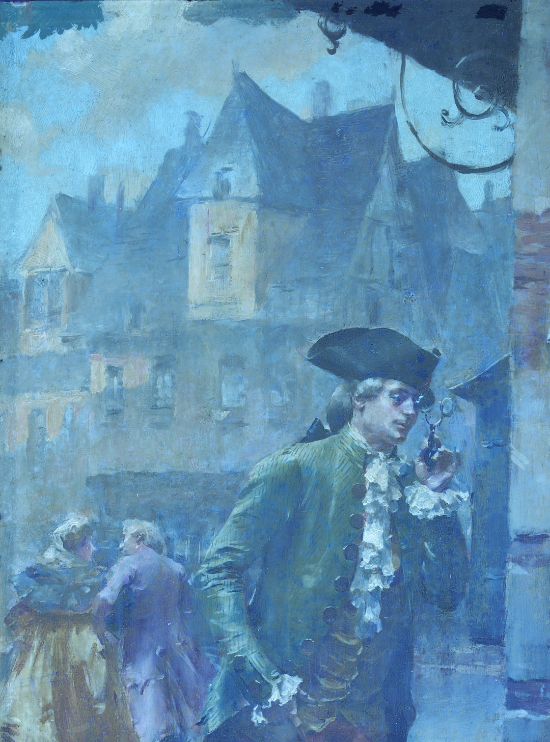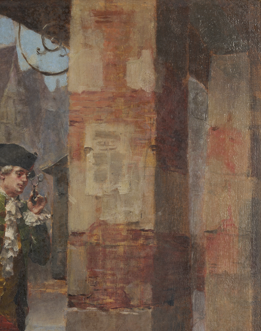 Henri Victor Lesur (French, 1863-1900) oil on panel genre painting that depicts an aristocratic gentleman who wears a tricorn hat and powdered wig and holds a pair of spectacles as he reads a public bulletin. In the background at left a couple walks toward a building on the opposite side of a square. Signed “V. Henry Lesur,” lower right. With partial Swain’s Art Store, Plainfield, NJ label affixed to verso. Housed in a giltwood frame. Sight: 11 11/16 in. H x 8 7/8 in. W. Board: 12 3/16 in. H x 9 3/8 in. W. Framed: 15 3/4 in. H x 13 in. W.