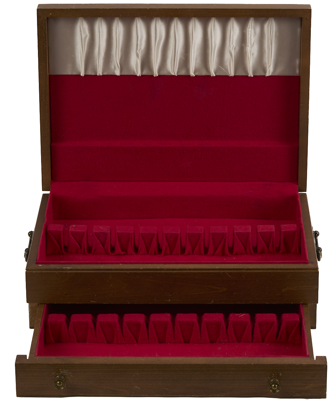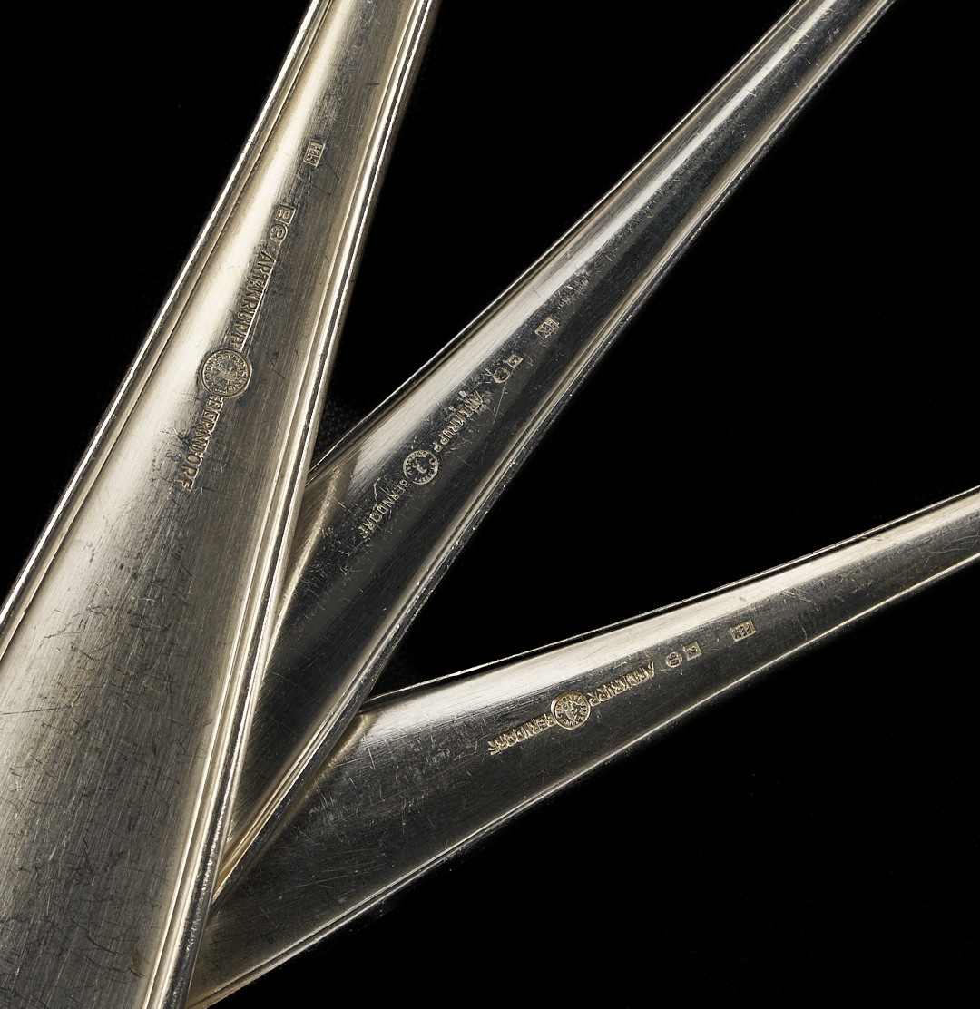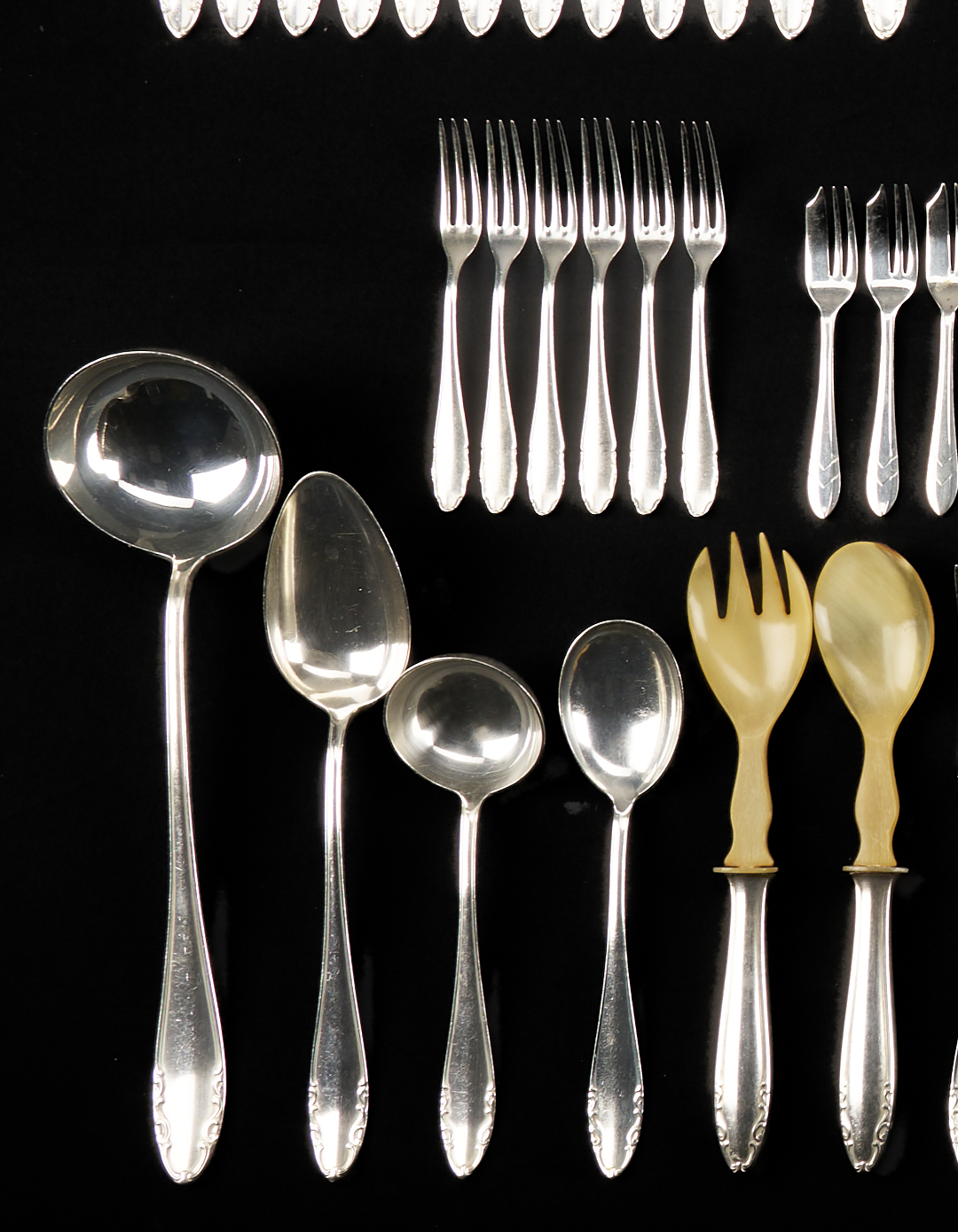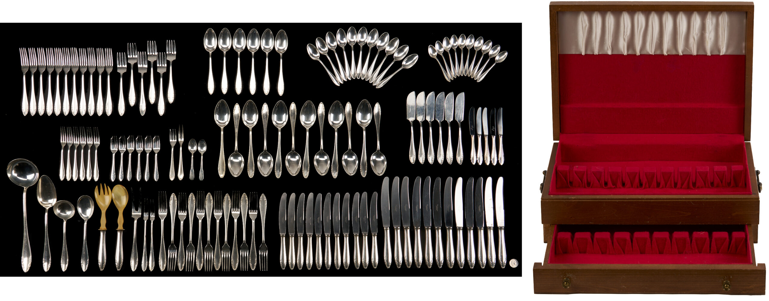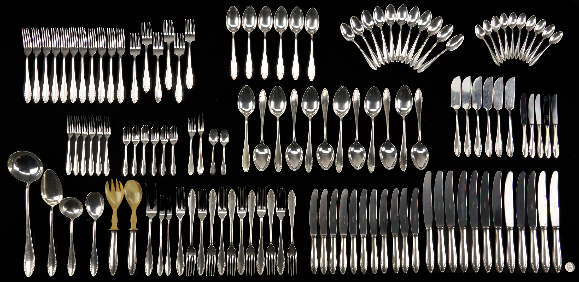 118 pieces Artkrupp Berndorf German Art Deco era silver-plated flatware, plus 9 other pieces (127 pcs total). Artkrupp Berndorf flatware set includes 12 knives (10 in.), 11 luncheon knives (8 1/4 in.), 12 dinner forks (8 1/2 in.), 11 luncheon forks (7 3/8 in.), 6 salad forks, 6 dessert forks, 6 place/oval soup spoons, 12 tablespoons, 11 teaspoons, 10 demitasse/coffee spoons, 6 long handle butter spreaders, 5 short hollow handle butter knives, 1 seafood or cocktail pick, 2 olive/pickle forks, 1 soup ladle, 1 gravy ladle, 1 salad fork and 1 salad spoon, 1 large serving spoon, 1 large 2-prong meat or lettuce fork, and 1 oval bowl serving spoon. In a wooden fitted case with anti-tarnish lining. Also included are 7 silver-plated pastry forks and 2 demitasse spoons in unrelated patterns by other makers.