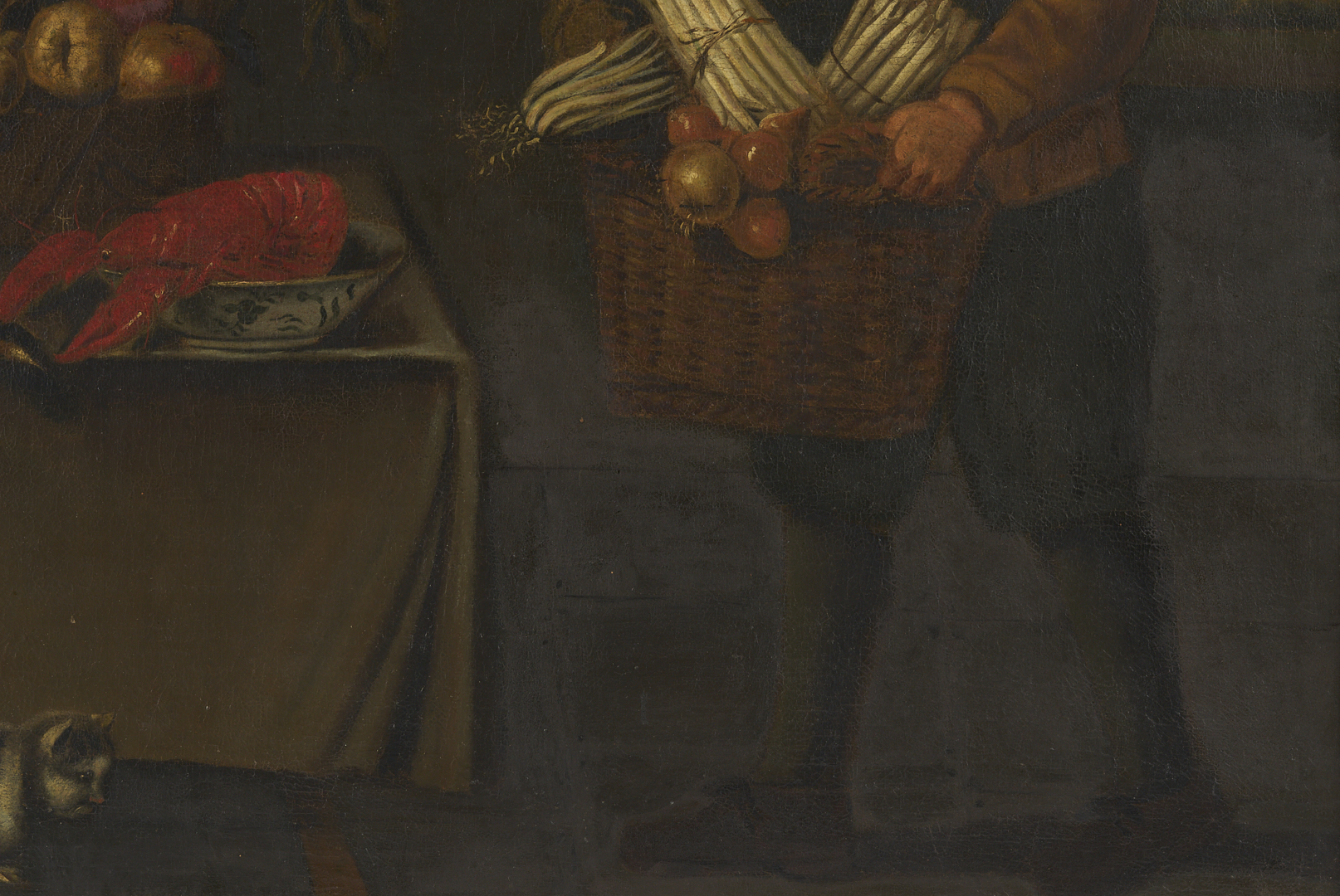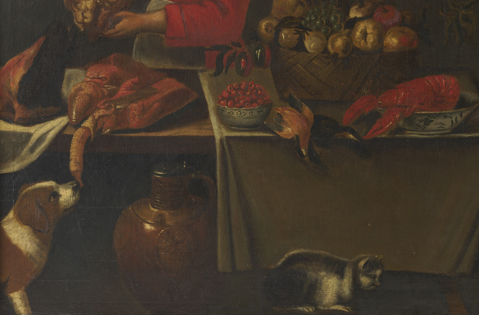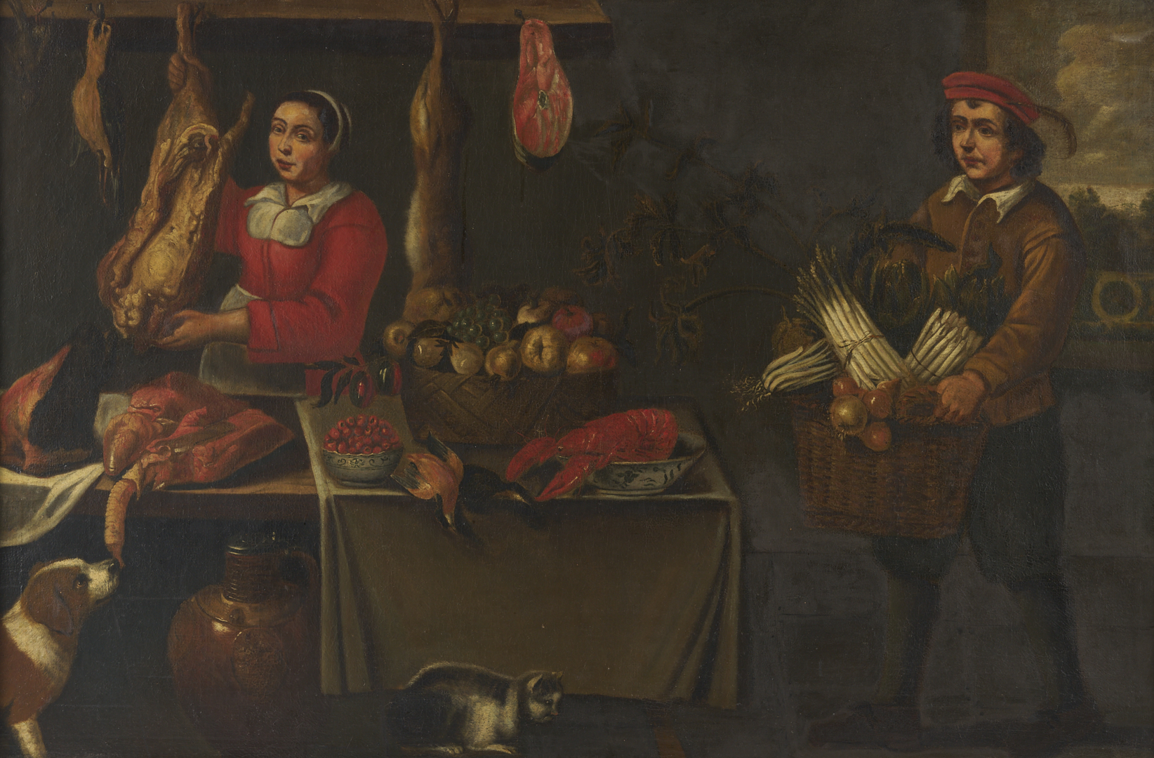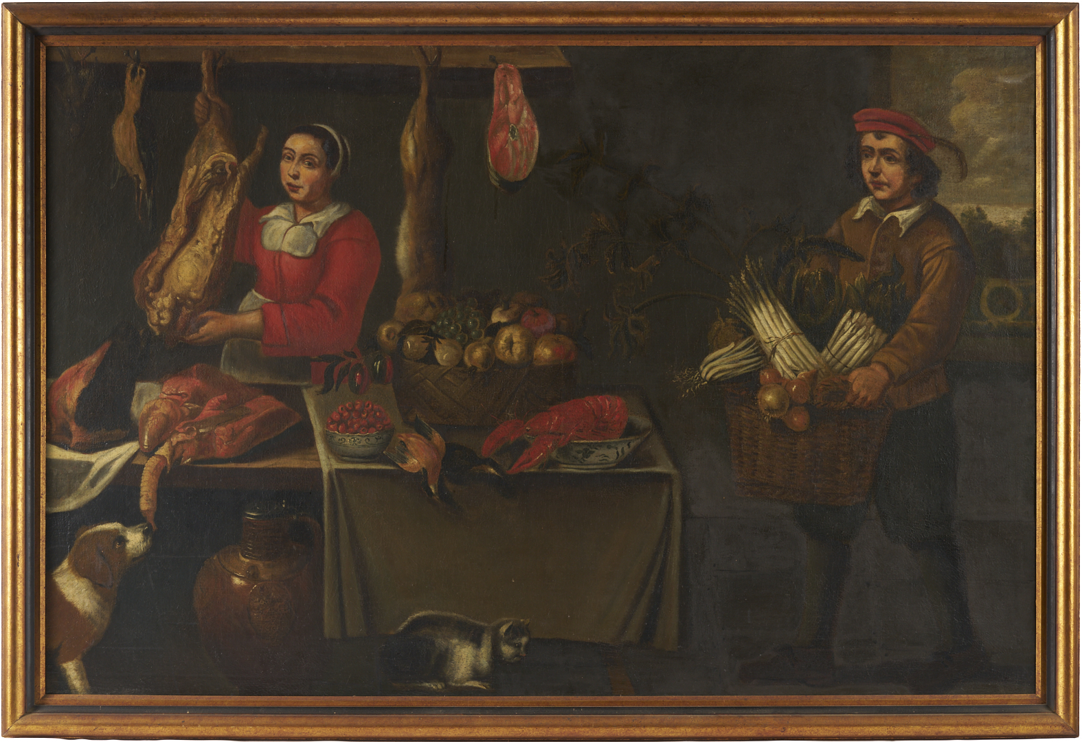 Large oil on canvas European kitchen interior genre painting, likely Dutch or German school. A woman stands behind a table and displays a butchered animal while a man who holds a basket filled with vegetables enters at right. Fruits and meats including a large lobster rest on the table and additional meats hang to either side of the woman. A dog investigates an intrail that hangs from the tabletop while a cat waits nearby. Housed in a painted and giltwood frame. Canvas: 43 1/2 in. H x 68 in. W. Framed: 48 in. H x 70 1/2 in. W. 18th century or earlier.