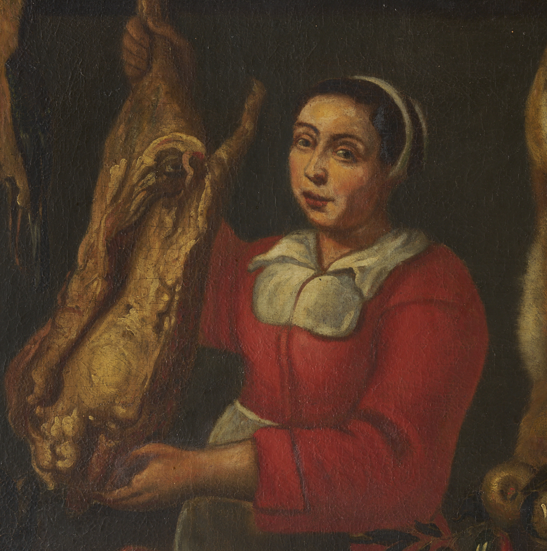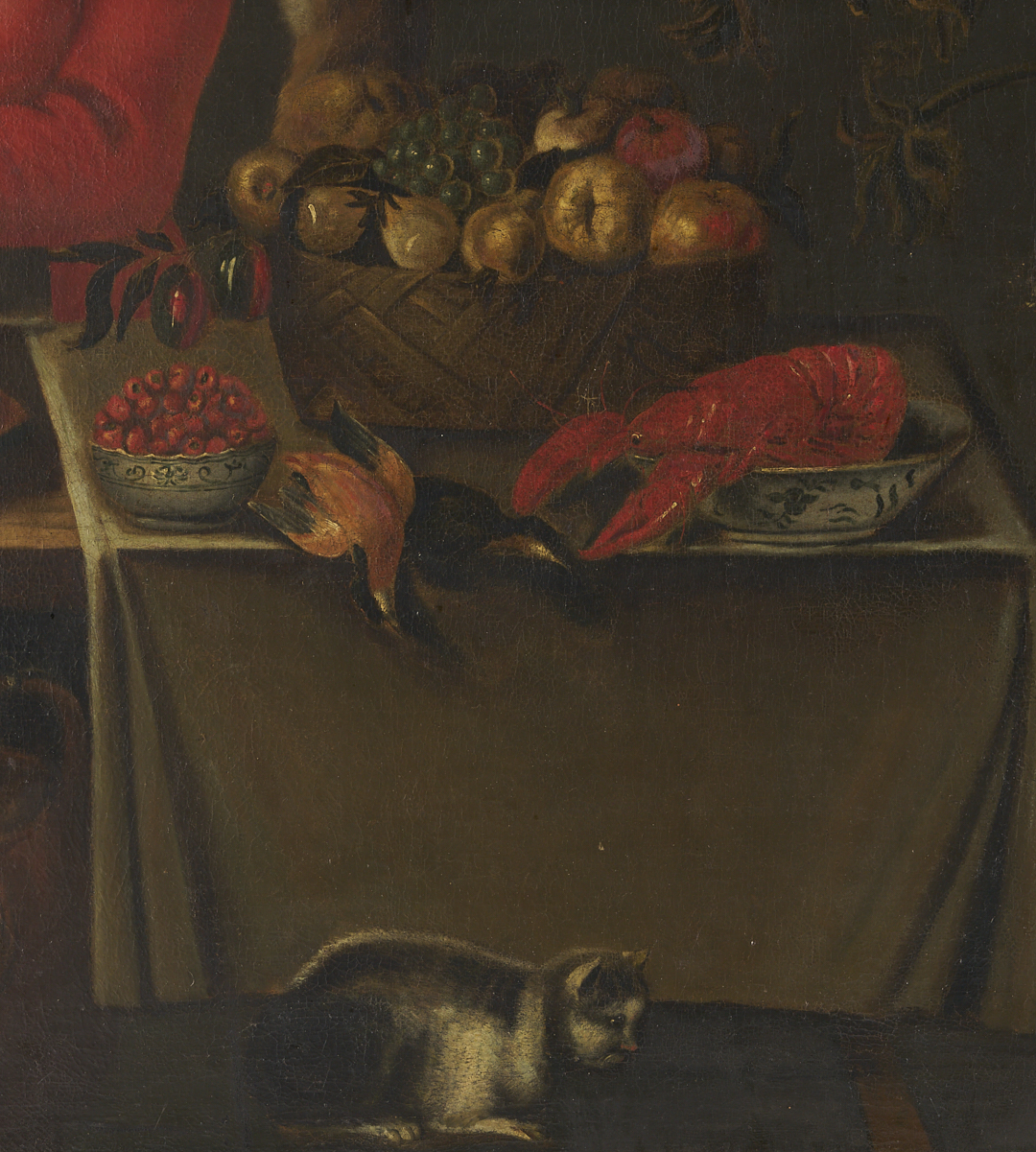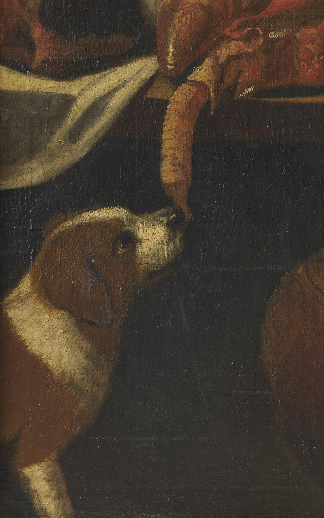 Large oil on canvas European kitchen interior genre painting, likely Dutch or German school. A woman stands behind a table and displays a butchered animal while a man who holds a basket filled with vegetables enters at right. Fruits and meats including a large lobster rest on the table and additional meats hang to either side of the woman. A dog investigates an intrail that hangs from the tabletop while a cat waits nearby. Housed in a painted and giltwood frame. Canvas: 43 1/2 in. H x 68 in. W. Framed: 48 in. H x 70 1/2 in. W. 18th century or earlier.