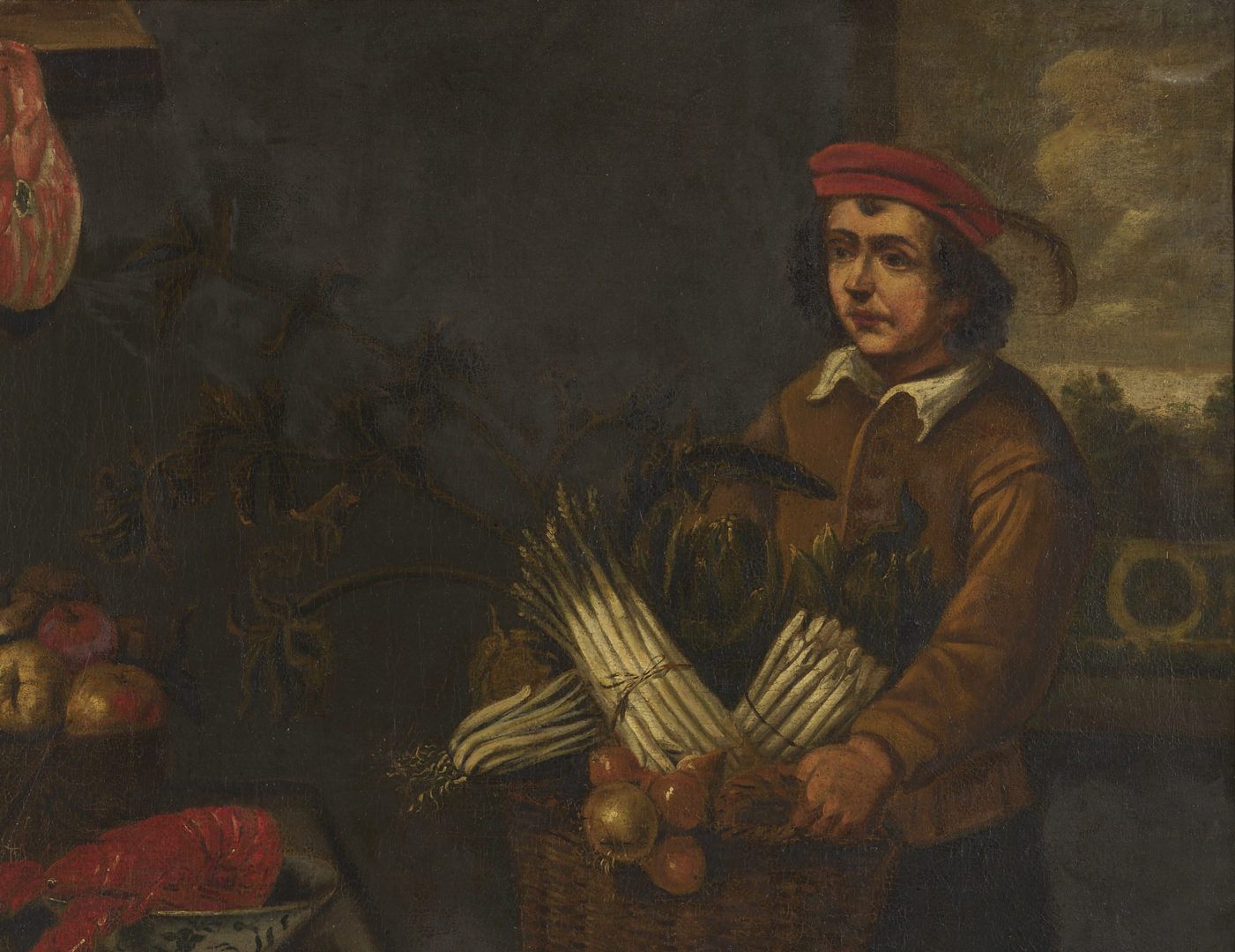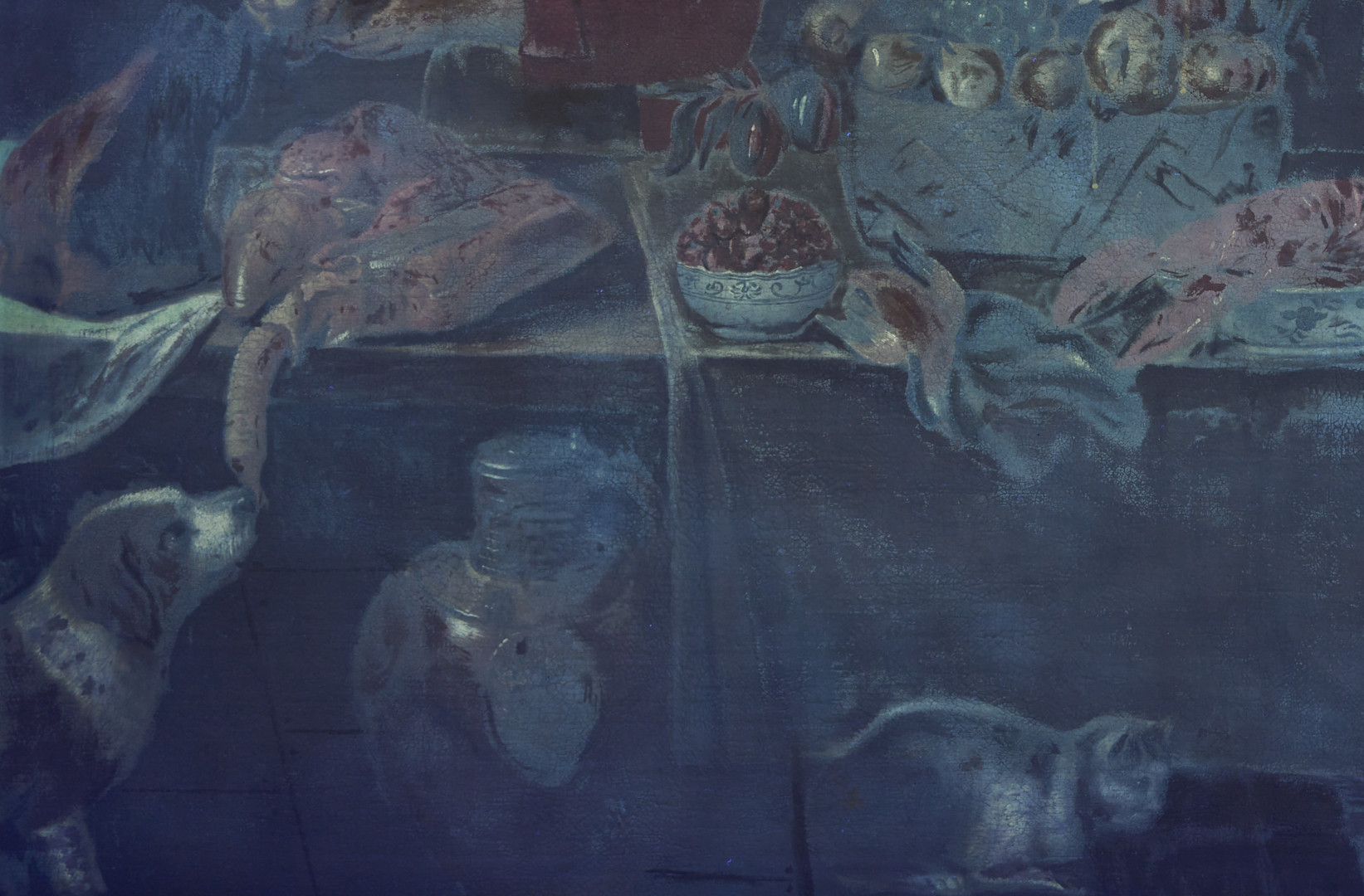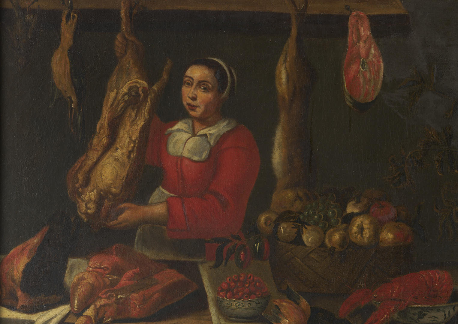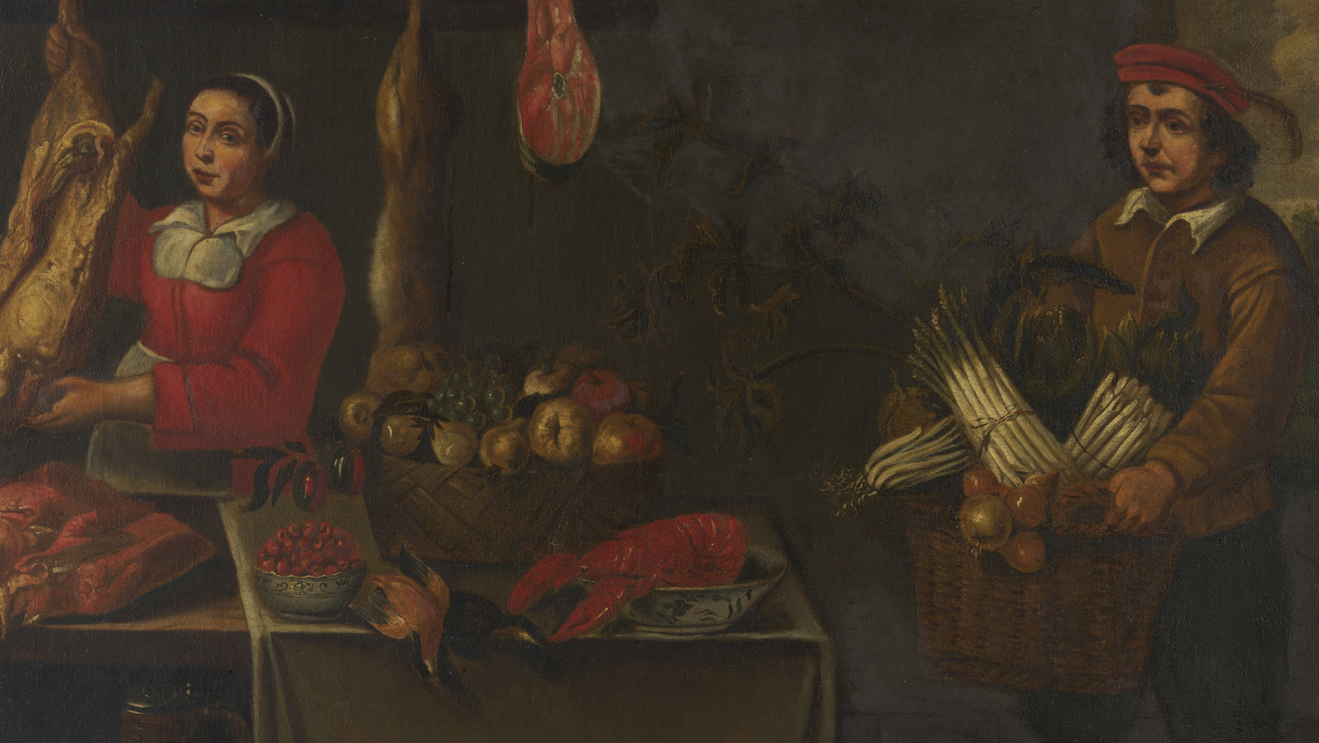 Large oil on canvas European kitchen interior genre painting, likely Dutch or German school. A woman stands behind a table and displays a butchered animal while a man who holds a basket filled with vegetables enters at right. Fruits and meats including a large lobster rest on the table and additional meats hang to either side of the woman. A dog investigates an intrail that hangs from the tabletop while a cat waits nearby. Housed in a painted and giltwood frame. Canvas: 43 1/2 in. H x 68 in. W. Framed: 48 in. H x 70 1/2 in. W. 18th century or earlier.