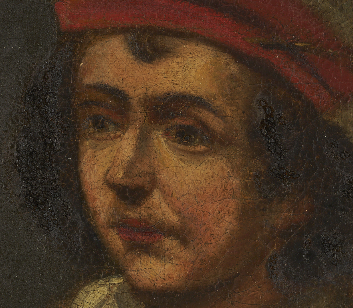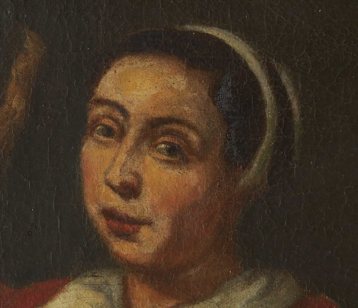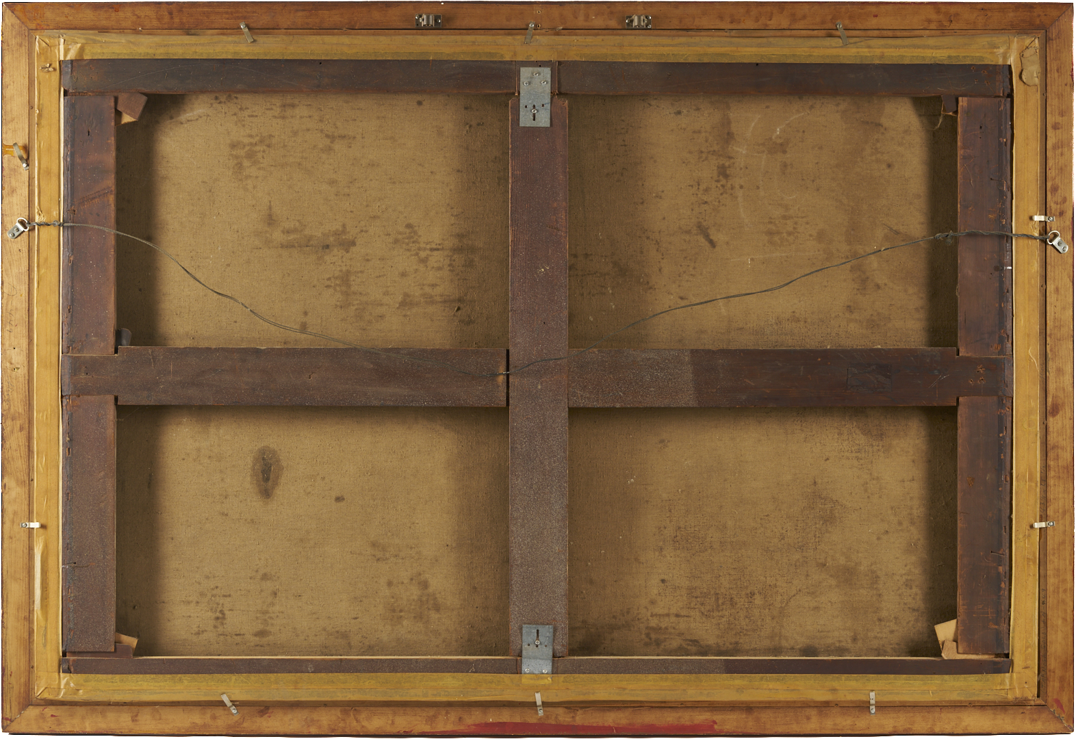 Canvas has been relined. Extensive retouching to background and floor, plus localized areas of retouching throughout including to faces. See U/V photography. With stable craquelure throughout.