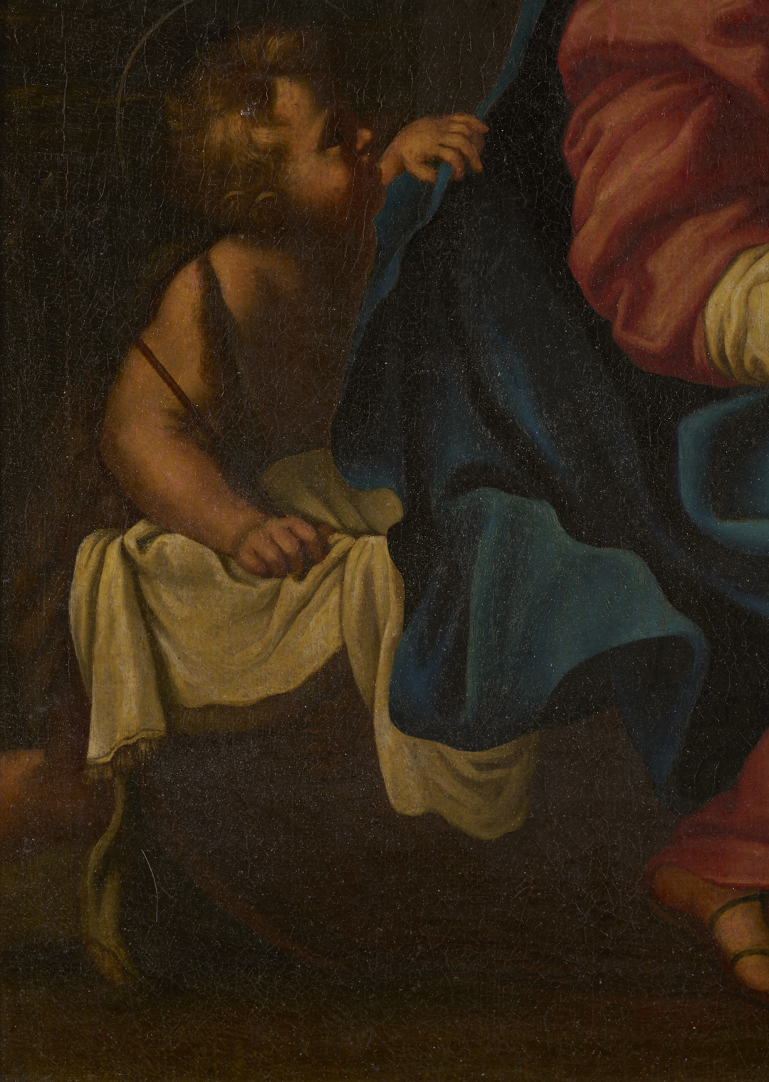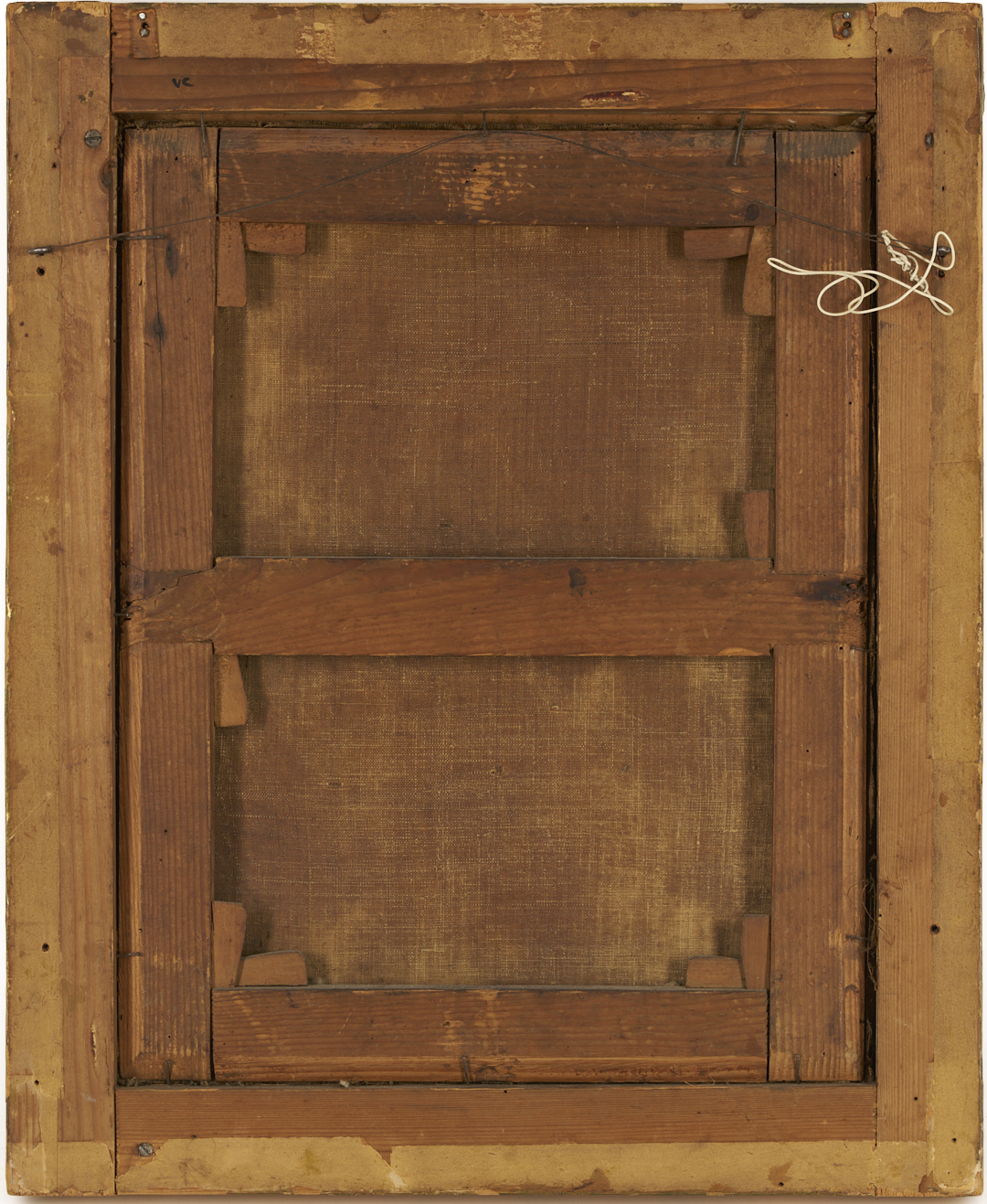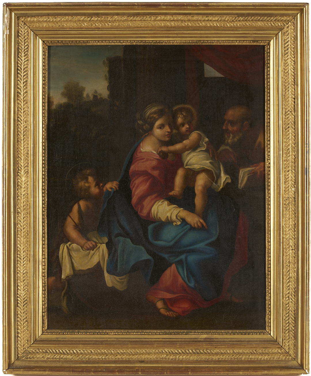Overall very good condition. UV light reveals some retouch to St. John’s shoulder, Mary’s face in shadows, and edges of Christ Child’s head. Old pea sized repair with retouch to background between Christ Child and Joseph. Some fine craquelure. Frame may not be original and has some scattered losses to gilding, especially at upper left corner edge.