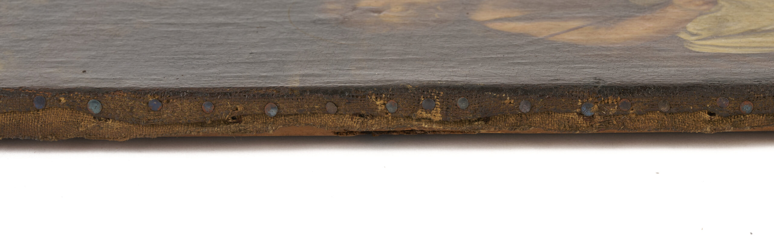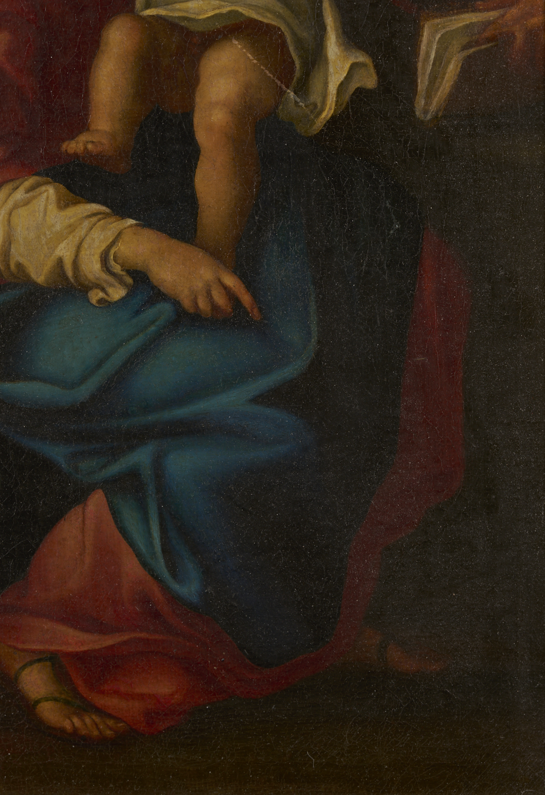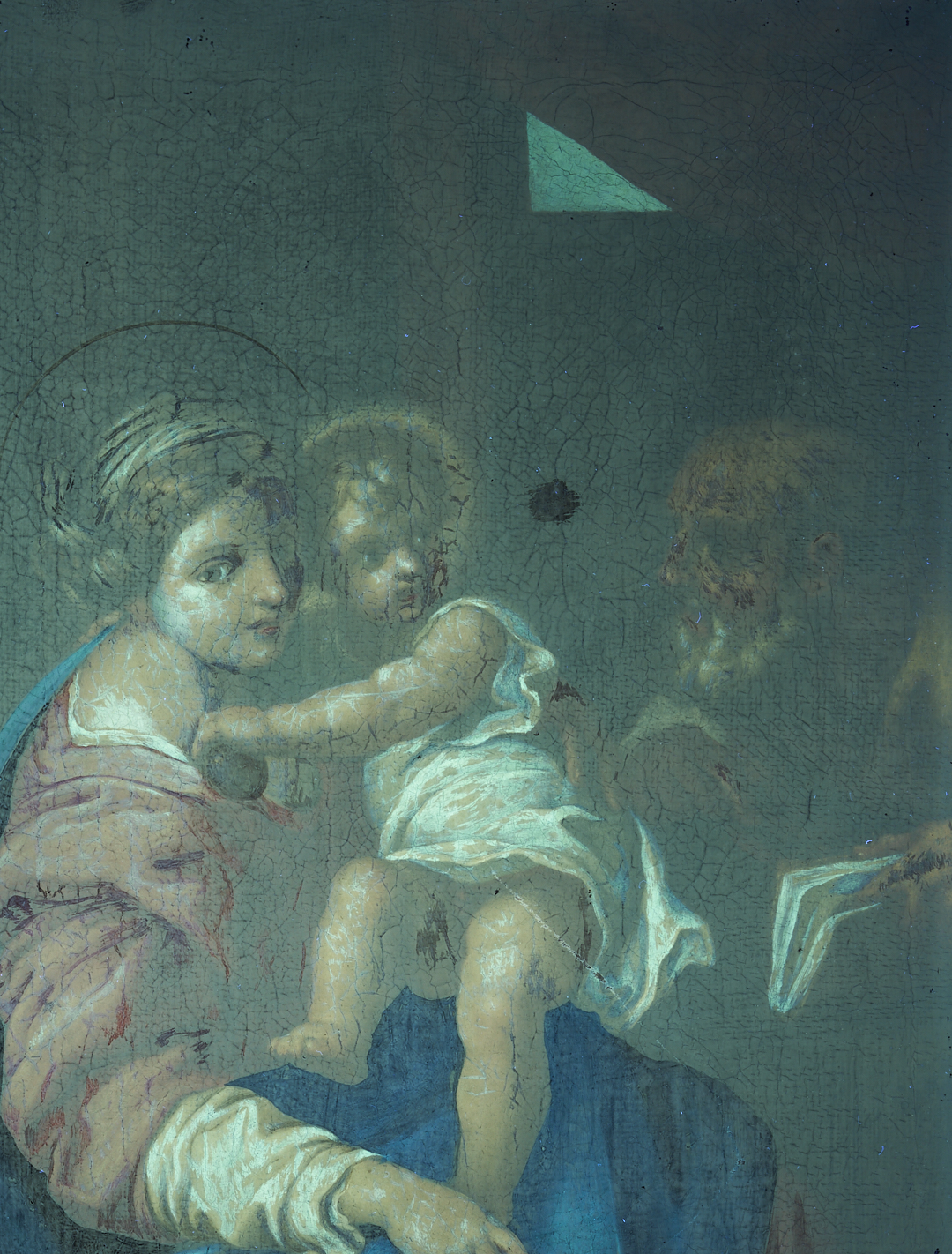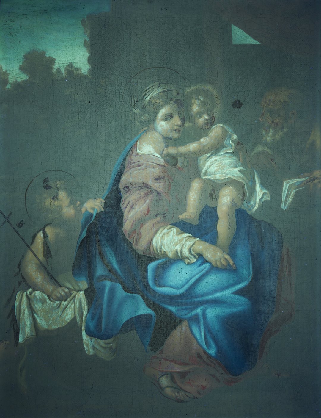 Overall very good condition. UV light reveals some retouch to St. John’s shoulder, Mary’s face in shadows, and edges of Christ Child’s head. Old pea sized repair with retouch to background between Christ Child and Joseph. Some fine craquelure. Frame may not be original and has some scattered losses to gilding, especially at upper left corner edge.
