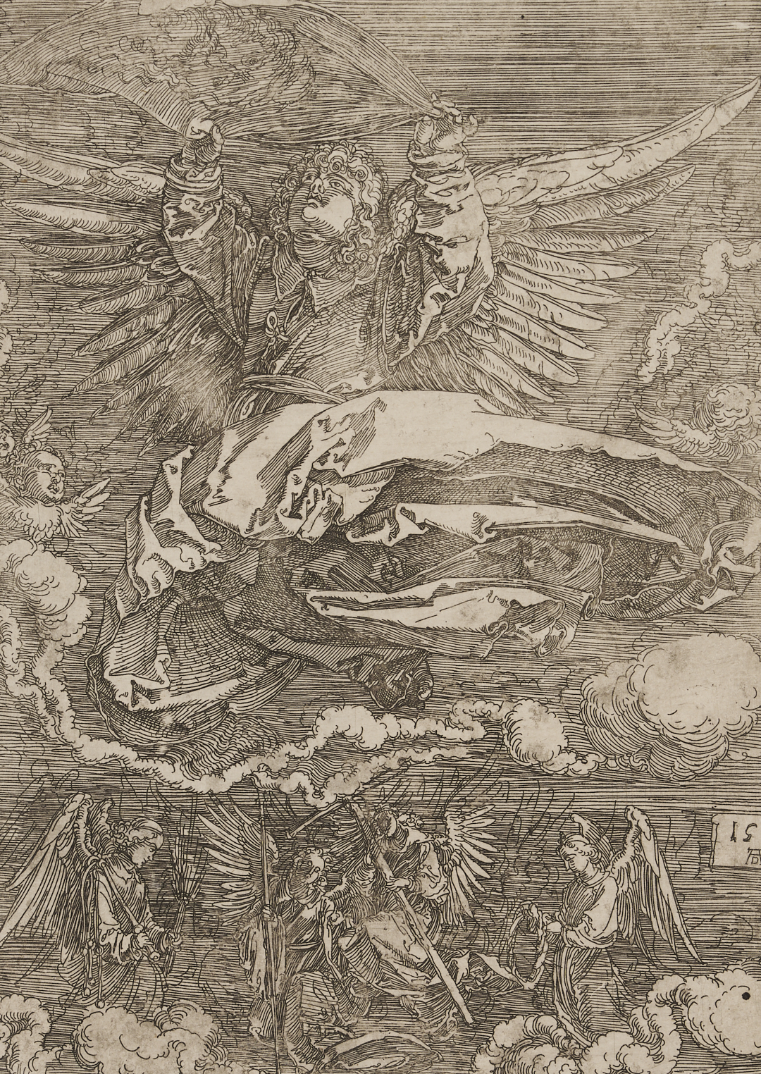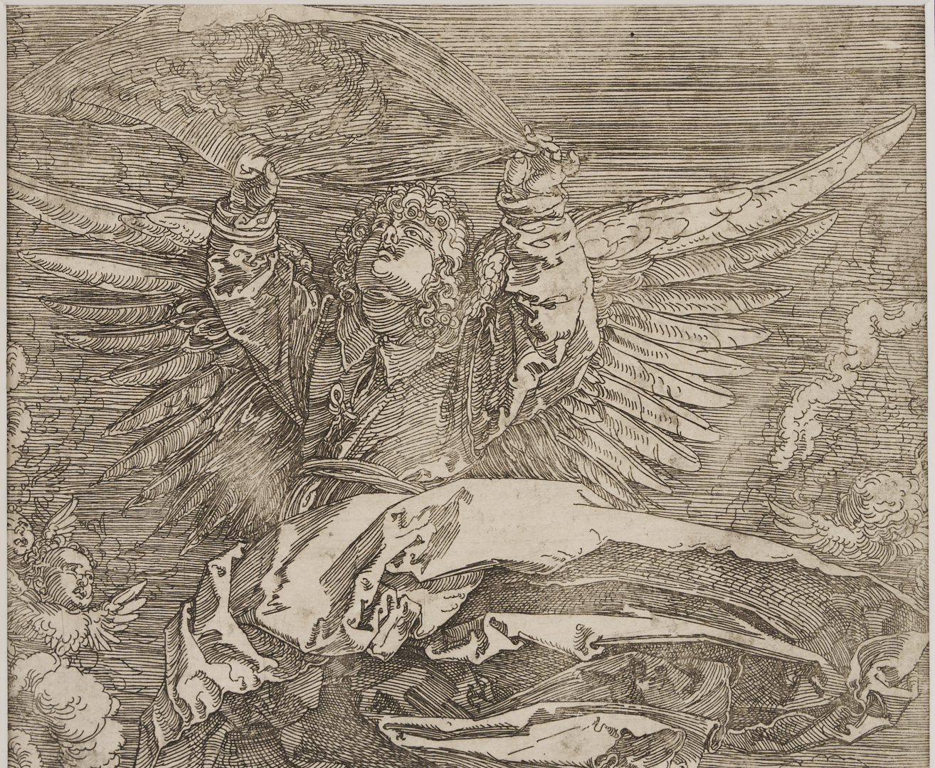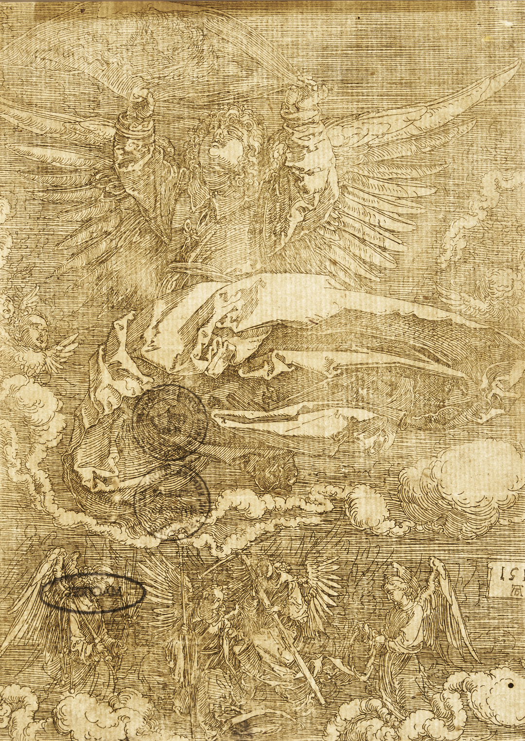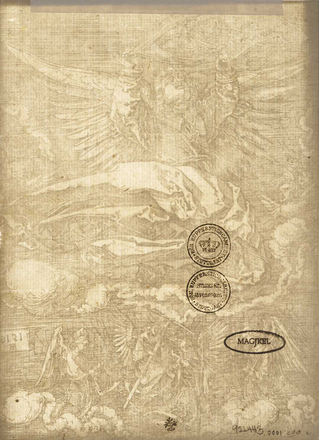 Albrecht Durer (German, 1471-1528) iron etching on laid paper, “The Sudarium Held by One Angel,” 1516. A Meder Ic-II impression, already with faint rust marks but still with vertical scratches to angel’s right wing and to lower right, from cloud to monogram. With two 19th or very early 20th c. Koninglich Kupferstichkabinett, Stuttgart, collector’s marks (Lugt 2323 and 2324) plus two unknown collector’s marks: a flaming cross (Lugt 2910) and “Magjkel” stamp (not in Lugt). Illegible pencil inscription, likely another unidentified collector’s mark (initials), to verso. Housed in a cream window mat with black reveal and recto and verso openings. Ref.: Bartsch 26; Meder, Hollstein 27. Sheet: 7 1/4 in. H x 5 5/16 in. W. Mat: 14 in. H x 12 in. W.
