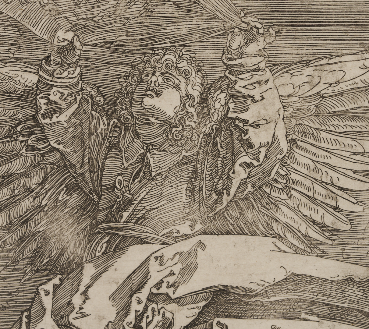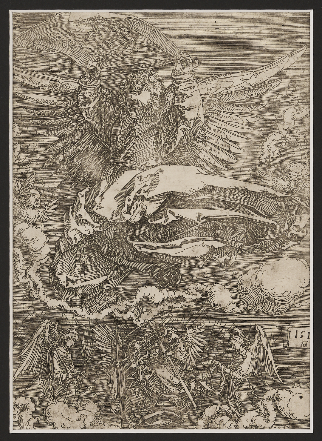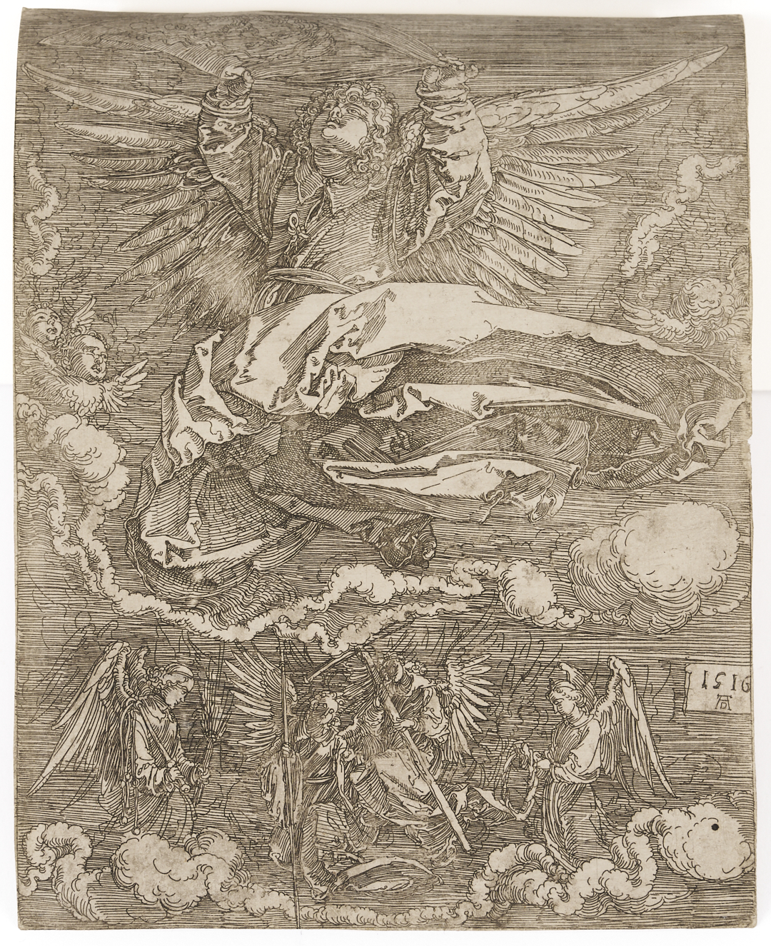 Albrecht Durer (German, 1471-1528) iron etching on laid paper, “The Sudarium Held by One Angel,” 1516. A Meder Ic-II impression, already with faint rust marks but still with vertical scratches to angel’s right wing and to lower right, from cloud to monogram. With two 19th or very early 20th c. Koninglich Kupferstichkabinett, Stuttgart, collector’s marks (Lugt 2323 and 2324) plus two unknown collector’s marks: a flaming cross (Lugt 2910) and “Magjkel” stamp (not in Lugt). Illegible pencil inscription, likely another unidentified collector’s mark (initials), to verso. Housed in a cream window mat with black reveal and recto and verso openings. Ref.: Bartsch 26; Meder, Hollstein 27. Sheet: 7 1/4 in. H x 5 5/16 in. W. Mat: 14 in. H x 12 in. W.