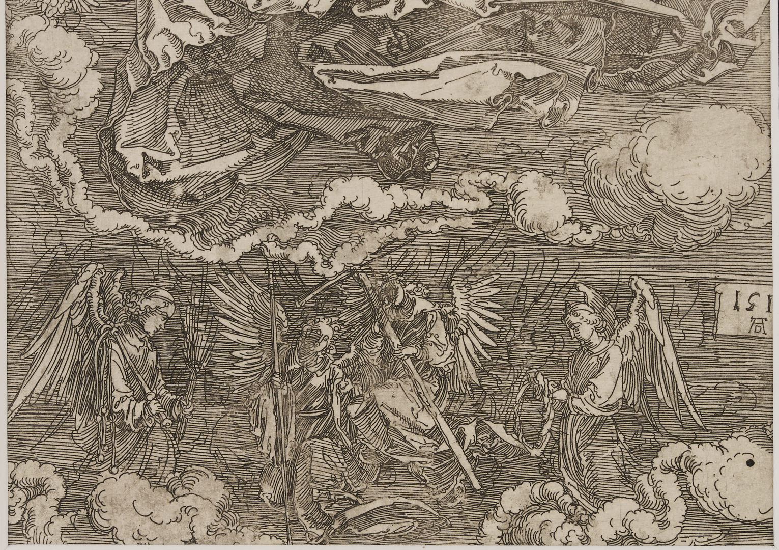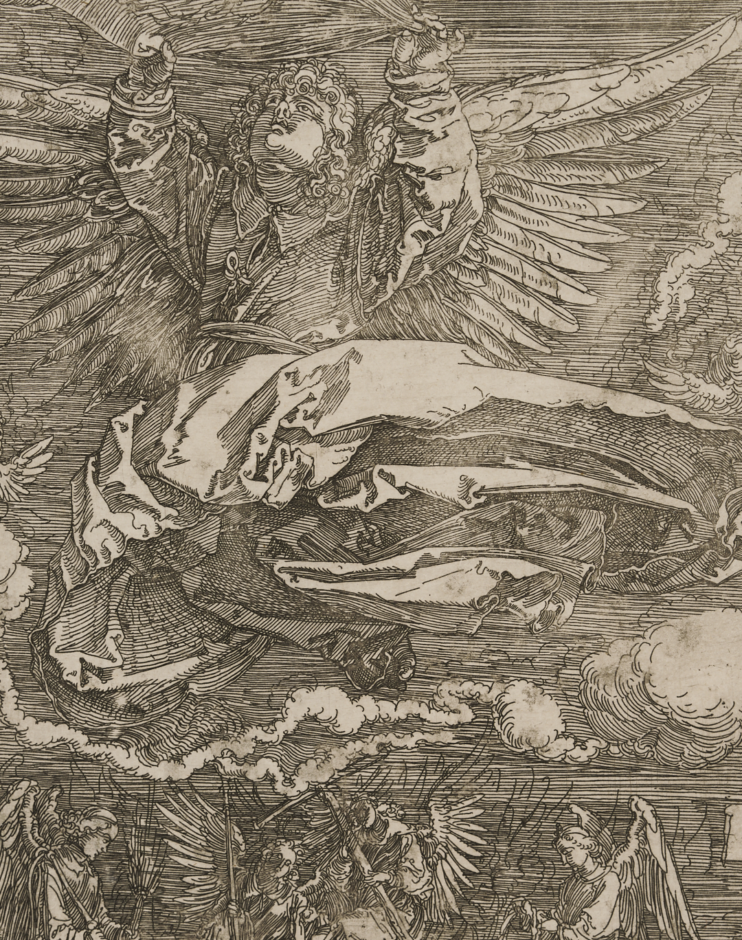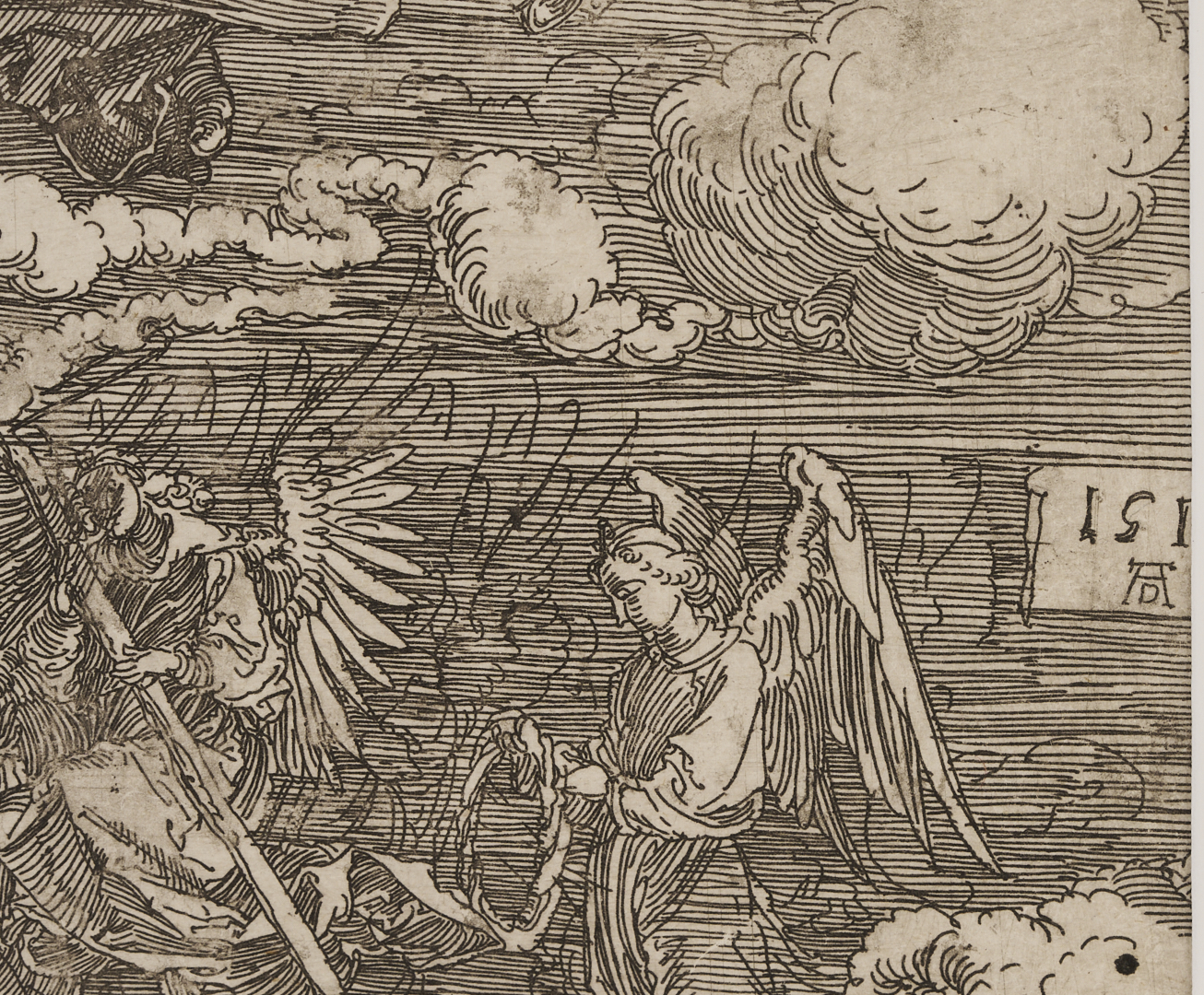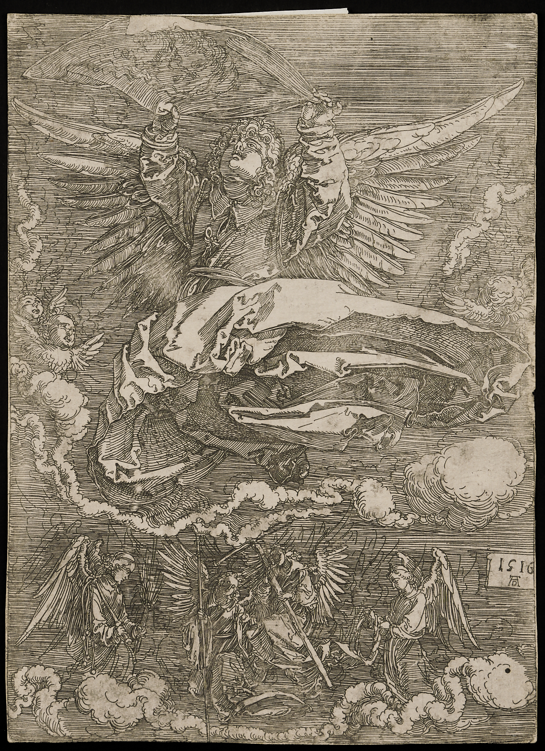Albrecht Durer (German, 1471-1528) iron etching on laid paper, “The Sudarium Held by One Angel,” 1516. A Meder Ic-II impression, already with faint rust marks but still with vertical scratches to angel’s right wing and to lower right, from cloud to monogram. With two 19th or very early 20th c. Koninglich Kupferstichkabinett, Stuttgart, collector’s marks (Lugt 2323 and 2324) plus two unknown collector’s marks: a flaming cross (Lugt 2910) and “Magjkel” stamp (not in Lugt). Illegible pencil inscription, likely another unidentified collector’s mark (initials), to verso. Housed in a cream window mat with black reveal and recto and verso openings. Ref.: Bartsch 26; Meder, Hollstein 27. Sheet: 7 1/4 in. H x 5 5/16 in. W. Mat: 14 in. H x 12 in. W.