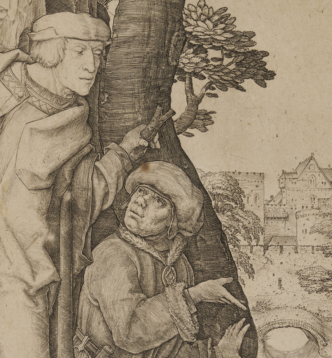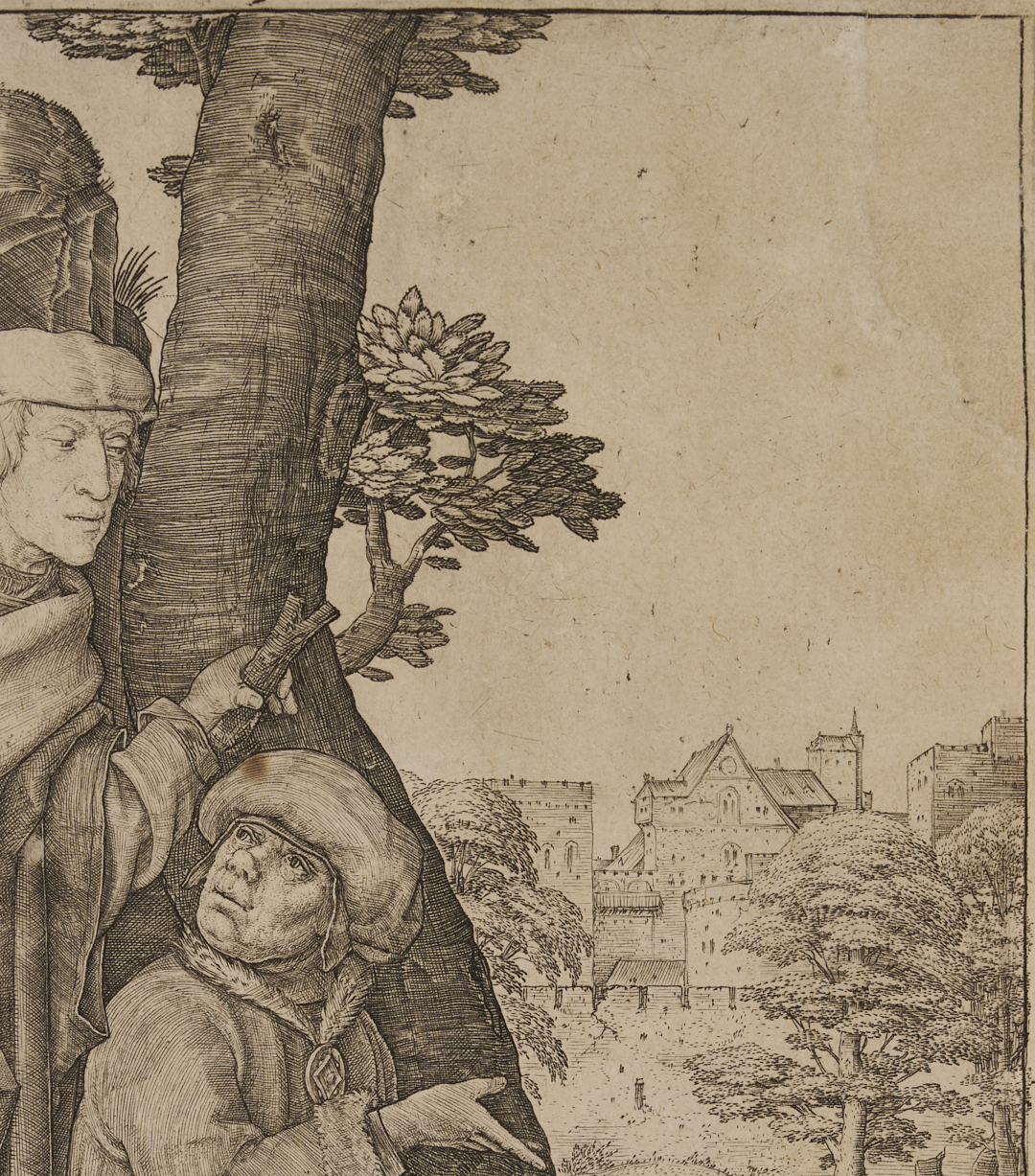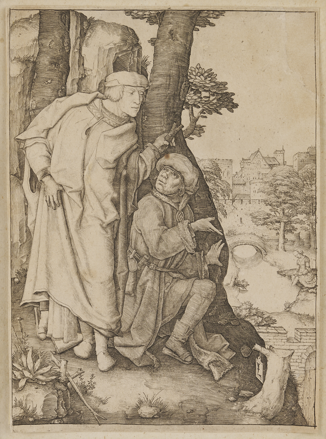 A very good, dark, and evenly inked early impression with strong contrasts. Sheet is hinge mounted with archival tape affixed to upper edge en verso. Repaired tears to sky in upper right corner, approximately two inches, and to gate and hillside at lower right, primarily visible en verso, also approximately two inches. A spot of foxing to hat of kneeling elder. Remains of old hinges affixed to verso along left edge.