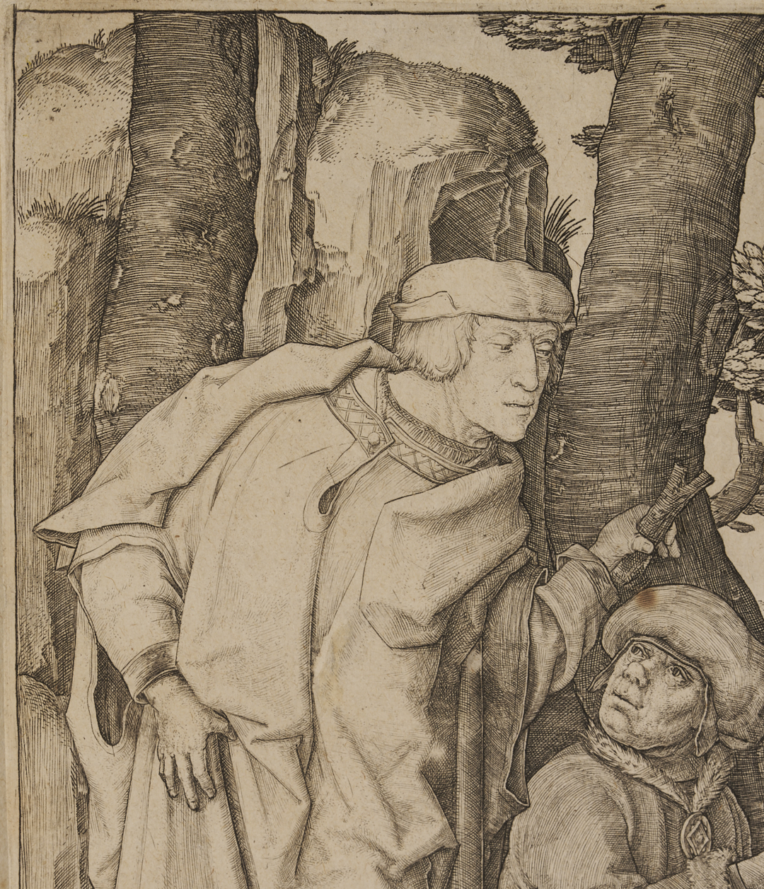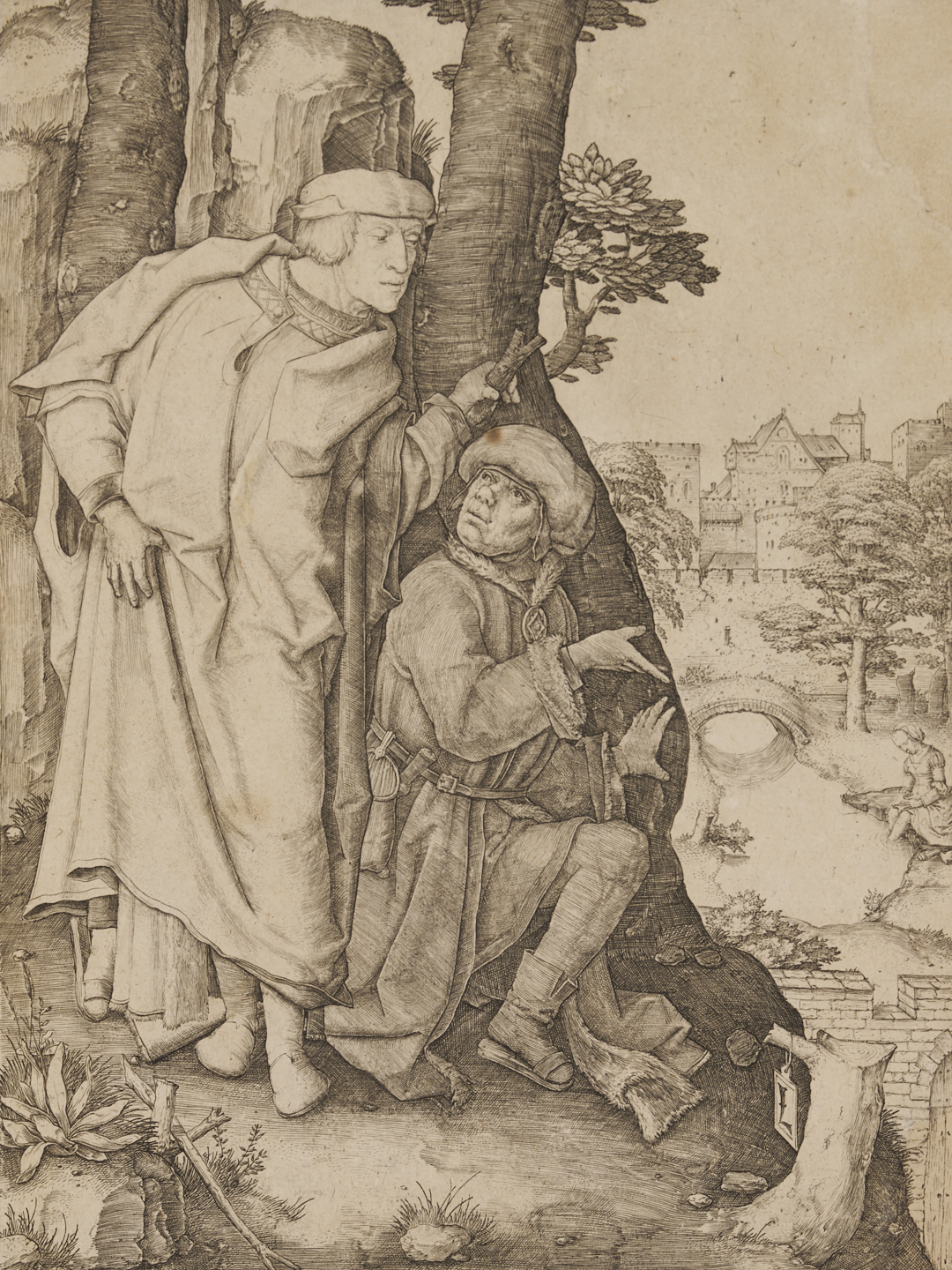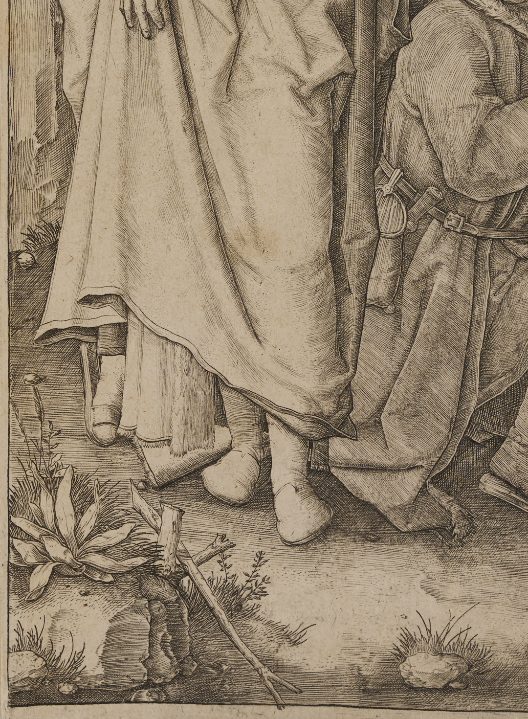 A very good, dark, and evenly inked early impression with strong contrasts. Sheet is hinge mounted with archival tape affixed to upper edge en verso. Repaired tears to sky in upper right corner, approximately two inches, and to gate and hillside at lower right, primarily visible en verso, also approximately two inches. A spot of foxing to hat of kneeling elder. Remains of old hinges affixed to verso along left edge.