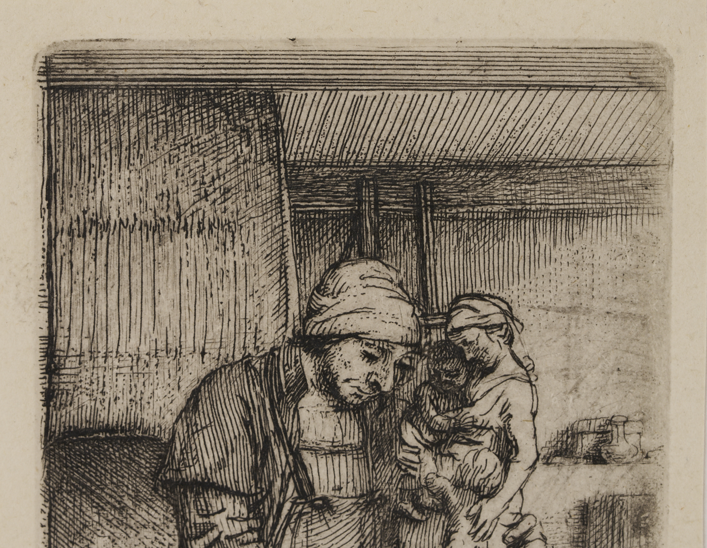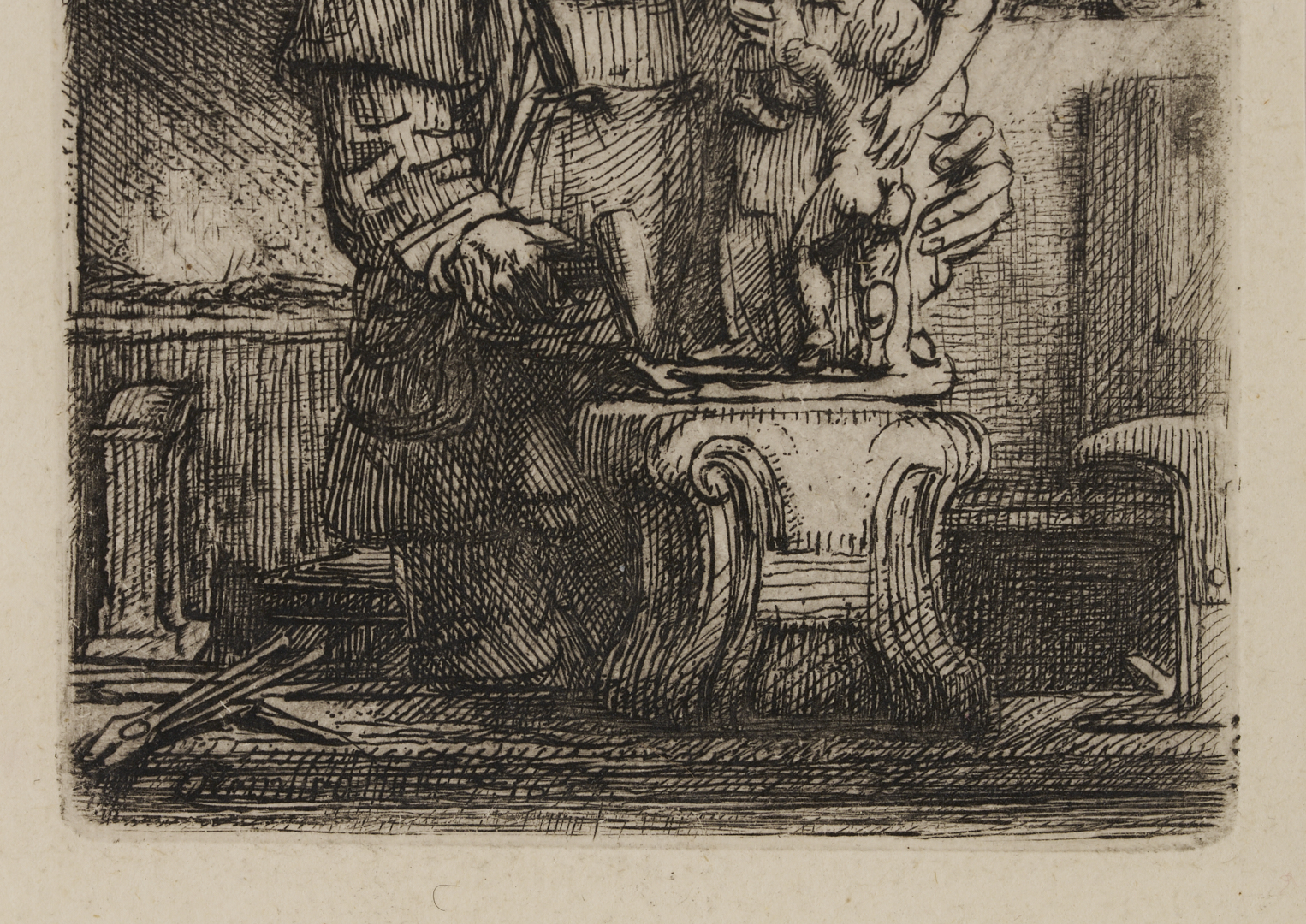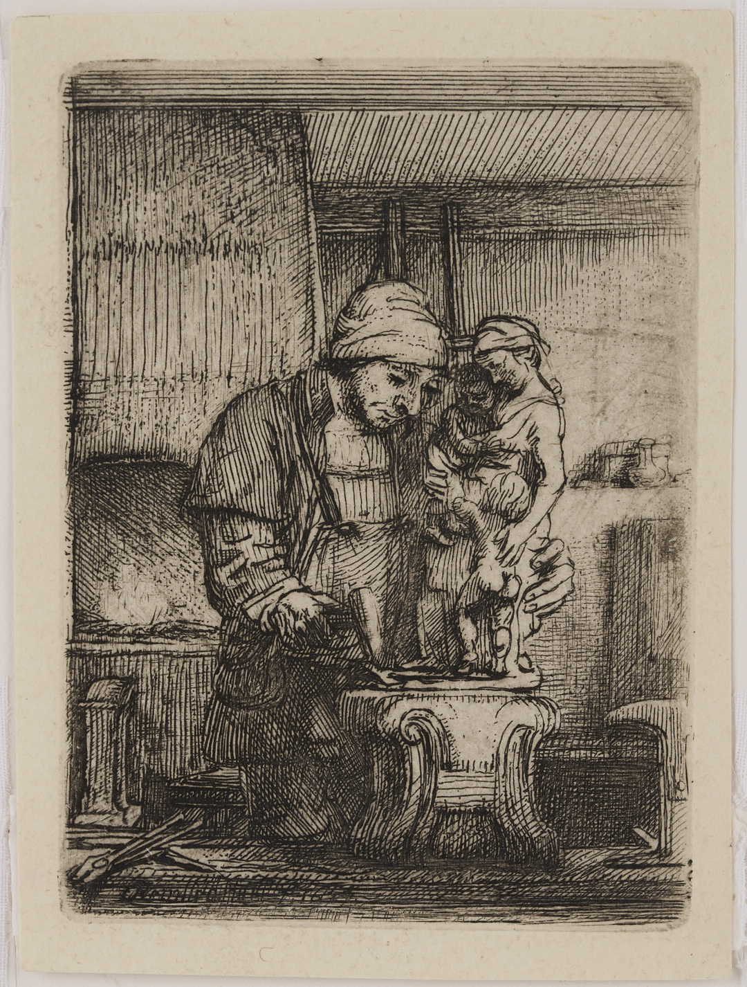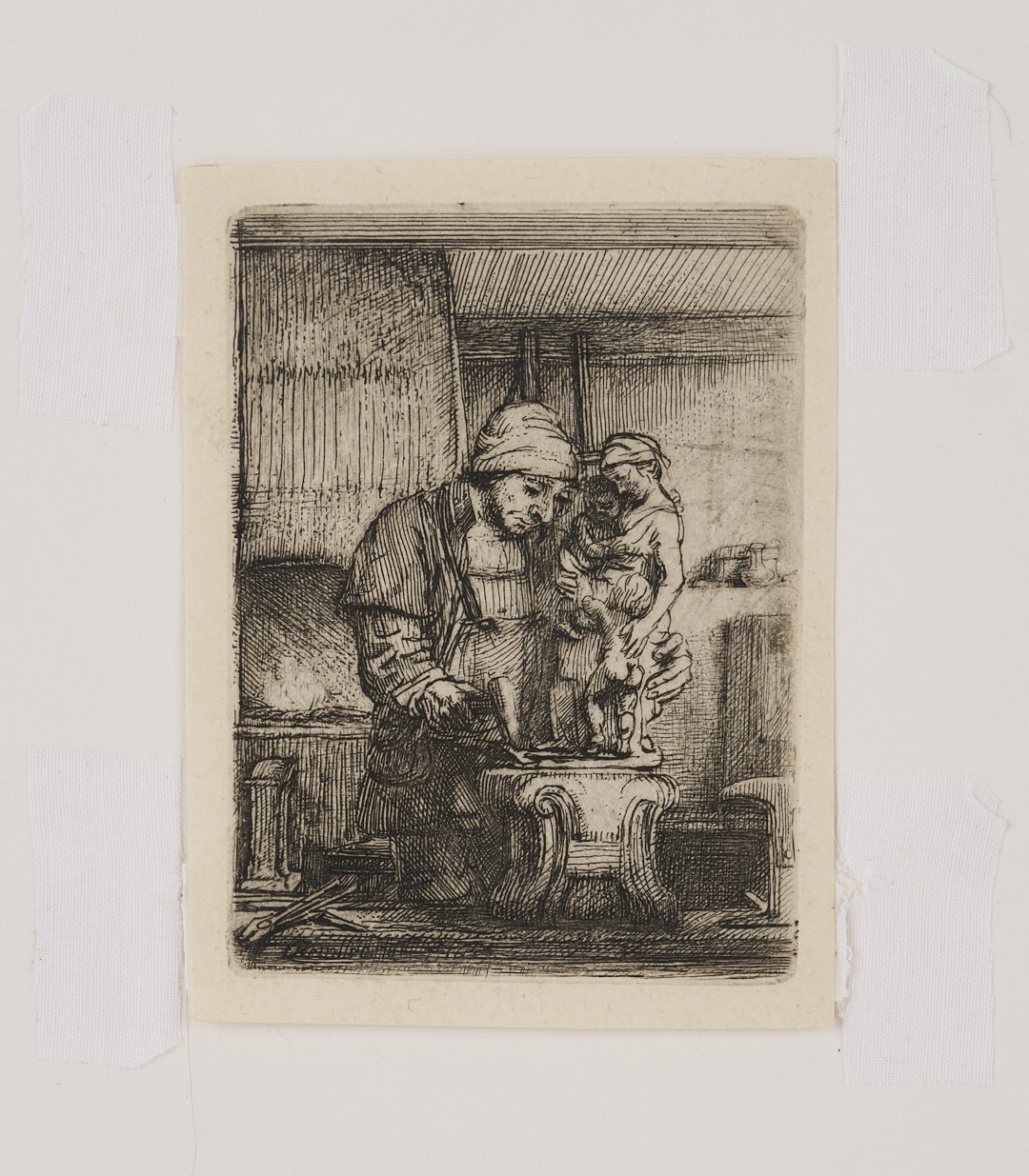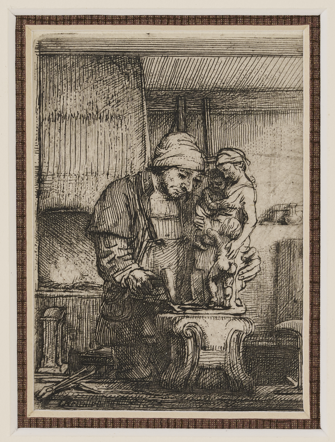 Rembrandt van Rijn (Dutch, 1606-1669) etching and drypoint on laid paper that depicts a goldsmith at work on a “caritas” figural group which consists of a woman and two children, c. 1655. The artist gently holds the sculpture with his left hand as he works with a hammer held in his right hand. A furnace glows behind him at left. An early second state impression, before the disappearance of the vertical drypoint lines to the lower beam at upper right. Signed and dated in plate, lower left. Inscribed “B123,” “391973” and “8072,” and “000[?]” in pencil to verso. New Hollstein’s second state of two; Usticke’s second state of three. Housed in a cream window mat with brown and gold reveal. Sheet: 3 5/16 in. H x 2 1/2 in. W. Plate: 2 15/16 in. H x 2 3/16 in. W. Mat: 15 in. H x 14 1/8 in. W. Ref: Bartsch 123, Hollstein (White and Boon), 285; Hind 285; Biorklund 55-D; New Hollstein 289.