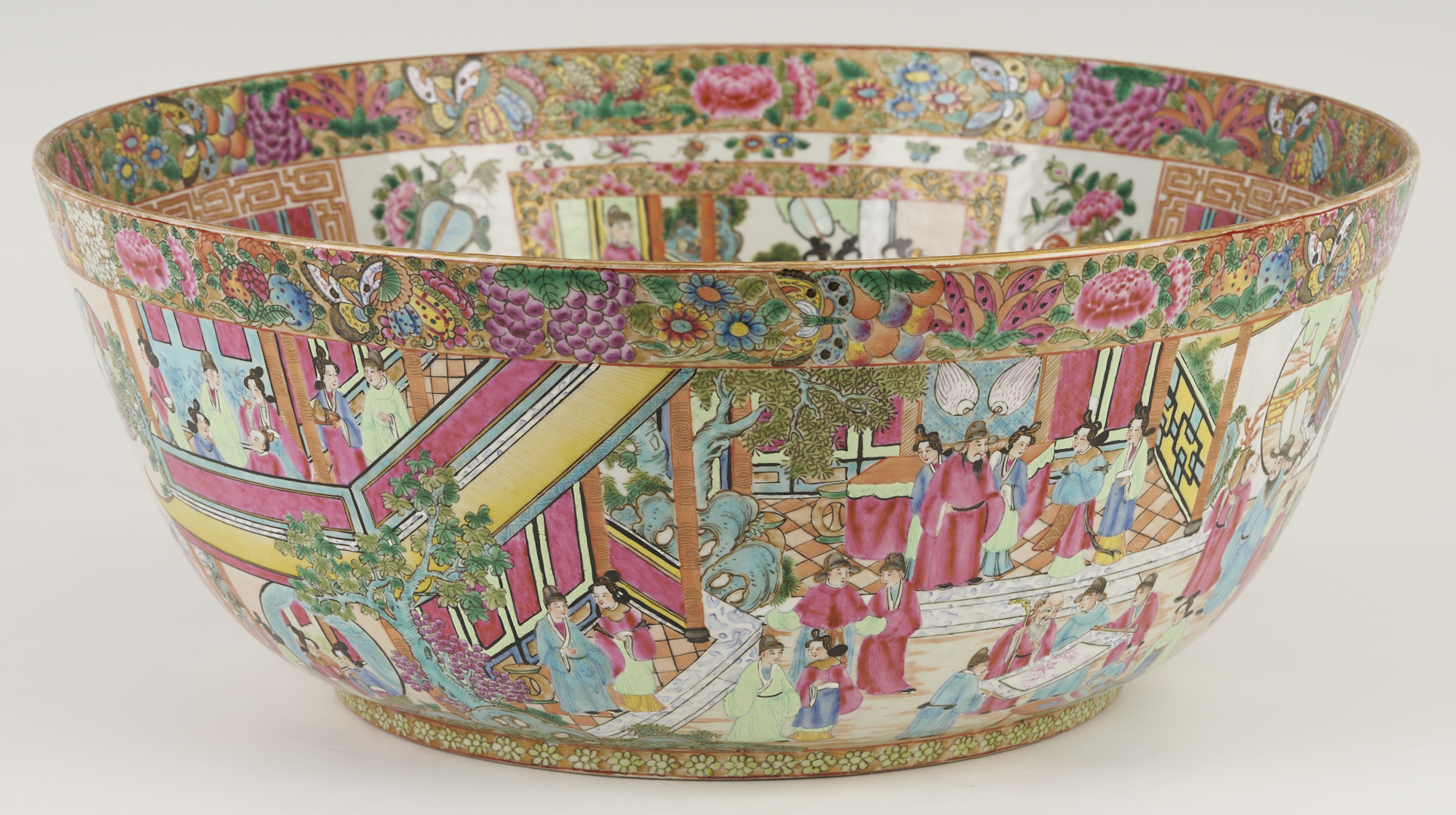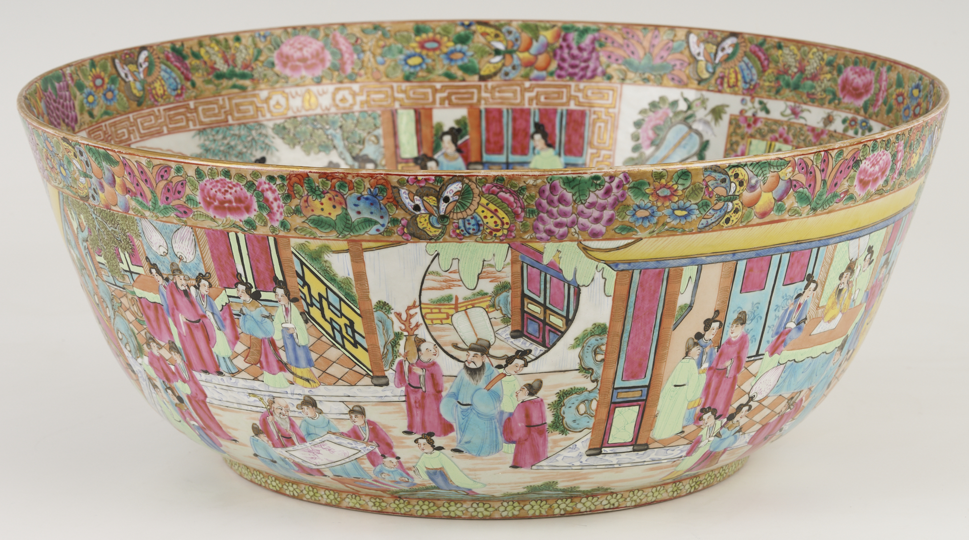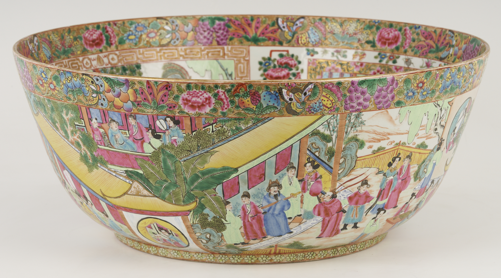 A substantial Chinese Export Rose Mandarin punch bowl, polychrome and parcel gilt decoration throughout, the interior with four cartouches, depicting various figures engaging in activities in an outdoor setting, gilt fretwork surrounds and a central interior scene, and the exterior with a continuous outdoor setting depicting figures engaging in various activities and structures, both with a wide border at the top with flowers, fruit, and insects. 18 in. dia. x 7 1/4 in. H. 19th century.