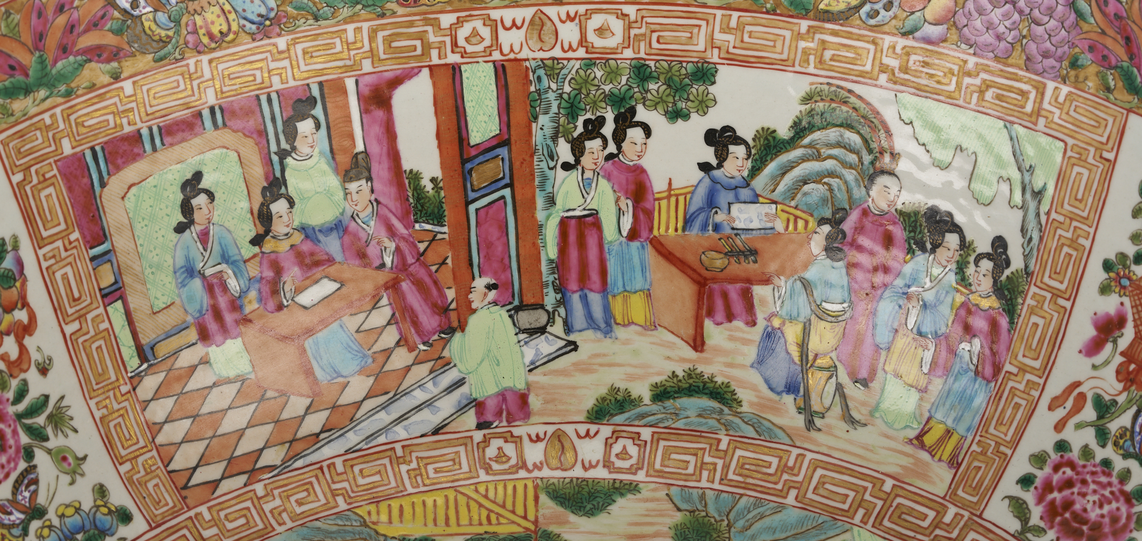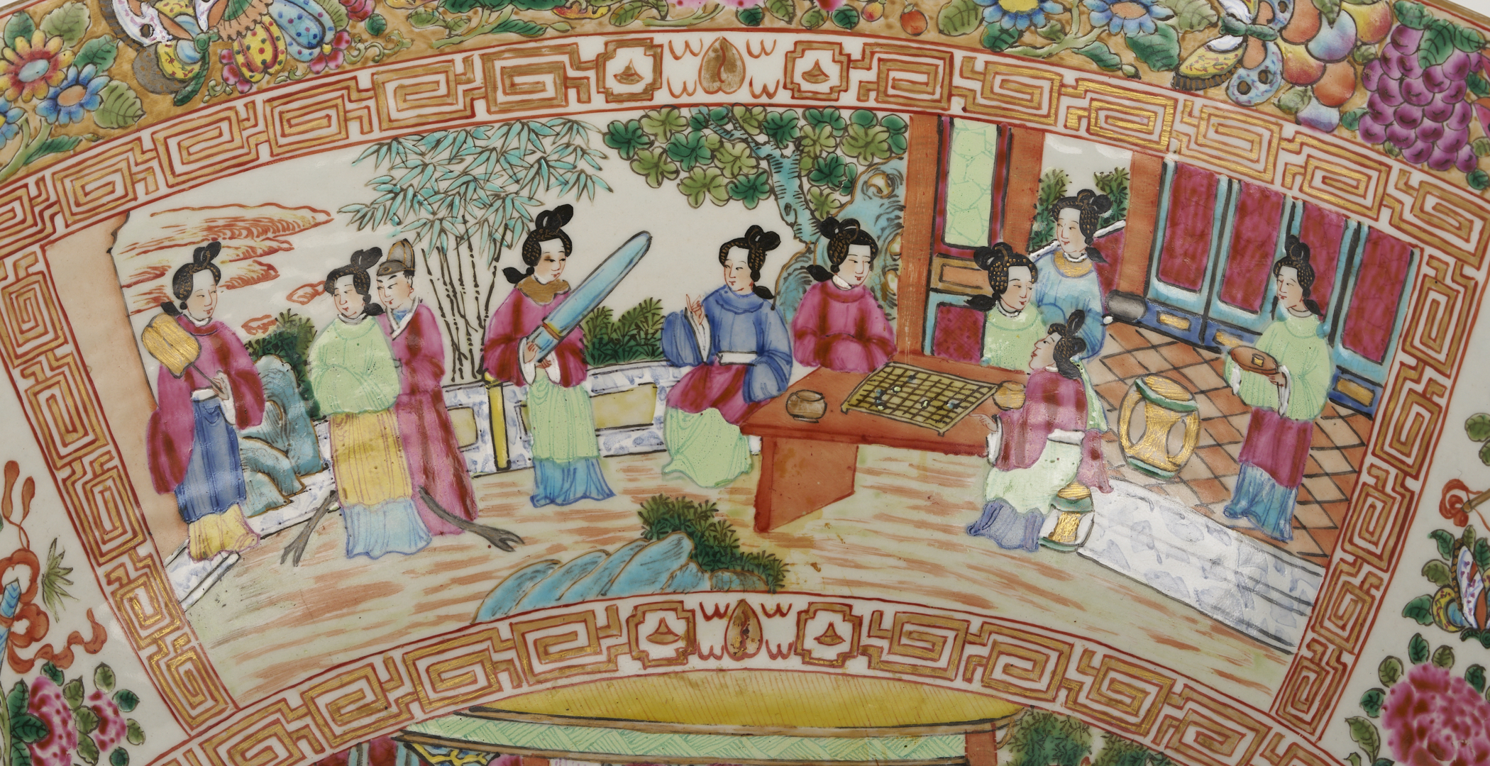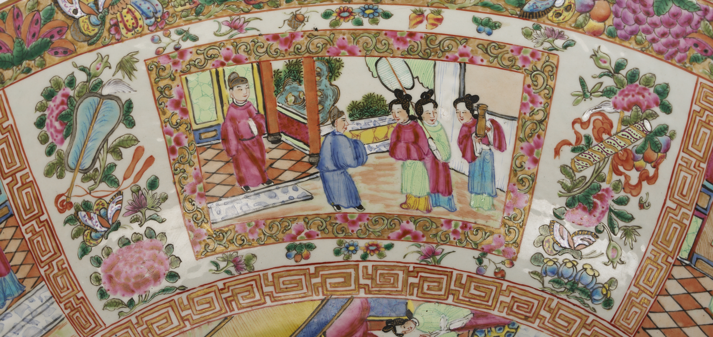 A substantial Chinese Export Rose Mandarin punch bowl, polychrome and parcel gilt decoration throughout, the interior with four cartouches, depicting various figures engaging in activities in an outdoor setting, gilt fretwork surrounds and a central interior scene, and the exterior with a continuous outdoor setting depicting figures engaging in various activities and structures, both with a wide border at the top with flowers, fruit, and insects. 18 in. dia. x 7 1/4 in. H. 19th century.