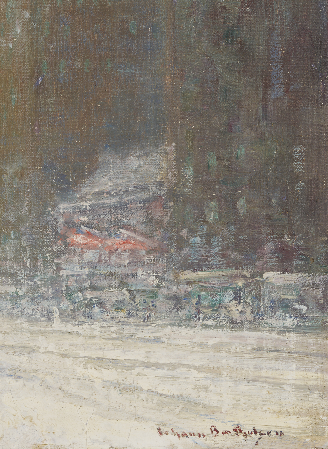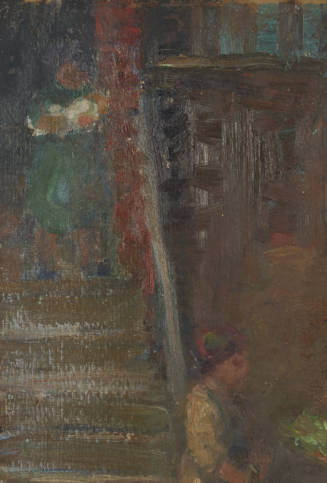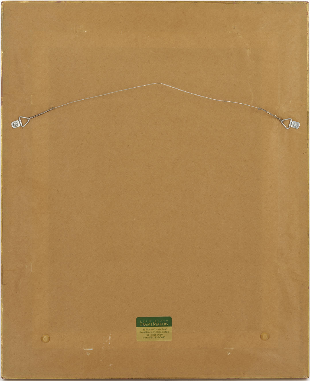 Both items in overall very good condition. Both professionally conserved by James Swope Fine Arts Conservation, West Palm Beach, FL, in 2002. 1st item with scattered retouching primarily to buildings at left and right and to foreground snow. Largest areas to center right, in building, 2 1/4 inch x 1/4 inch, and to snow, lower center edge, 1 inch x 3/4 inch. See UV photography. Fine cracks to snow along lower edge. Liner with staining specks along lower edge. 2nd item with minor, scattered retouching primarily to upper left corner, in doorway behind figure. More extensive inpainting or retouching to upper and lower edges, likely to unfinished areas and/or areas with abrasions and loss as a result of the canvas having been folded around the board. See UV photography.