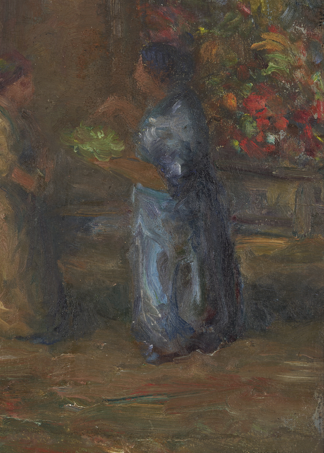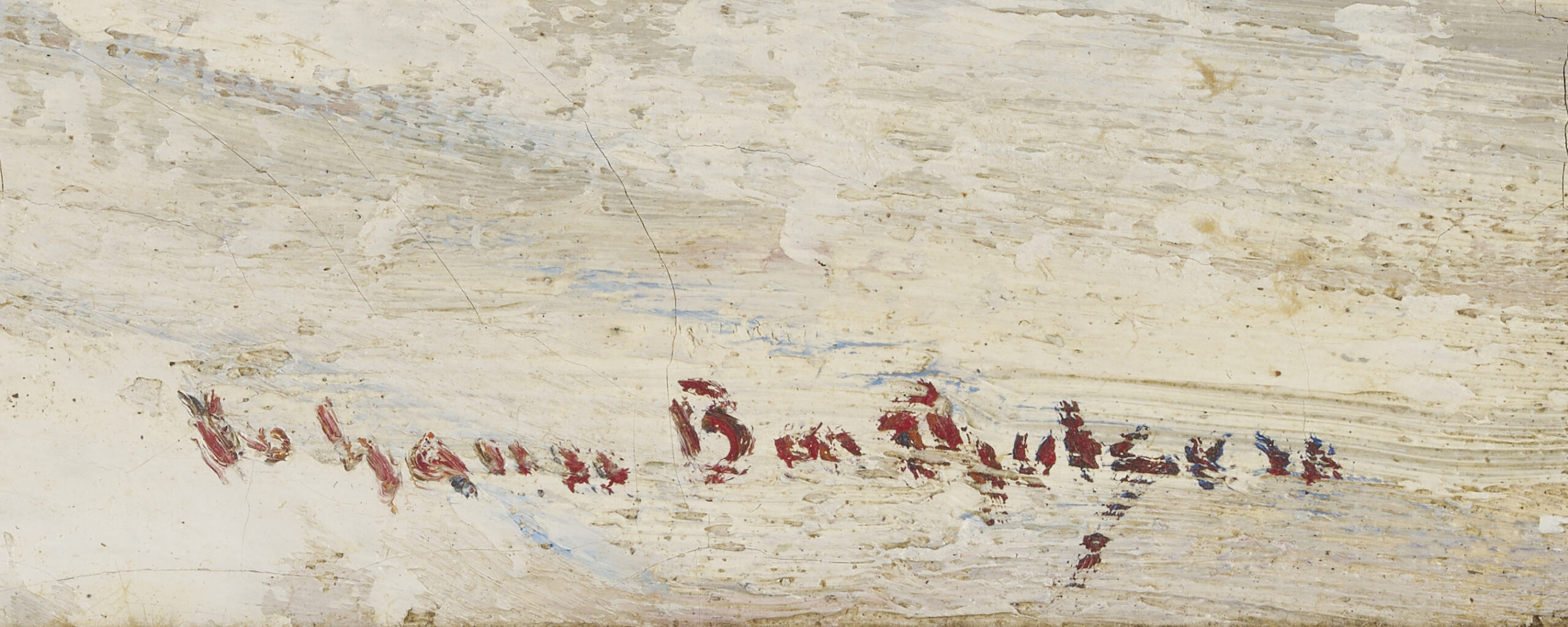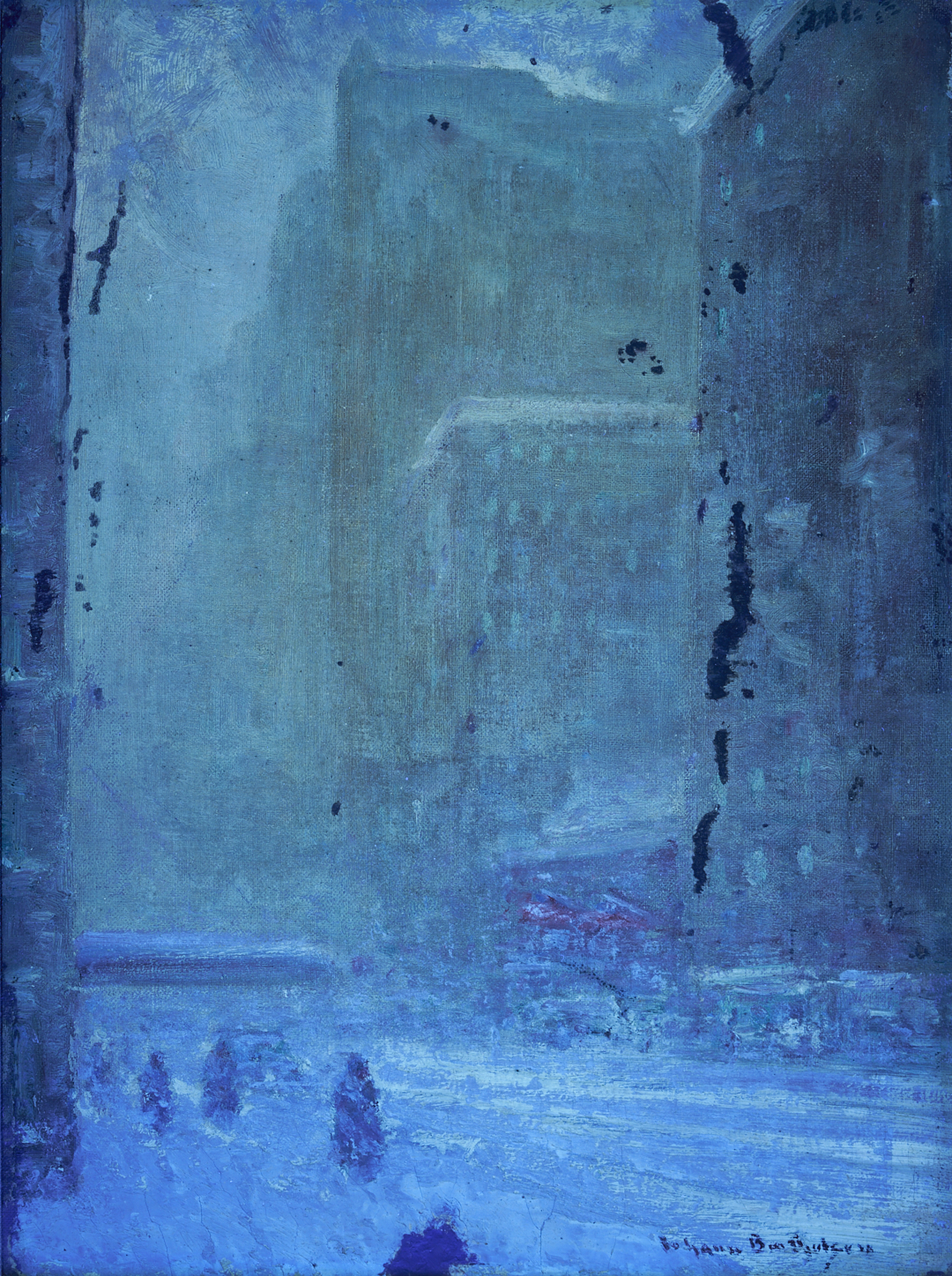 Both items in overall very good condition. Both professionally conserved by James Swope Fine Arts Conservation, West Palm Beach, FL, in 2002. 1st item with scattered retouching primarily to buildings at left and right and to foreground snow. Largest areas to center right, in building, 2 1/4 inch x 1/4 inch, and to snow, lower center edge, 1 inch x 3/4 inch. See UV photography. Fine cracks to snow along lower edge. Liner with staining specks along lower edge. 2nd item with minor, scattered retouching primarily to upper left corner, in doorway behind figure. More extensive inpainting or retouching to upper and lower edges, likely to unfinished areas and/or areas with abrasions and loss as a result of the canvas having been folded around the board. See UV photography.