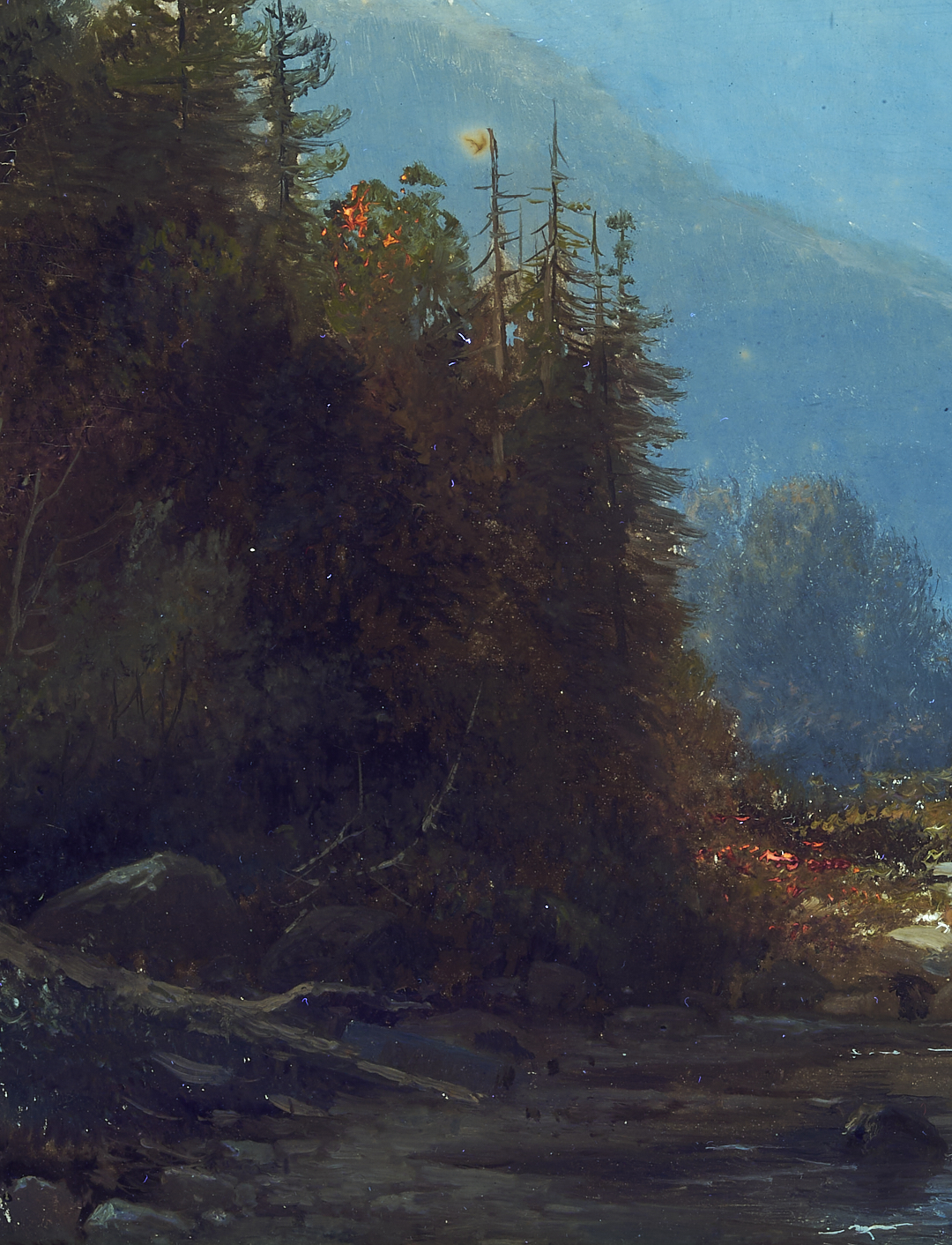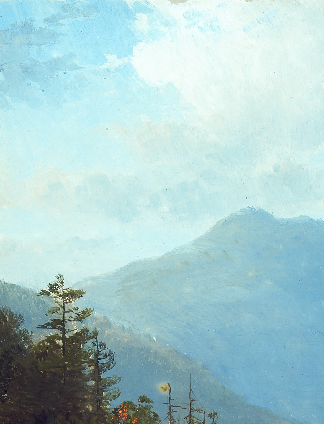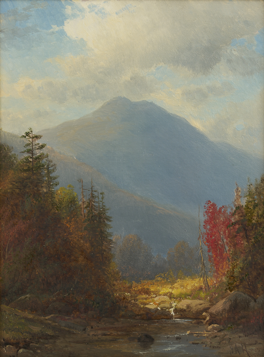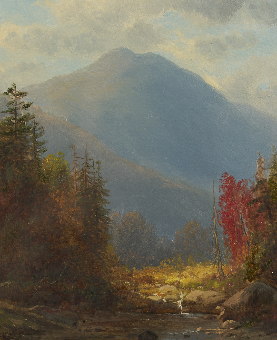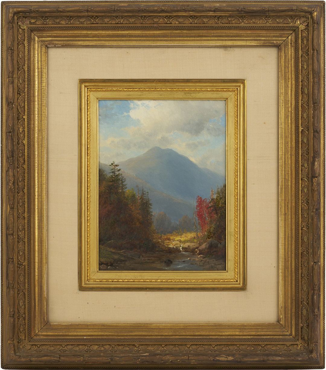 Joseph Antonio Hekking (American, 1830-1903), oil on board mountain landscape painting, likely depicting the Adirondacks or White Mountains. The scene features a stream in the foreground, bordered by trees with Fall foliage, rocks, and mountains in the background, all beneath a blue, cloud-filled sky. Initialed lower right J A H. Housed under glass in a period gilt wood and gesso frame with linen mat. Sight: 8 3/4 in. H x 6 3/4 in. W. Framed: 19 1/2 in. H x 17 in. W. Biography: Joseph Antonio Hekking was born the Netherlands and emigrated to New York with his parents as a child. He was associated with the painters of the Hudson River School throughout his life. Hekking began exhibiting landscapes in New York in the 1850s including at the Crystal Palace Exhibition. In the 1860s he studied in France, but he returned to the U.S. to paint mountain scenes throughout New York and Connecticut. He exhibited widely throughout his career, including at the National Academy of Design, and his landscapes were acclaimed for their detailed naturalism. He also taught art, and served in the Union Army during the Civil War.