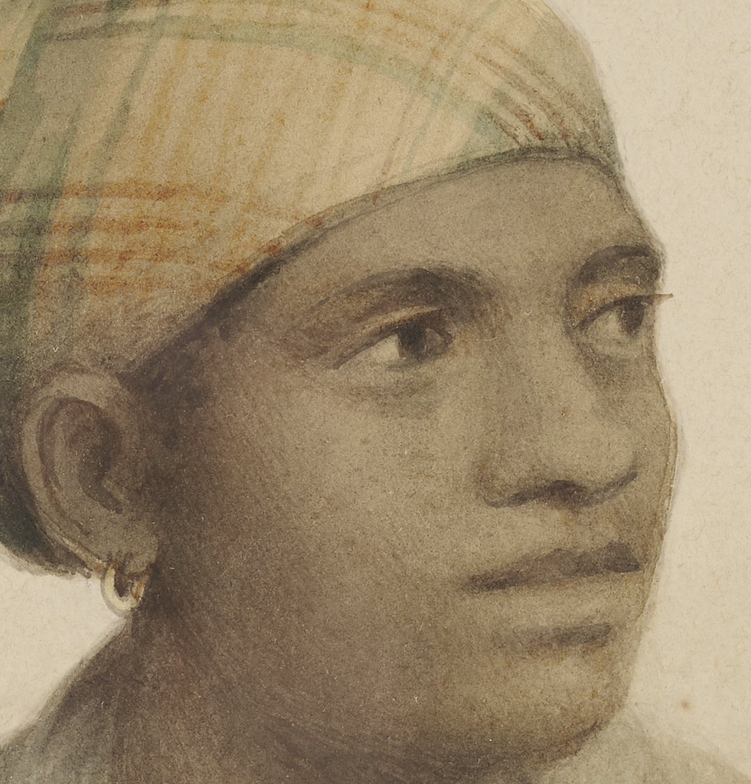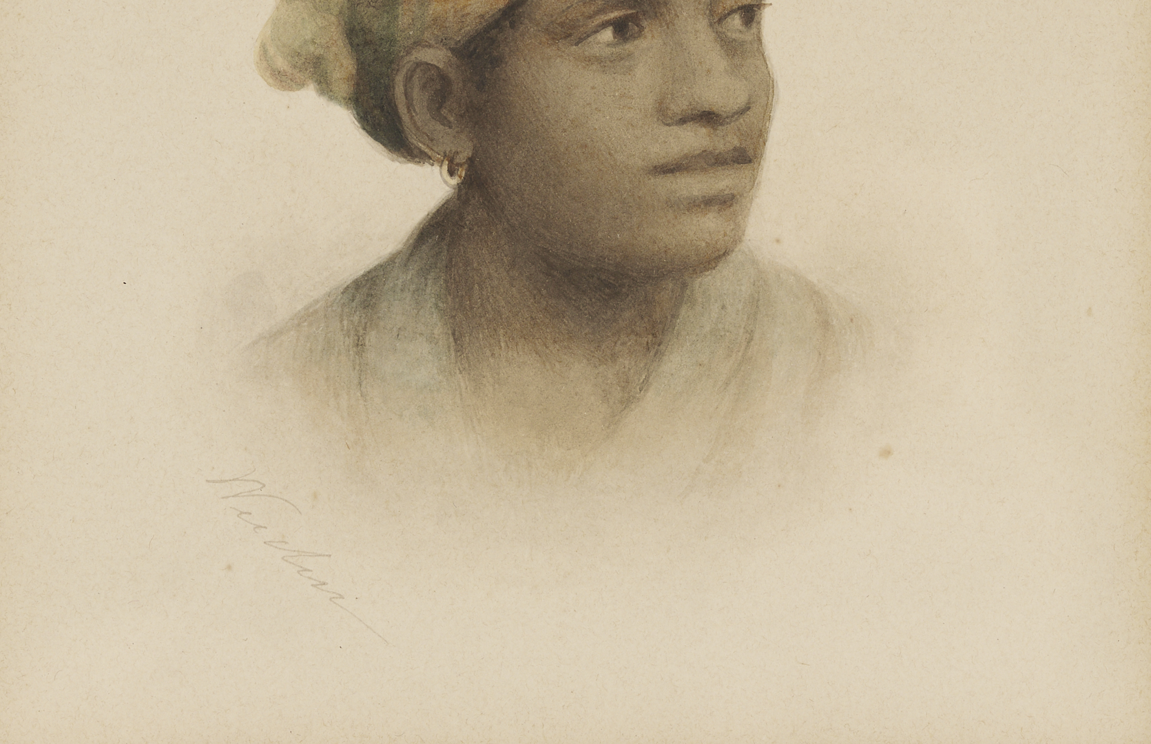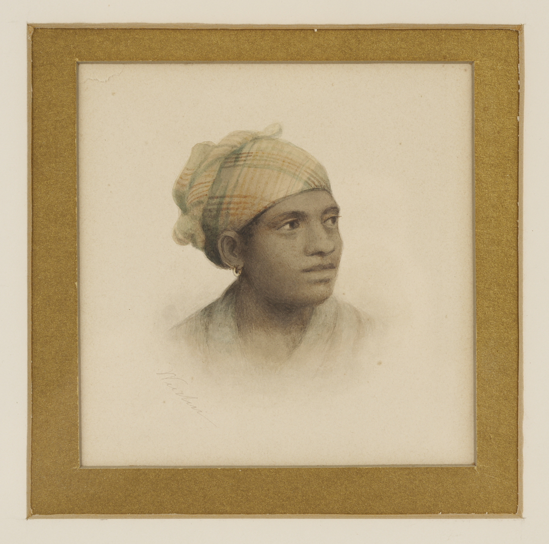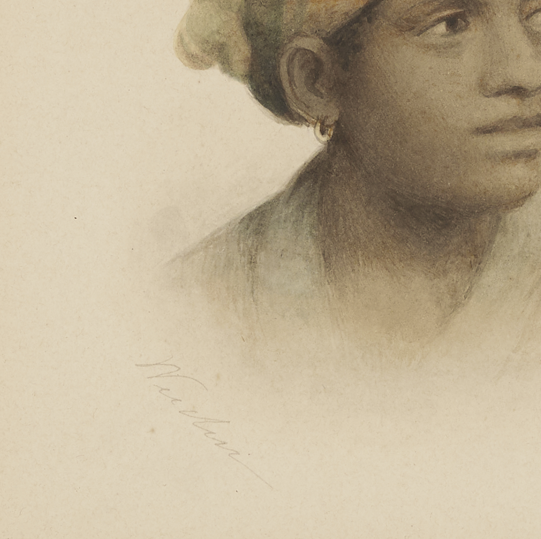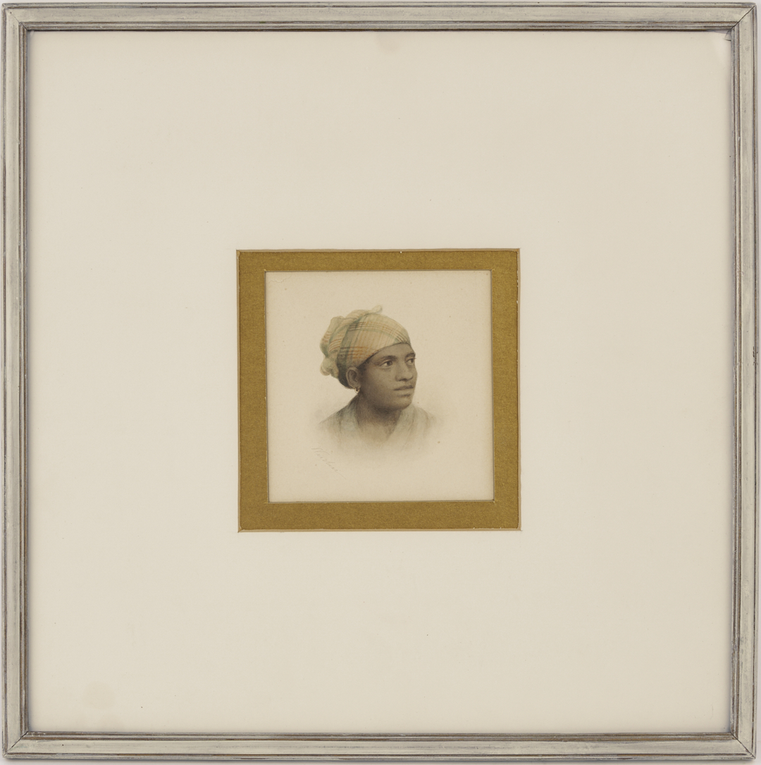 Maria Howard Weeden (Alabama, 1846-1905) watercolor on card portrait painting of a young woman shown in bust-length, three-quarters view. She wears a blue and brown head covering and gold earring and looks to her left. Signed “Weeden,” lower left. Framed under glass in a painted wooden frame with a white mat and gold reveal. Card: 8 7/8 in. H x 6 7/8 in. W. Sight: 4 3/8 in. x 4 3/8 in. Framed: 14 3/4 in. x 14 3/4 in. Biographical Note: Maria Howard Weeden was born in 1847 in Huntsville, Alabama, the youngest of six siblings. She showed artistic talent at an early age and was encouraged by her mother, who took her to study with William Frye, a well-known Southern portrait painter living in Huntsville at the time. She also studied art at the Huntsville Female Seminary. However, the Weeden family was financially ruined in the wake of the Civil War, and she was unable to pursue more formal training or visit places like Europe to find subject matter. As Martha Severens writes in “150 Years of Watercolor,” “Her sitters were generally members of her community who were former slaves serving as cooks, nannies, and gardeners. At a time when many artists were caricaturing African Americans, Weeden preferred to render more dignified and uplifting portraits. After visiting the World’s Columbian Exposition in Chicago, where she encountered many caustic images of the Uncle Remus variety, she resolved to pursue a different direction. She later recalled: ‘Then and there I awoke to the realization that right around me was a subject of supremest artistic interest, the old ex-slave, who henceforth became theme for my muse and model for my brush.” ” It is said that a combination of her nearsightedness and using brushes with only 3 hairs for painting allowed her to capture delicate details. Weeden did not use her first name on her works, preferring to sign them “Howard Weeden”. Her childhood home in Huntsville is now the Weeden House Museum and contains many of her works. Most of her subjects never commissioned these portraits, so she never found great commercial success. She also published four books of poetry with accompanying illustrations.