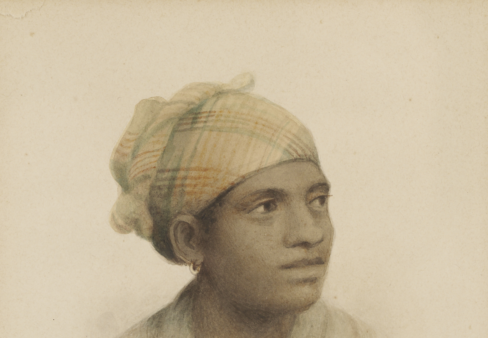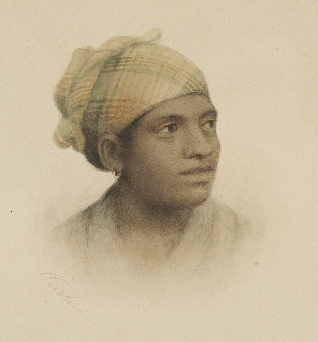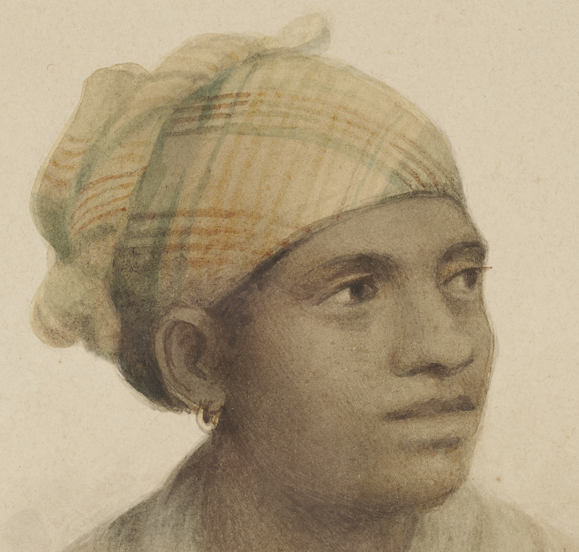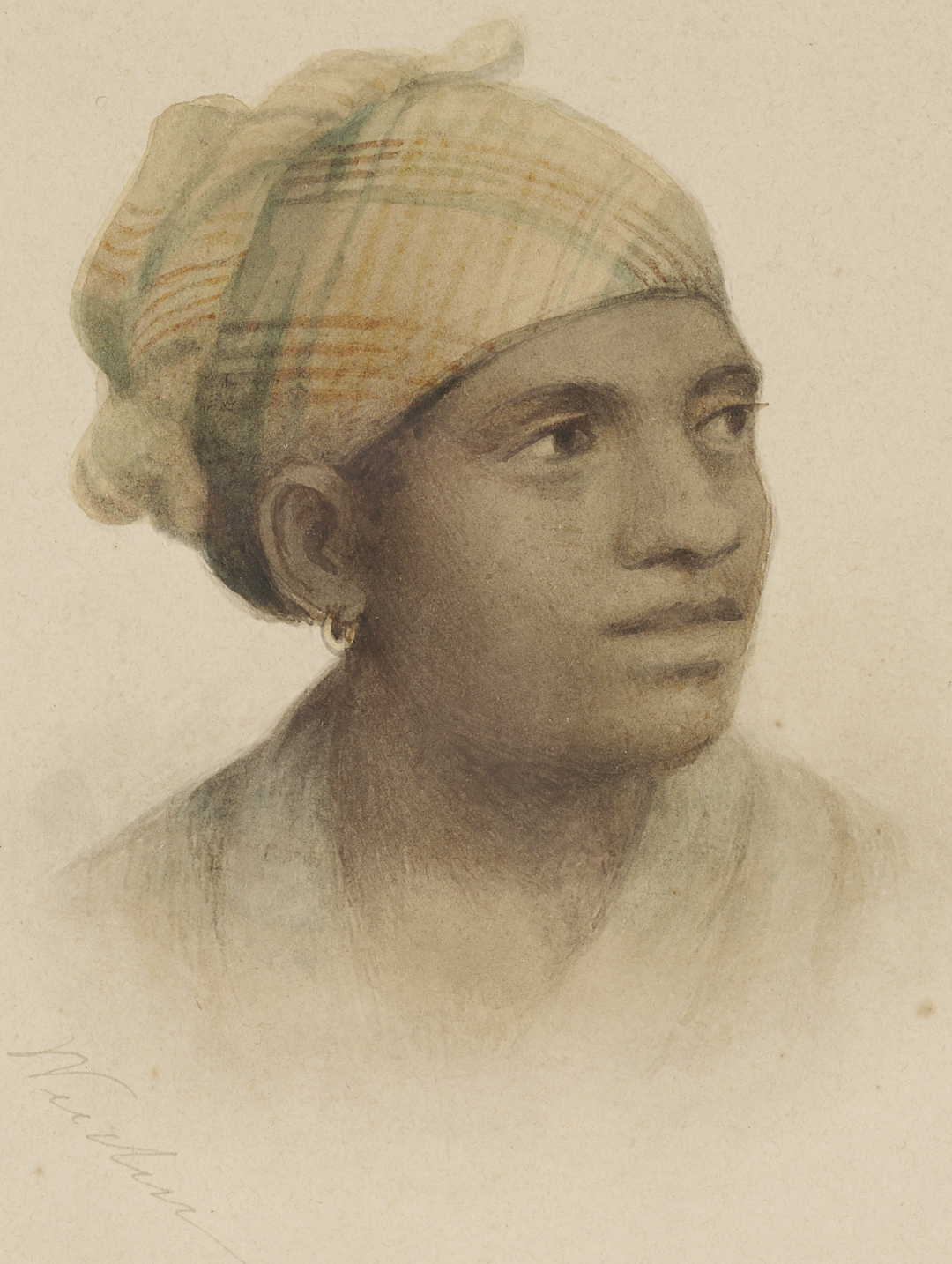 Maria Howard Weeden (Alabama, 1846-1905) watercolor on card portrait painting of a young woman shown in bust-length, three-quarters view. She wears a blue and brown head covering and gold earring and looks to her left. Signed “Weeden,” lower left. Framed under glass in a painted wooden frame with a white mat and gold reveal. Card: 8 7/8 in. H x 6 7/8 in. W. Sight: 4 3/8 in. x 4 3/8 in. Framed: 14 3/4 in. x 14 3/4 in. Biographical Note: Maria Howard Weeden was born in 1847 in Huntsville, Alabama, the youngest of six siblings. She showed artistic talent at an early age and was encouraged by her mother, who took her to study with William Frye, a well-known Southern portrait painter living in Huntsville at the time. She also studied art at the Huntsville Female Seminary. However, the Weeden family was financially ruined in the wake of the Civil War, and she was unable to pursue more formal training or visit places like Europe to find subject matter. As Martha Severens writes in “150 Years of Watercolor,” “Her sitters were generally members of her community who were former slaves serving as cooks, nannies, and gardeners. At a time when many artists were caricaturing African Americans, Weeden preferred to render more dignified and uplifting portraits. After visiting the World’s Columbian Exposition in Chicago, where she encountered many caustic images of the Uncle Remus variety, she resolved to pursue a different direction. She later recalled: ‘Then and there I awoke to the realization that right around me was a subject of supremest artistic interest, the old ex-slave, who henceforth became theme for my muse and model for my brush.” ” It is said that a combination of her nearsightedness and using brushes with only 3 hairs for painting allowed her to capture delicate details. Weeden did not use her first name on her works, preferring to sign them “Howard Weeden”. Her childhood home in Huntsville is now the Weeden House Museum and contains many of her works. Most of her subjects never commissioned these portraits, so she never found great commercial success. She also published four books of poetry with accompanying illustrations.