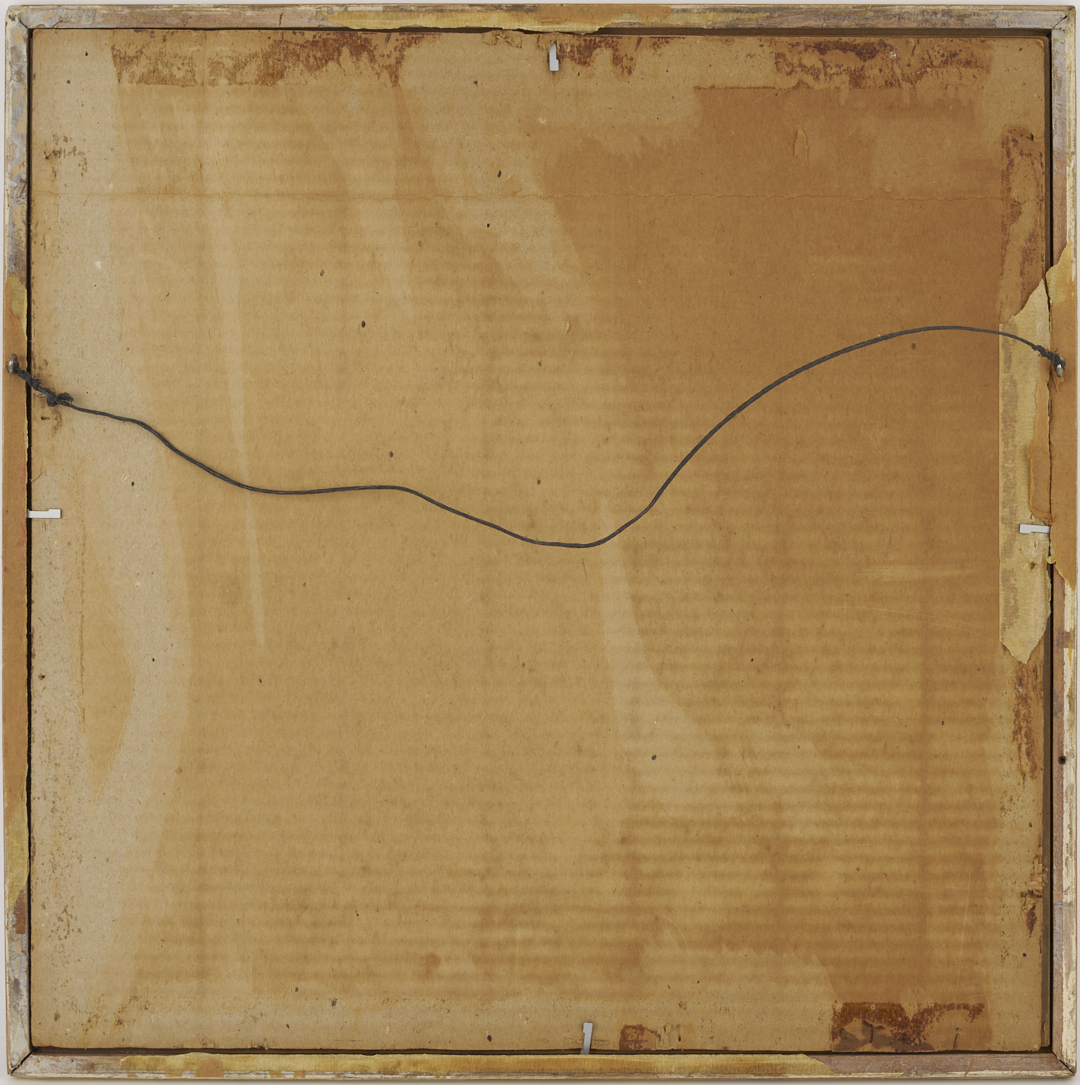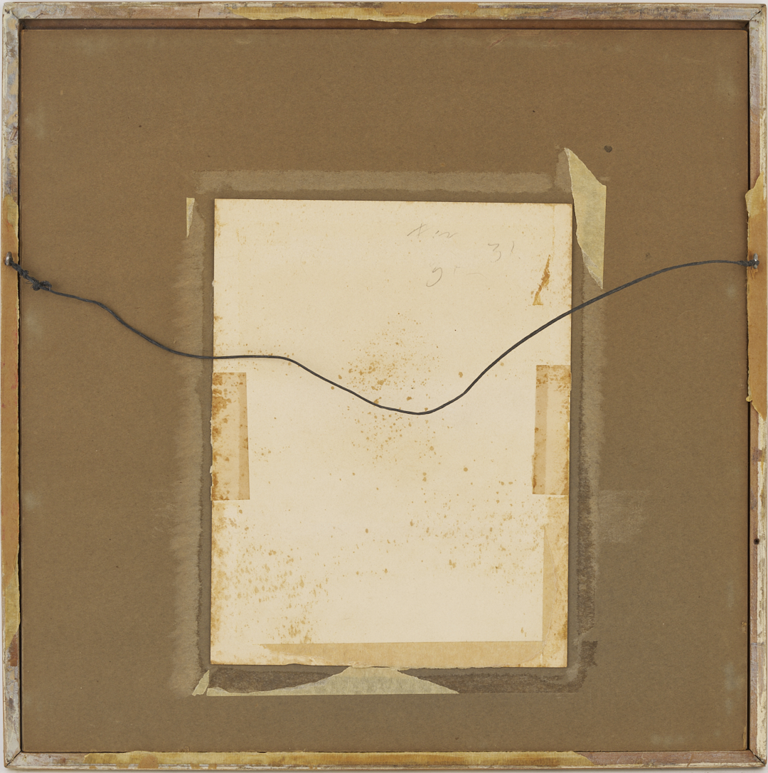 Overall very good condition within sight area. Card is adhered to mat. Upper layer of card is lifting at upper left, outside of image and without loss. Approximately 1/2 inch-long area of lifting to card visible within sight area.