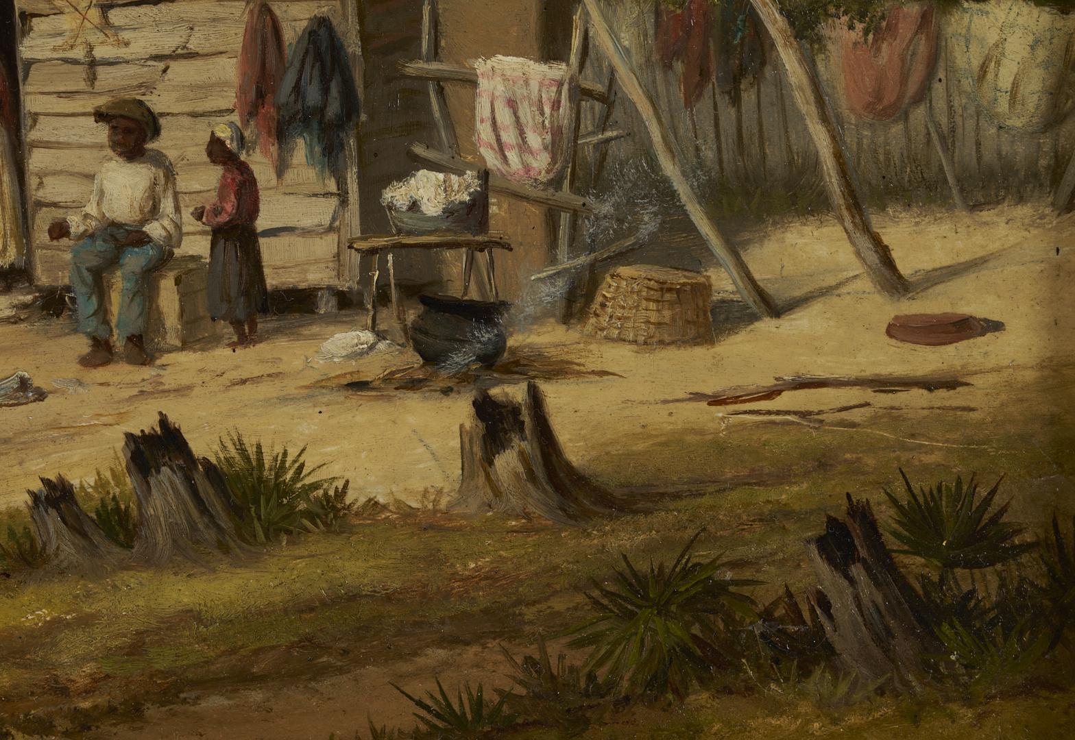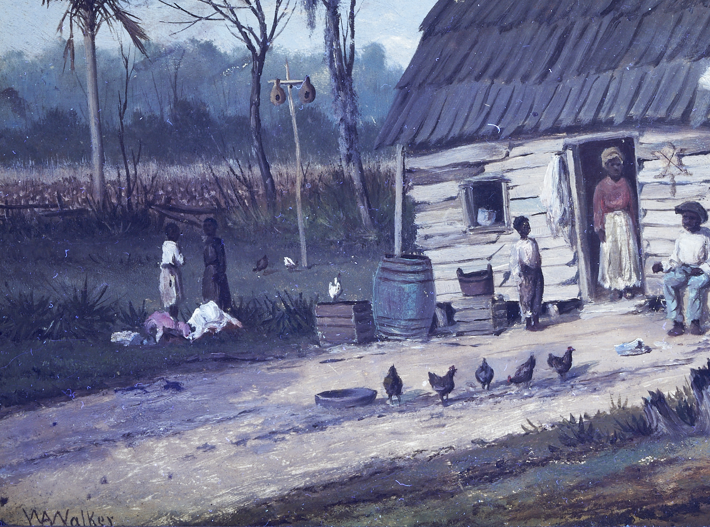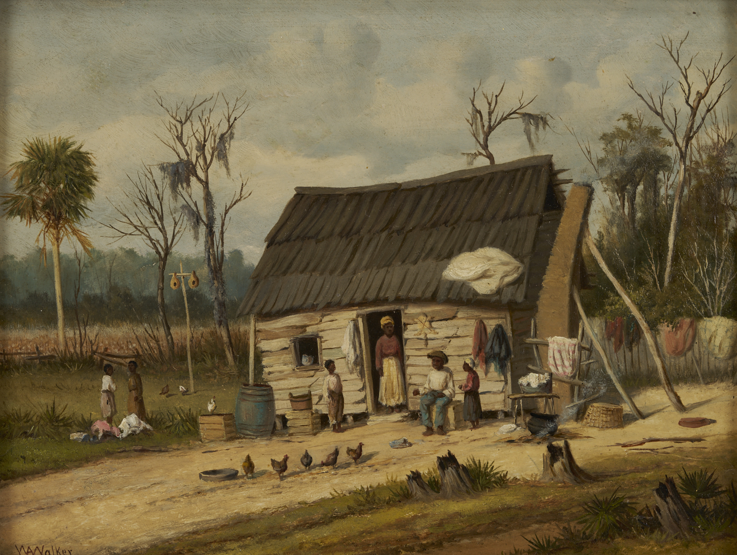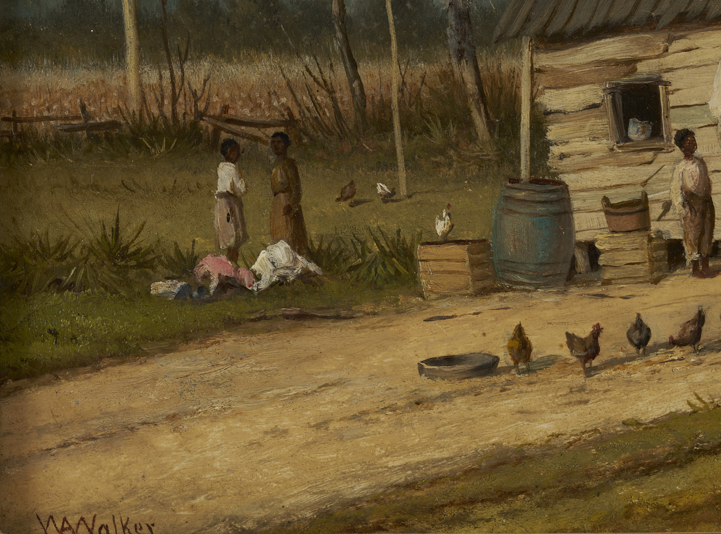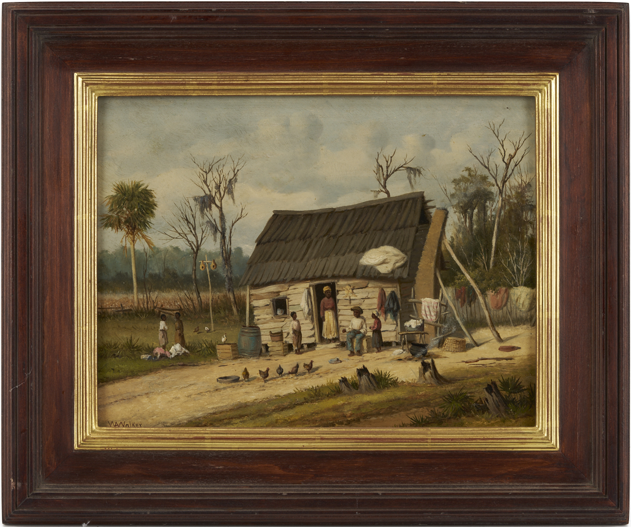 William Aiken Walker (American/South Carolina, 1838-1921) oil on board cabin scene painting with an African American family gathered before a small house. Chickens walk through the yard while laundry hangs on a line at right and a palm tree stands at left. Signed lower left. Housed in a wooden frame with gilt sight edge. Board: 9 1/4 in. H x 12 1/4 in. W. Sight: 8 3/4 in. H x 11 3/4 in. W. Framed: 14 in. H x 17 in. W. Note: This painting will be included in John Fowler’s forthcoming catalogue raisonne of the artist’s work. Artist Biography: The son of a prominent cotton agent, Charleston-born William Aiken Walker exhibited his first painting at the South Carolina Institute Fair at the age of 12. He went to Europe to study art in 1860 but returned to America during the Civil War, in which he served as a Confederate private and, following an injury, as a cartographer. After the war, Walker became primarily known for his prolific Southern scenes, mostly depicting rural plantations and the daily life of African Americans.