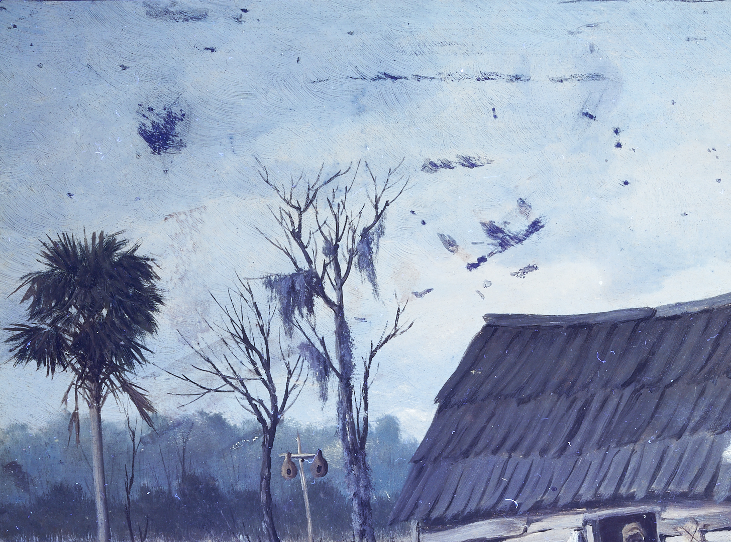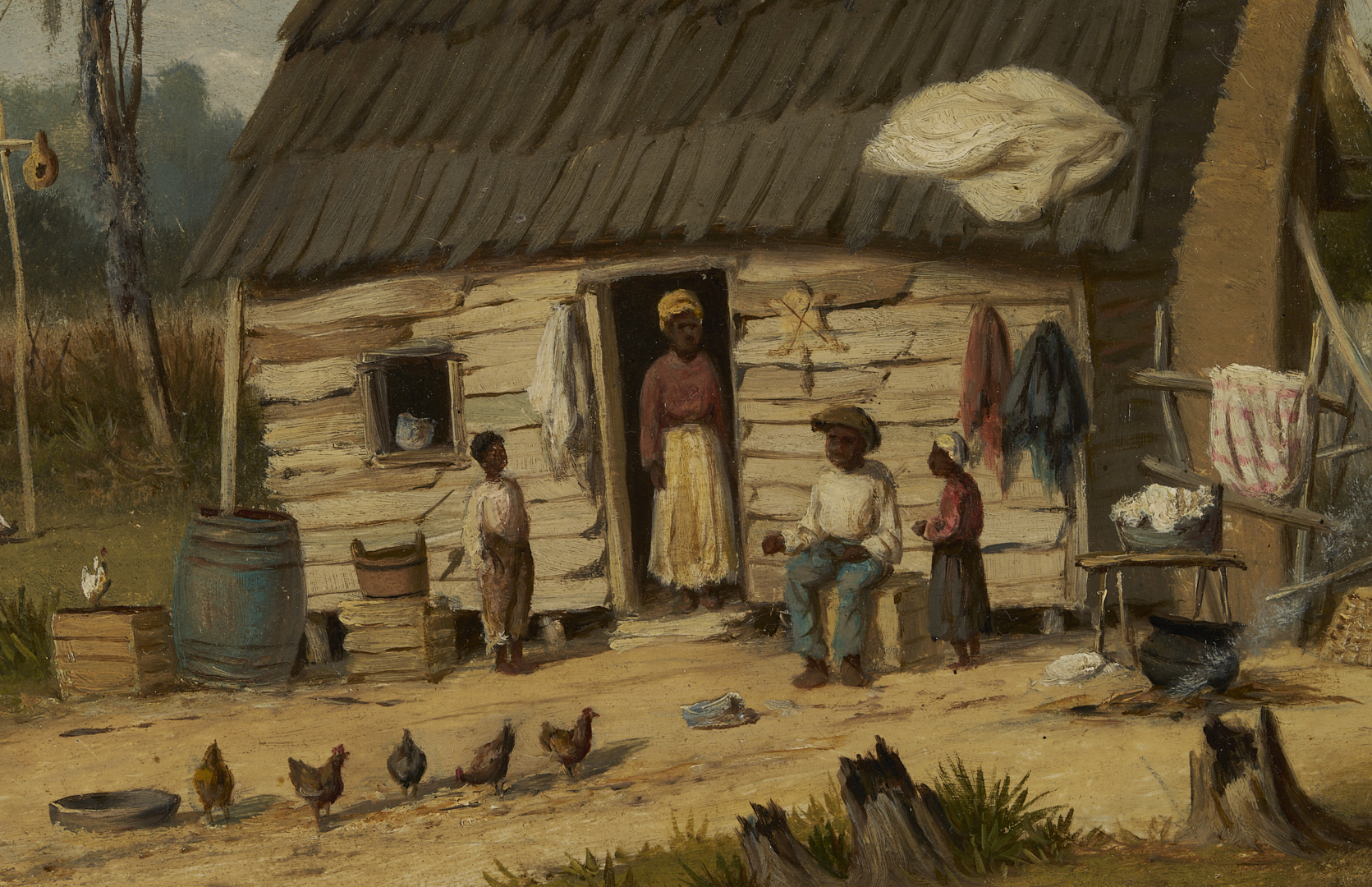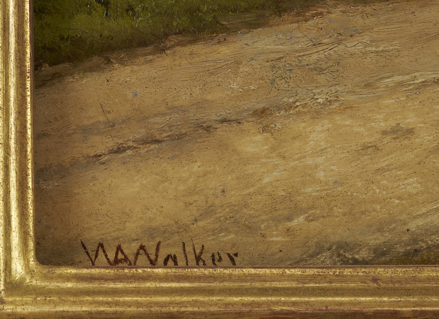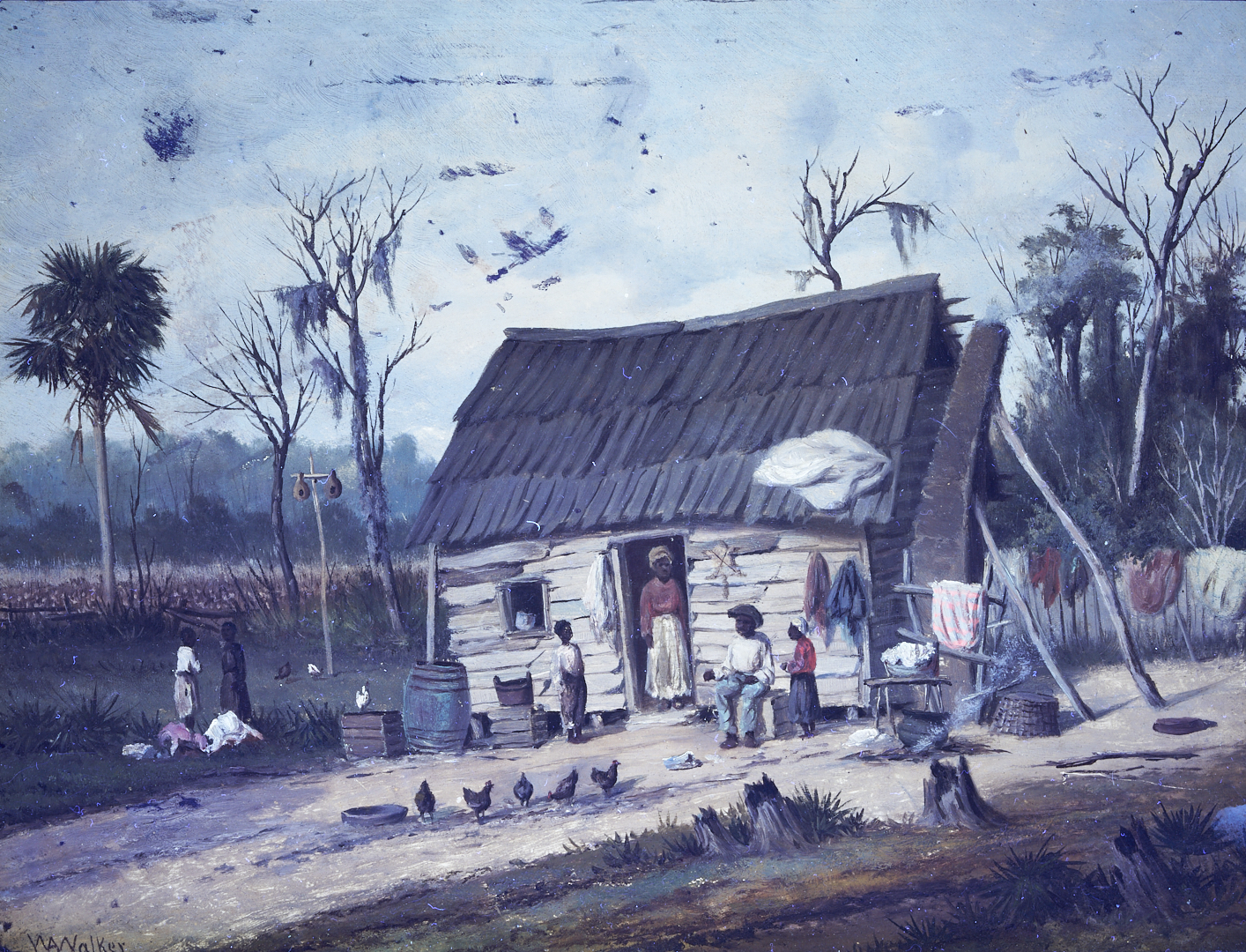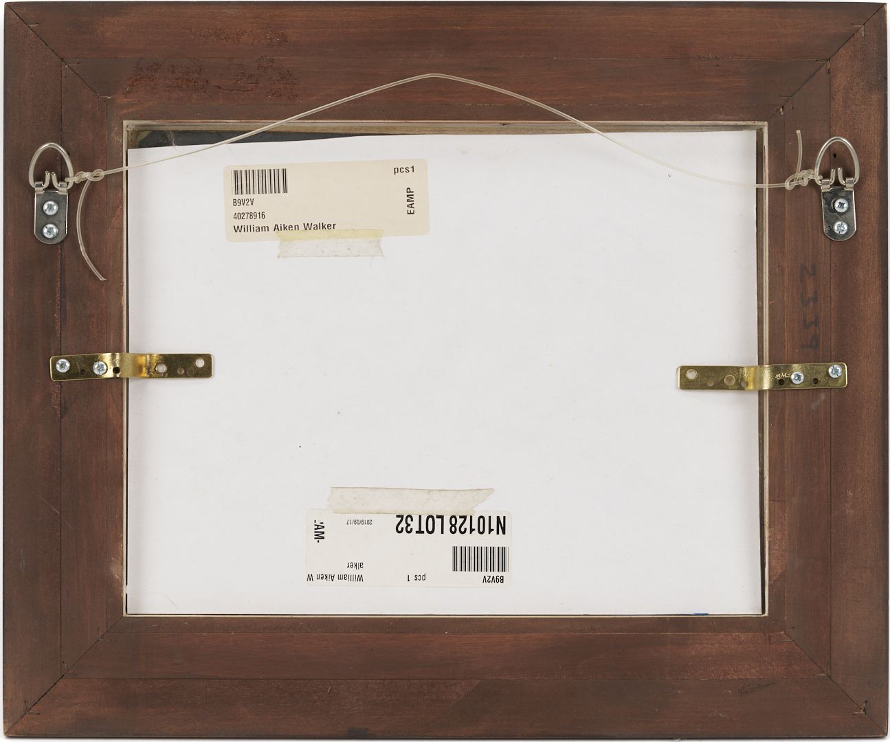 William Aiken Walker (American/South Carolina, 1838-1921) oil on board cabin scene painting with an African American family gathered before a small house. Chickens walk through the yard while laundry hangs on a line at right and a palm tree stands at left. Signed lower left. Housed in a wooden frame with gilt sight edge. Board: 9 1/4 in. H x 12 1/4 in. W. Sight: 8 3/4 in. H x 11 3/4 in. W. Framed: 14 in. H x 17 in. W. Note: This painting will be included in John Fowler’s forthcoming catalogue raisonne of the artist’s work. Artist Biography: The son of a prominent cotton agent, Charleston-born William Aiken Walker exhibited his first painting at the South Carolina Institute Fair at the age of 12. He went to Europe to study art in 1860 but returned to America during the Civil War, in which he served as a Confederate private and, following an injury, as a cartographer. After the war, Walker became primarily known for his prolific Southern scenes, mostly depicting rural plantations and the daily life of African Americans.