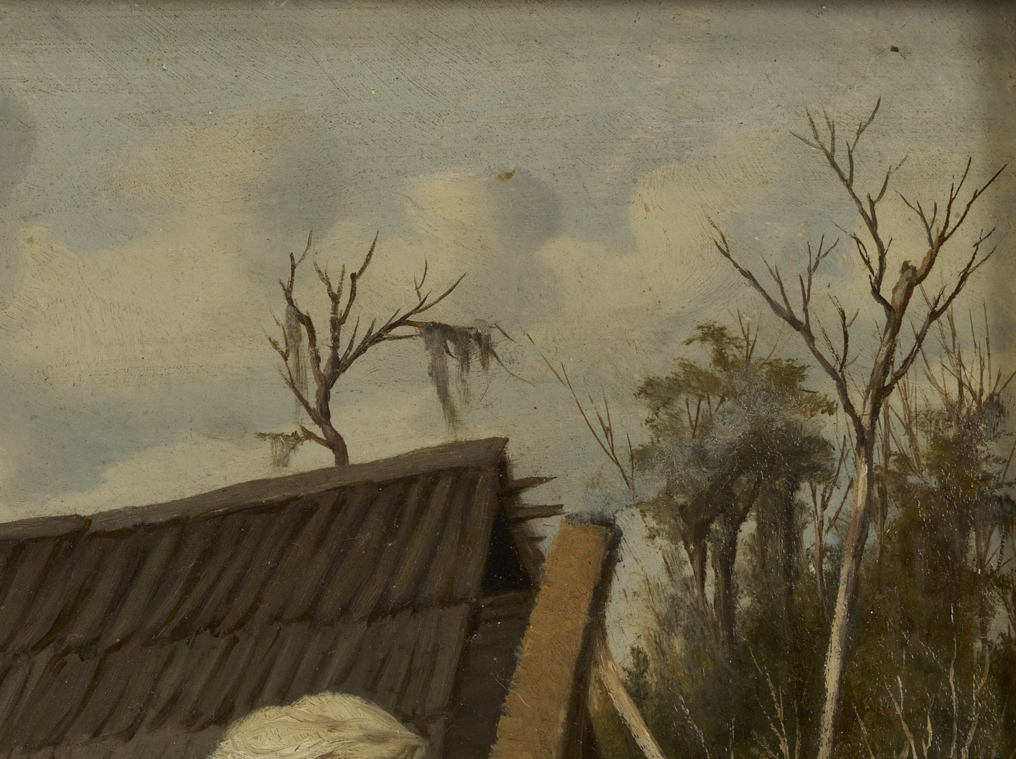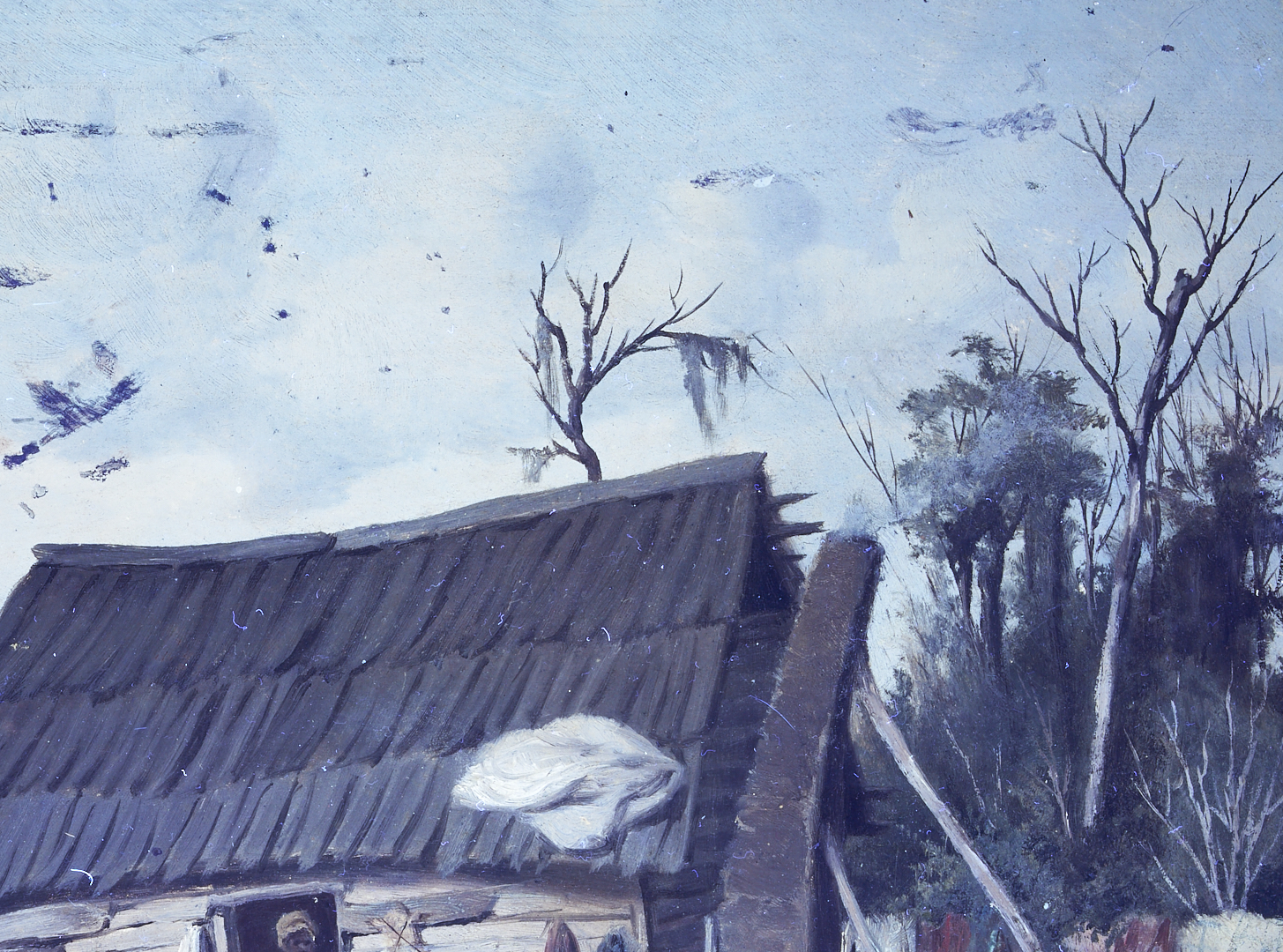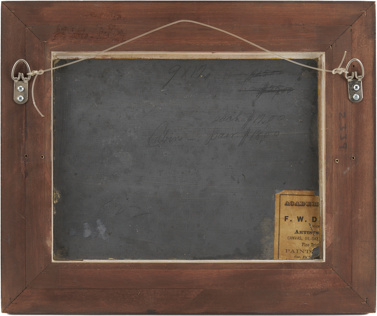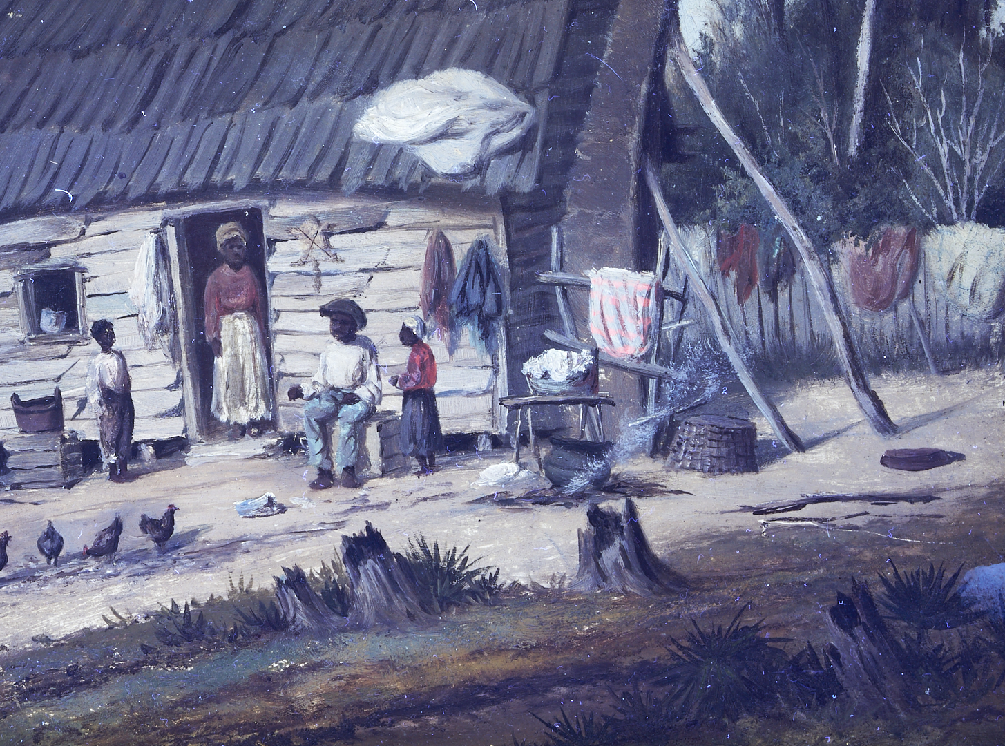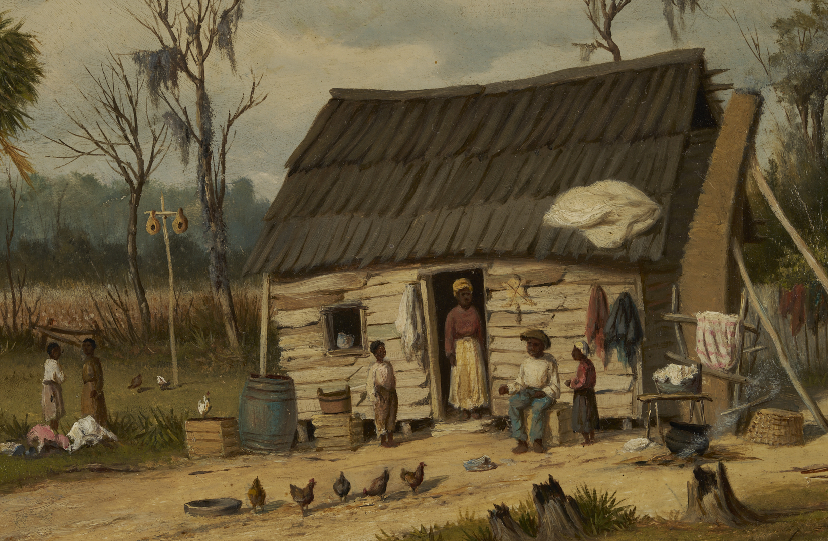 William Aiken Walker (American/South Carolina, 1838-1921) oil on board cabin scene painting with an African American family gathered before a small house. Chickens walk through the yard while laundry hangs on a line at right and a palm tree stands at left. Signed lower left. Housed in a wooden frame with gilt sight edge. Board: 9 1/4 in. H x 12 1/4 in. W. Sight: 8 3/4 in. H x 11 3/4 in. W. Framed: 14 in. H x 17 in. W. Note: This painting will be included in John Fowler’s forthcoming catalogue raisonne of the artist’s work. Artist Biography: The son of a prominent cotton agent, Charleston-born William Aiken Walker exhibited his first painting at the South Carolina Institute Fair at the age of 12. He went to Europe to study art in 1860 but returned to America during the Civil War, in which he served as a Confederate private and, following an injury, as a cartographer. After the war, Walker became primarily known for his prolific Southern scenes, mostly depicting rural plantations and the daily life of African Americans.