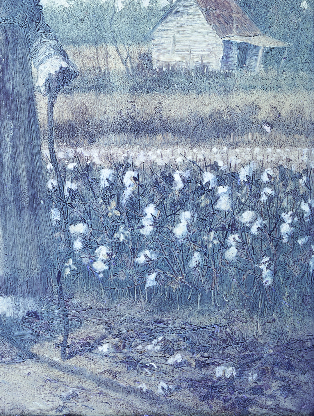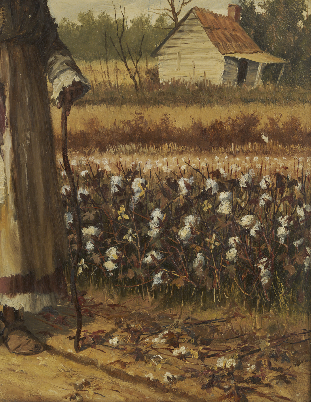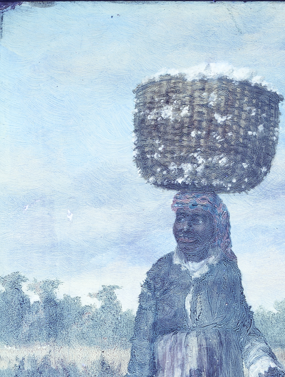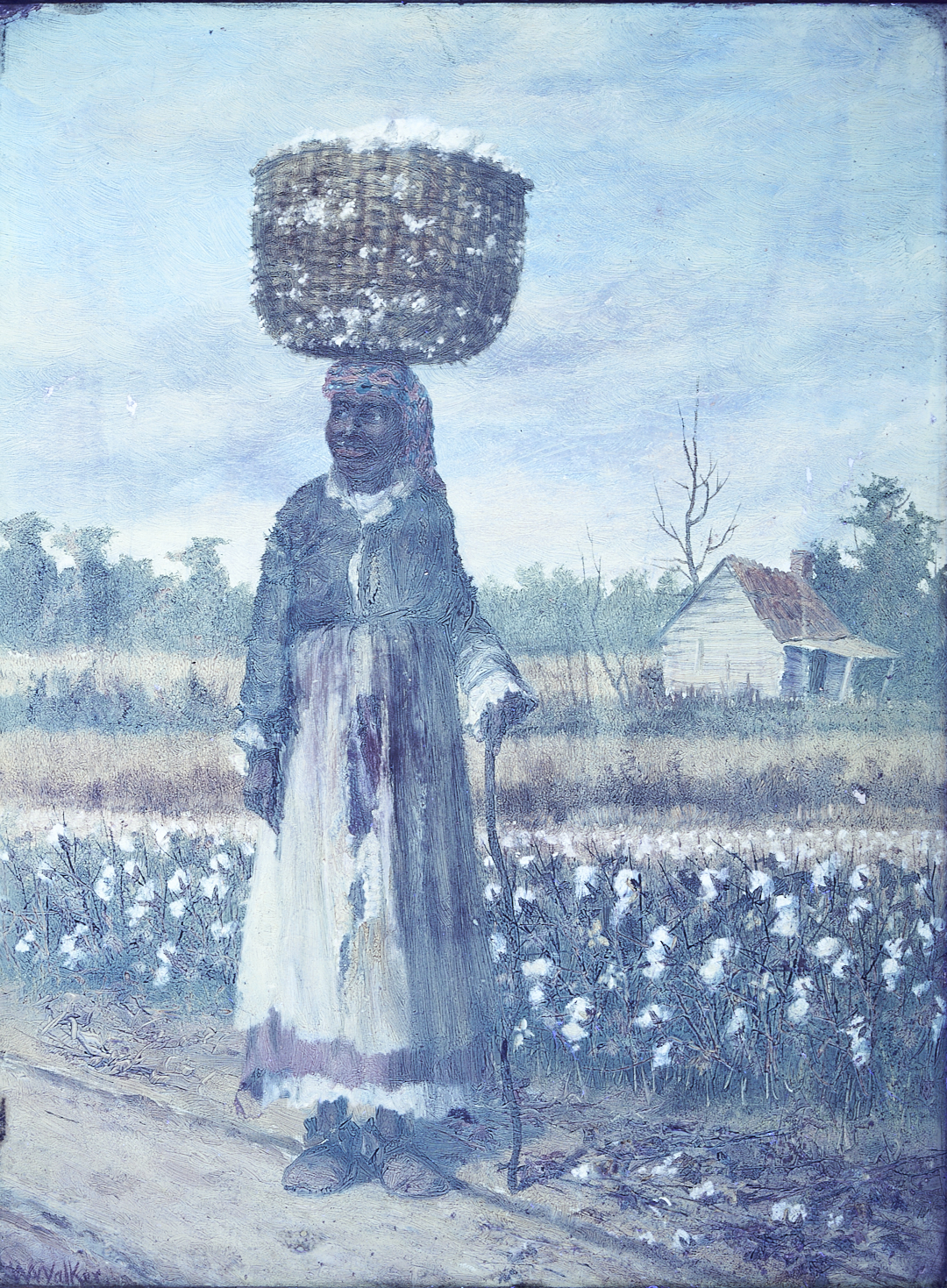 William Aiken Walker (American/South Carolina, 1838-1921) oil on canvas painting of a smiling, elderly African American sharecropper who leans on a cane and wears a patterned bandana. A large, woven cotton basket rests on her head and cotton grows along the roadside behind her. A house stands in the distance at right. Signed lower left. Housed in a likely original molded and giltwood frame. Sight: 12 in. H x 8 3/4 in. W. Framed: 18 in. H x 14 3/4 in. W. Biographical note: The son of a prominent cotton agent, Charleston-born William Aiken Walker exhibited his first painting at the South Carolina Institute Fair at the age of 12. He went to Europe to study art in 1860 but returned to America during the Civil War, in which he served as a Confederate private and, following an injury, as a cartographer. After the war, Walker became primarily known for his prolific Southern scenes, mostly depicting rural plantations and the daily life of African Americans.