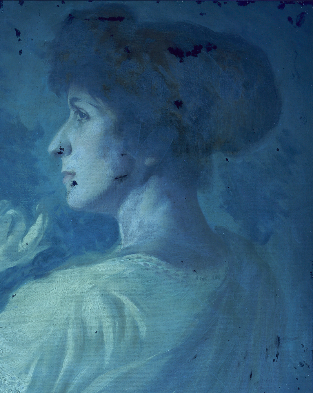 CONDITION: Retouch to several areas of paint exfoliation throughout, particularly to lower corners (see UV light photographs). Some fine craquelure. Canvas needs restretching; some craquelure and buckling to canvas upper left corner. Some fine white spatter to surface, lower right.