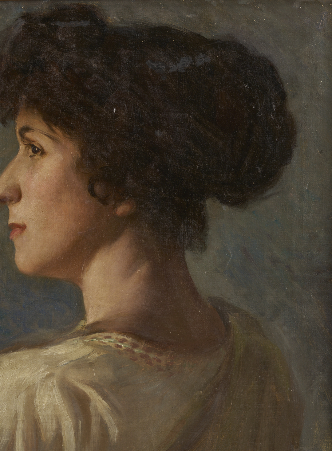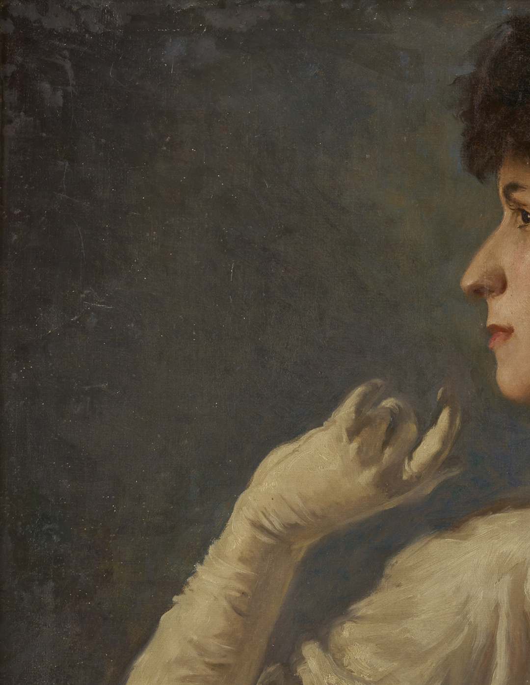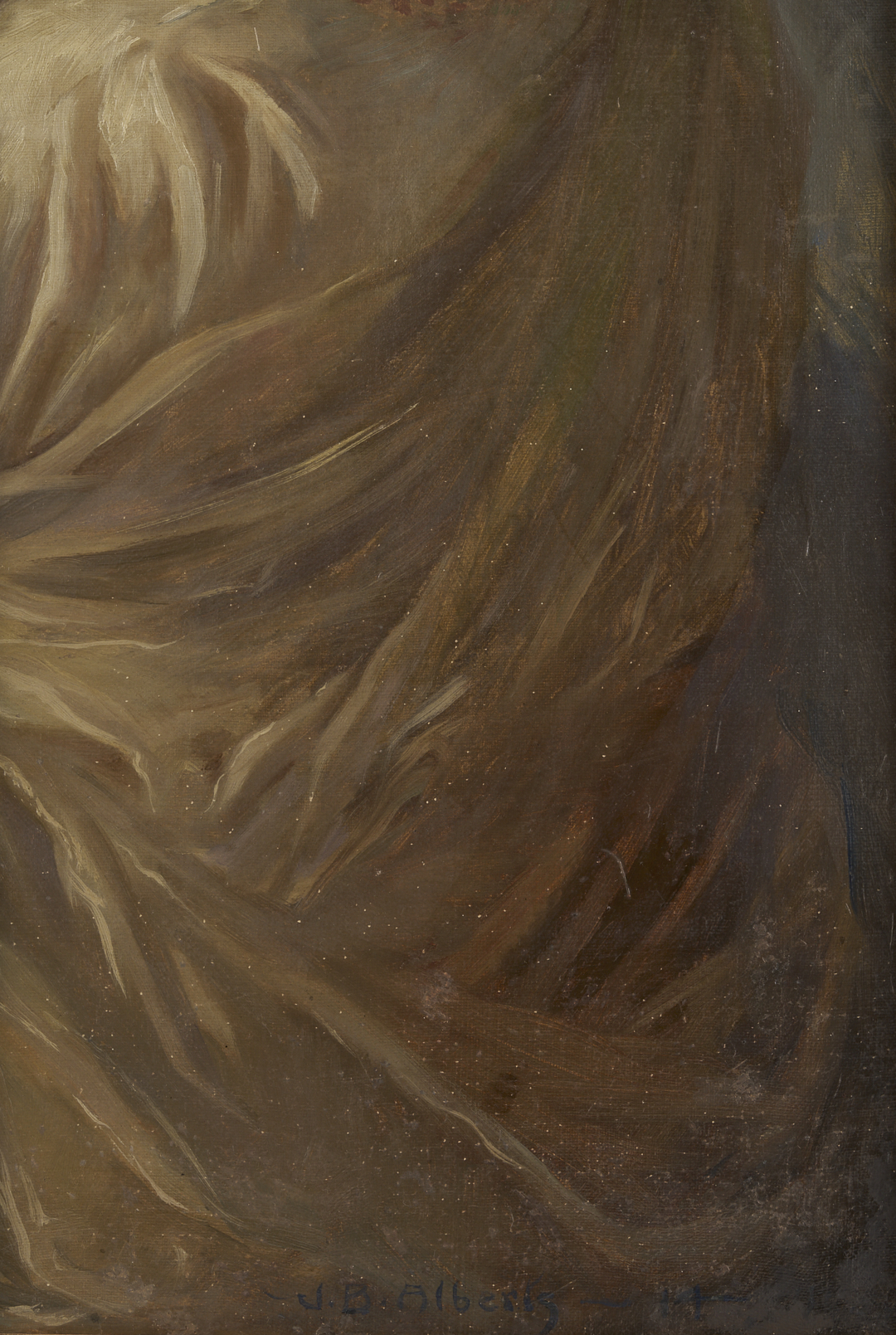 John Bernard Alberts, Jr. (Kentucky, 1886-1931), oil on canvas portrait of a dark-haired lady wearing a white evening gown and wrap, seated in an elaborate chair with her back partially turned to the viewer. One elbow rests on the lion-carved arm of the chair, and her gloved hand is raised toward her face, which appears in profile—signed “J.B. Alberts” lower right with partial date. Later molded wood frame with gilt beaded edges. Sight: 27 5/8 in. H x 21 1/2 in. W. Framed: 32 in. H x 25 3/4 in. W. Biography: Louisville-born John Alberts attended the Cincinnati Art Academy, where he was mentored by Frank Duvenek, then the Boston Academy of Fine Arts, where he studied with Edmund Tarbell and Frank Benson. He also spent a year in Europe, where he was heavily influenced by 16th-century Dutch artists. Back in Kentucky, Alberts shared a studio with Paul Plaschke and became a sought-after painter of portraits and designer of stained glass windows. However, he became ill during his army service in World War I and was left bedridden until his death at age 45. His extant works are rare; some can be found in the collections of the Filson Historical Society and the Greenville County, SC, Museum of Art. (Sources: Alberts’s obituary, The Courier Journal Aug. 25, 1931; The Johnson Collection).