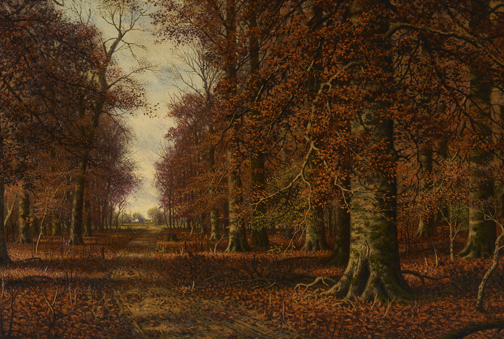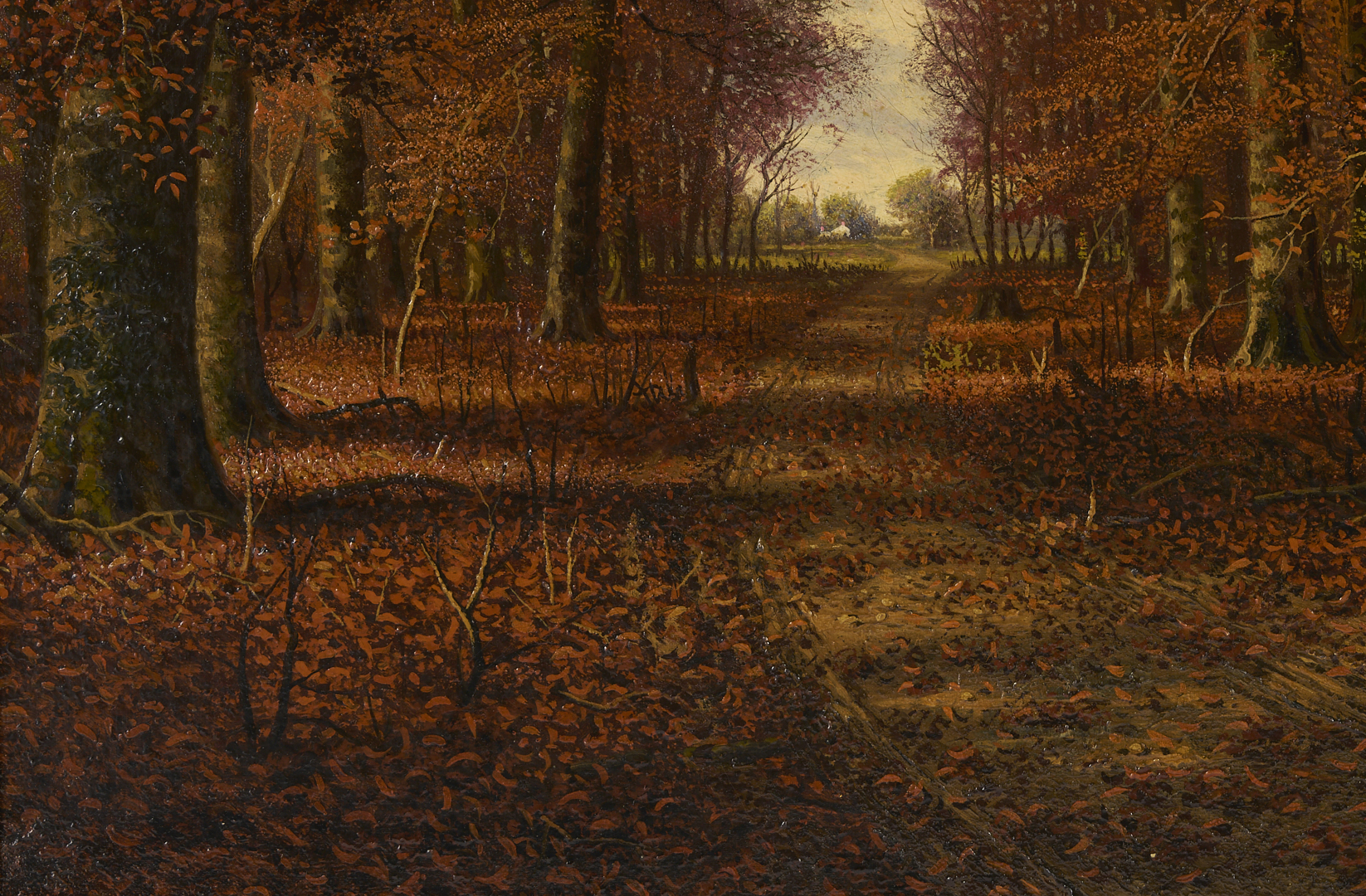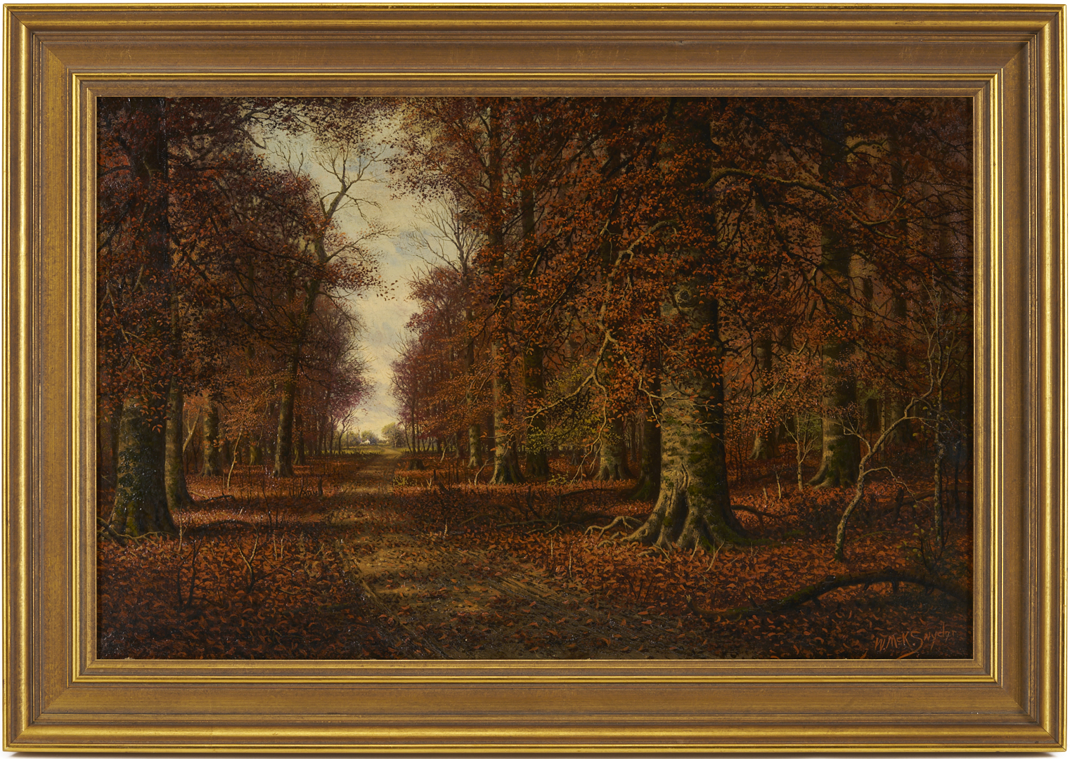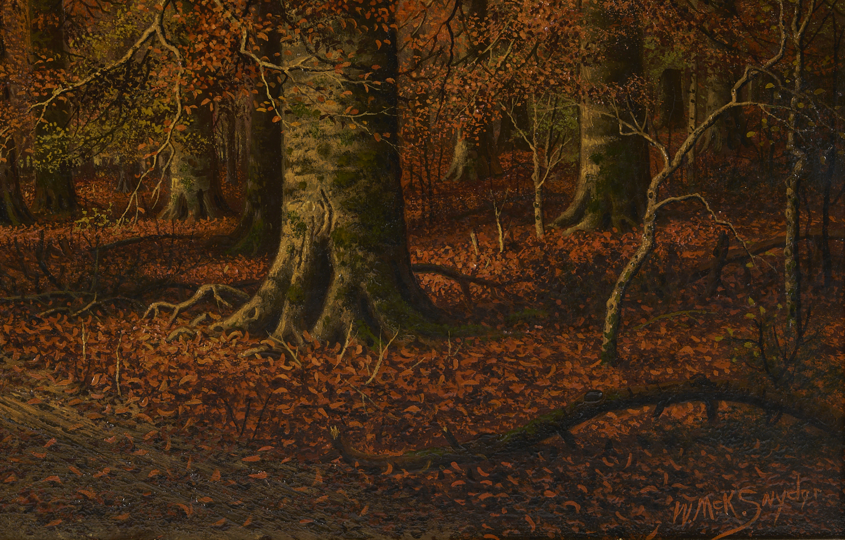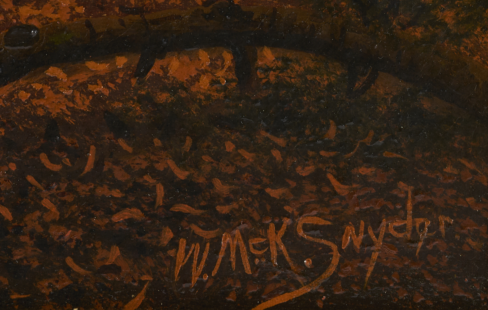William McKendree Snyder (Indiana, 1848-1930) oil on canvas autumn landscape painting. A leaf-strewn road leads through a forest, thick with finely detailed trees, toward a cottage in the distance. Signed “W. McK. Snyder” lower right. Numbered en verso of stretcher. Molded giltwood frame. Sight: 27 1/4 in W x 17 1/2 in. H. Frame: 33 in. W x 24 in. H. Biography: William McKendree Snyder was a forerunner of the Brown County Art Colony artists and is best known for his detailed depictions of Indiana landscapes. As a youth, he served in the Civil War and survived being captured and imprisoned at Andersonville. After the war, he studied with Inesco Williams in Cincinnati before going east. He was influenced by the Hudson River School and studied with George Inness, Alexander Wyant, Albert Bierstadt, Thomas Eaton and William Hunt between 1872 and 1875. Upon returning to Indiana, he frequently painted in New Albany and in Brown County, making him a forerunner of the Brown County Art Colony artists (Source: Indiana University Southeast).
