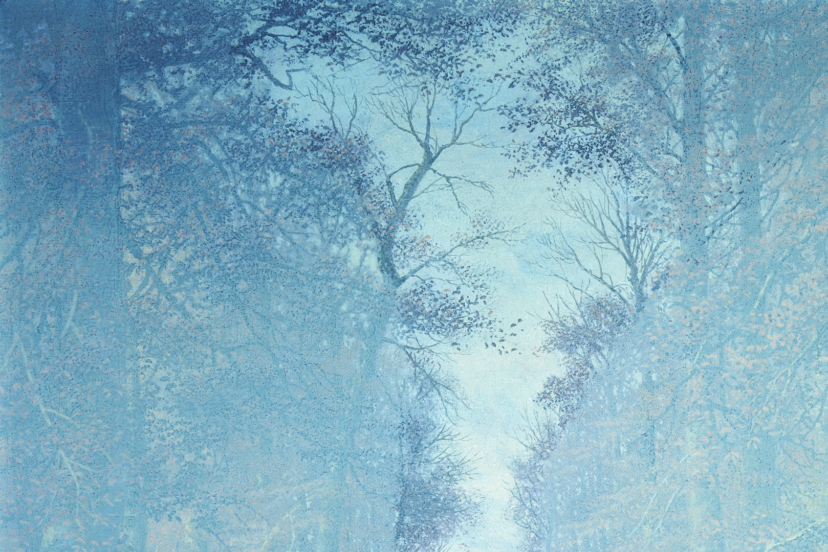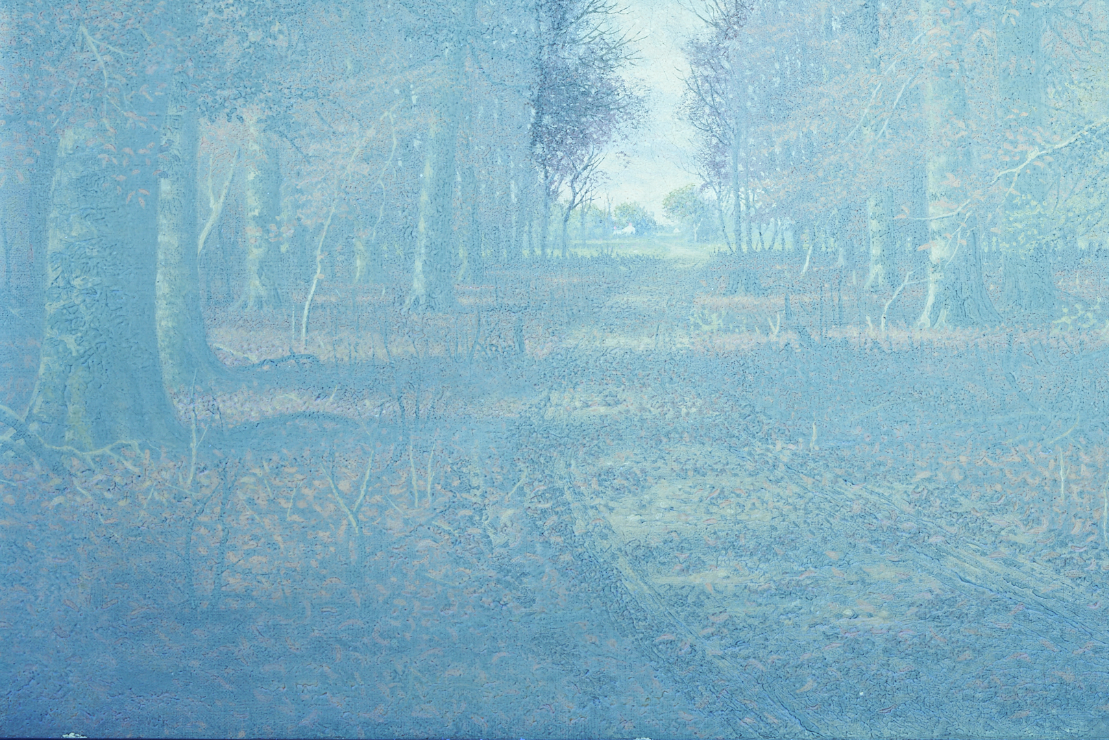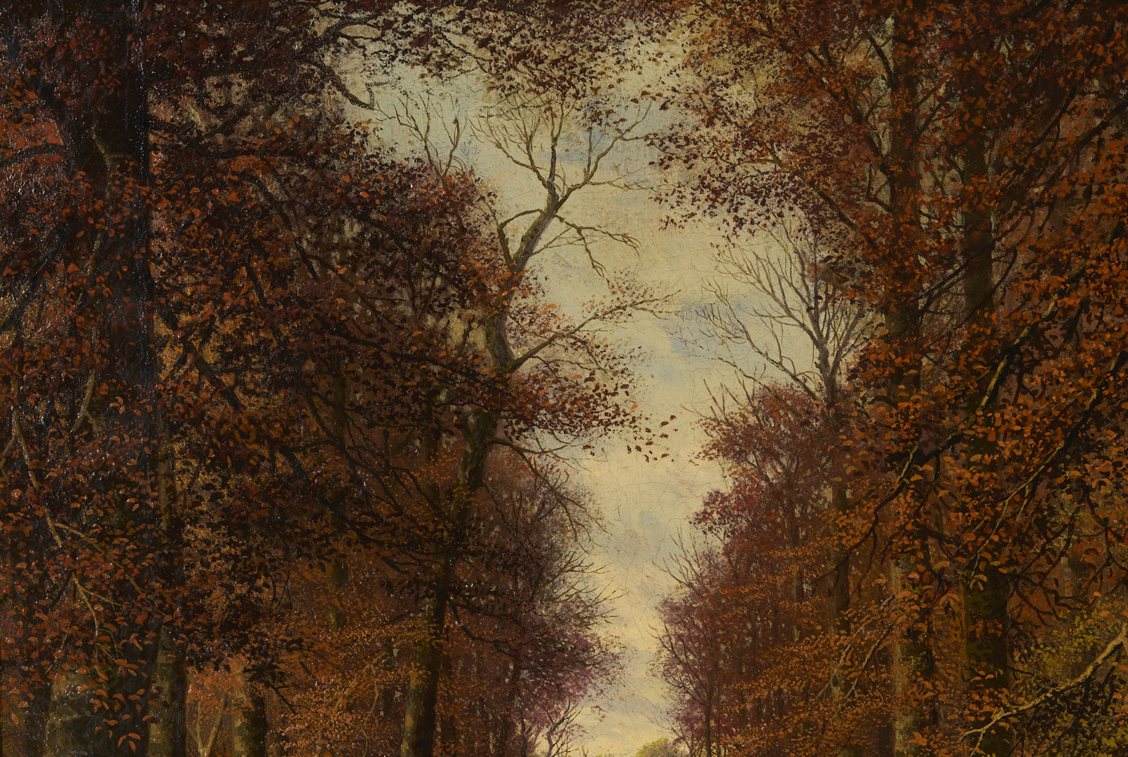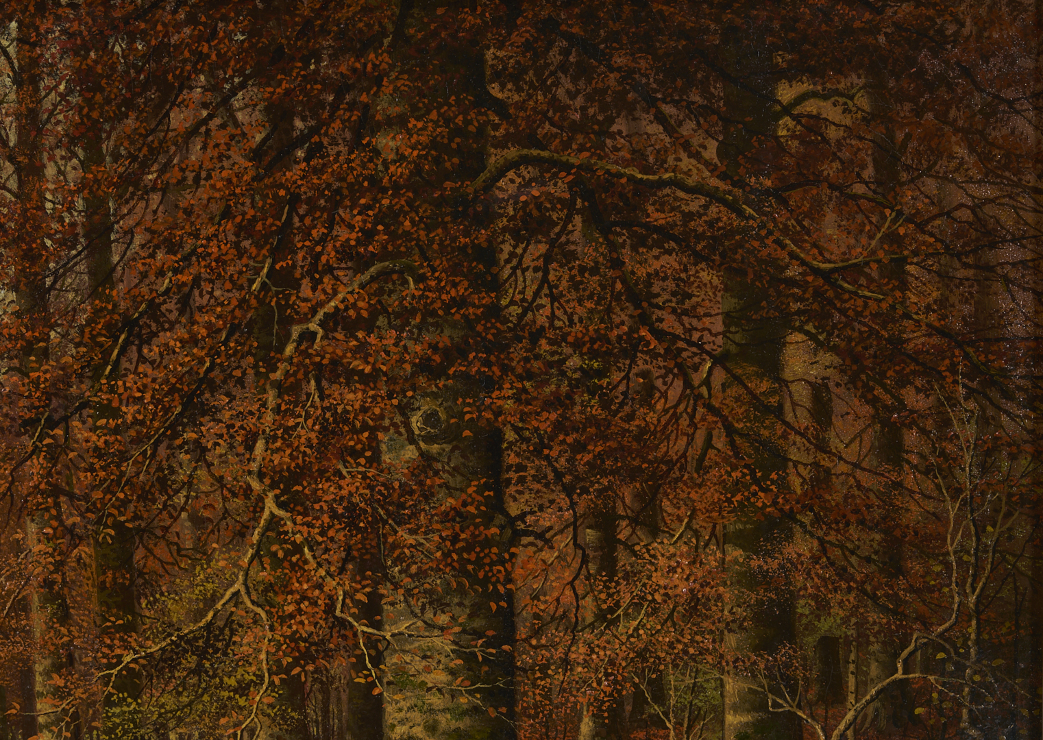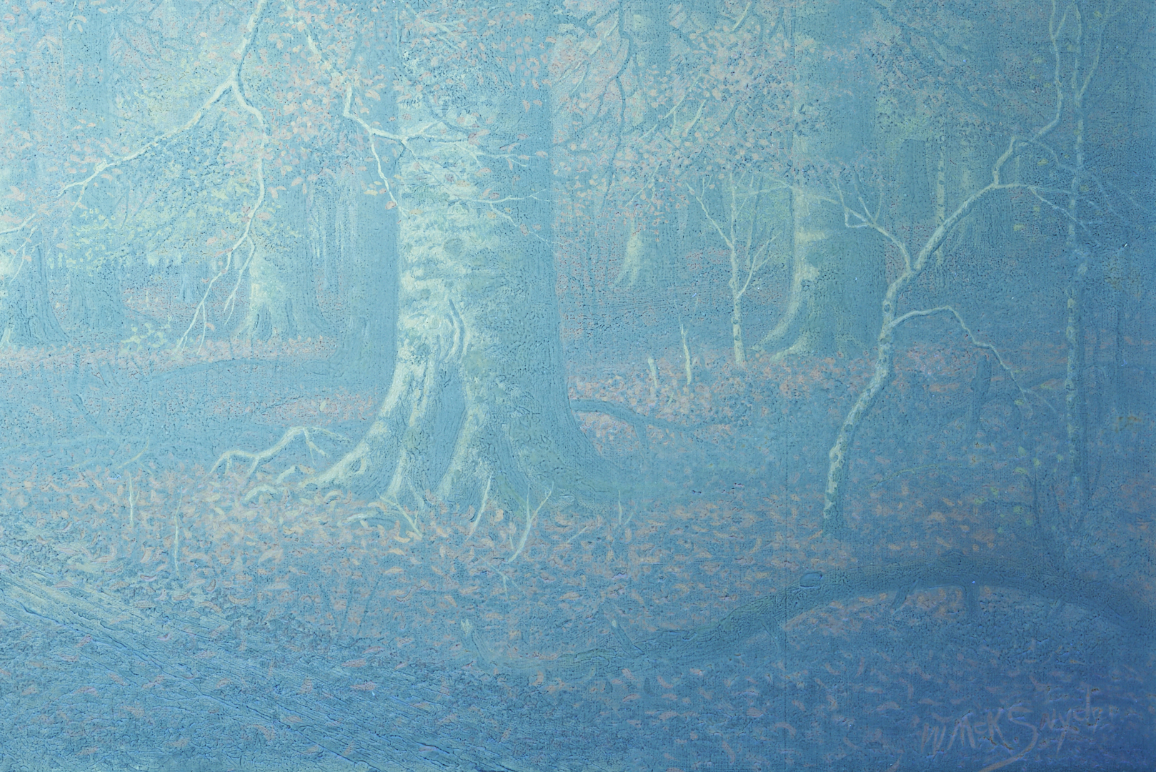 William McKendree Snyder (Indiana, 1848-1930) oil on canvas autumn landscape painting. A leaf-strewn road leads through a forest, thick with finely detailed trees, toward a cottage in the distance. Signed “W. McK. Snyder” lower right. Numbered en verso of stretcher. Molded giltwood frame. Sight: 27 1/4 in W x 17 1/2 in. H. Frame: 33 in. W x 24 in. H. Biography: William McKendree Snyder was a forerunner of the Brown County Art Colony artists and is best known for his detailed depictions of Indiana landscapes. As a youth, he served in the Civil War and survived being captured and imprisoned at Andersonville. After the war, he studied with Inesco Williams in Cincinnati before going east. He was influenced by the Hudson River School and studied with George Inness, Alexander Wyant, Albert Bierstadt, Thomas Eaton and William Hunt between 1872 and 1875. Upon returning to Indiana, he frequently painted in New Albany and in Brown County, making him a forerunner of the Brown County Art Colony artists (Source: Indiana University Southeast).