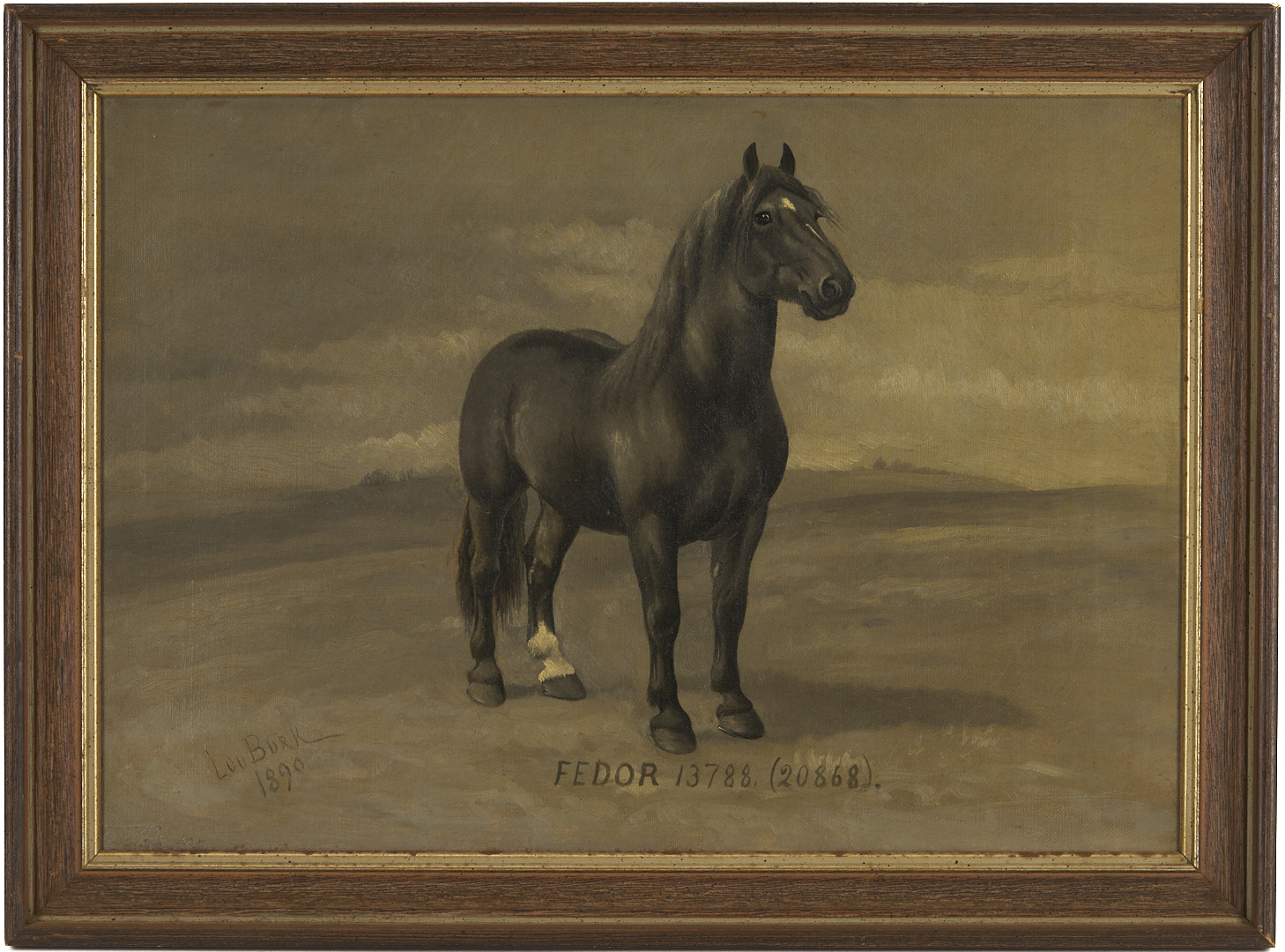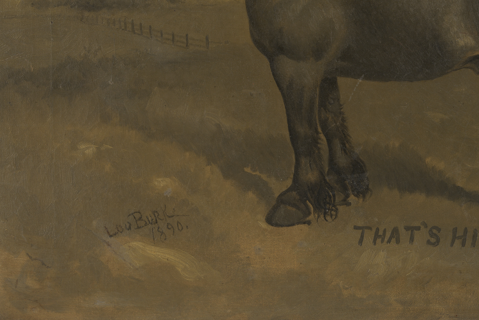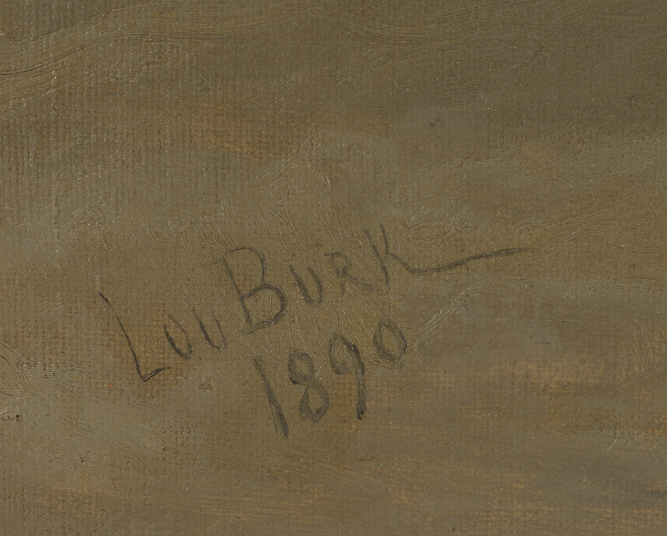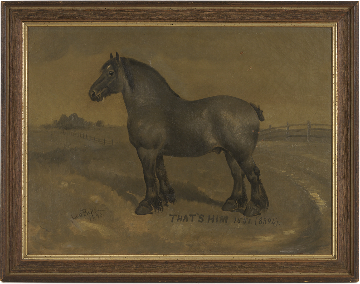Lou Burk (American, 1845-1914), two oil on canvas grisaille paintings of horses “Fedor” and “That’s Him”. Both horses are depicted standing, in landscape settings, with their names and various numbers painted in the scene below. Each signed “Lou Burk” lower left and dated 1890. In molded wood frames. Fedor Sight: 13 1/2 in. H x 19 1/2 in. W. Frame: 17 in. H x 23 in. W. That’s Him Sight: 14 1/2 in. H x 19 1/2 in. W. Frame 19 in. H x 23 in. W. Inscription en verso of Fedor notes that both horses were imported from Europe by a man named James Henry Scott (possibly James Henry Scott of Barren County, KY, b. 1842). Note: Lou Burk was born in Kentucky in 1845. He grew up on a farm in Illinois and went on to a career painting cattle, horses and other animals for catalog illustrations for livestock farmers and breeders. Both of these paintings were likely done for catalog illustrations.