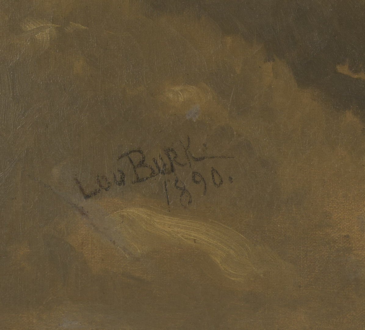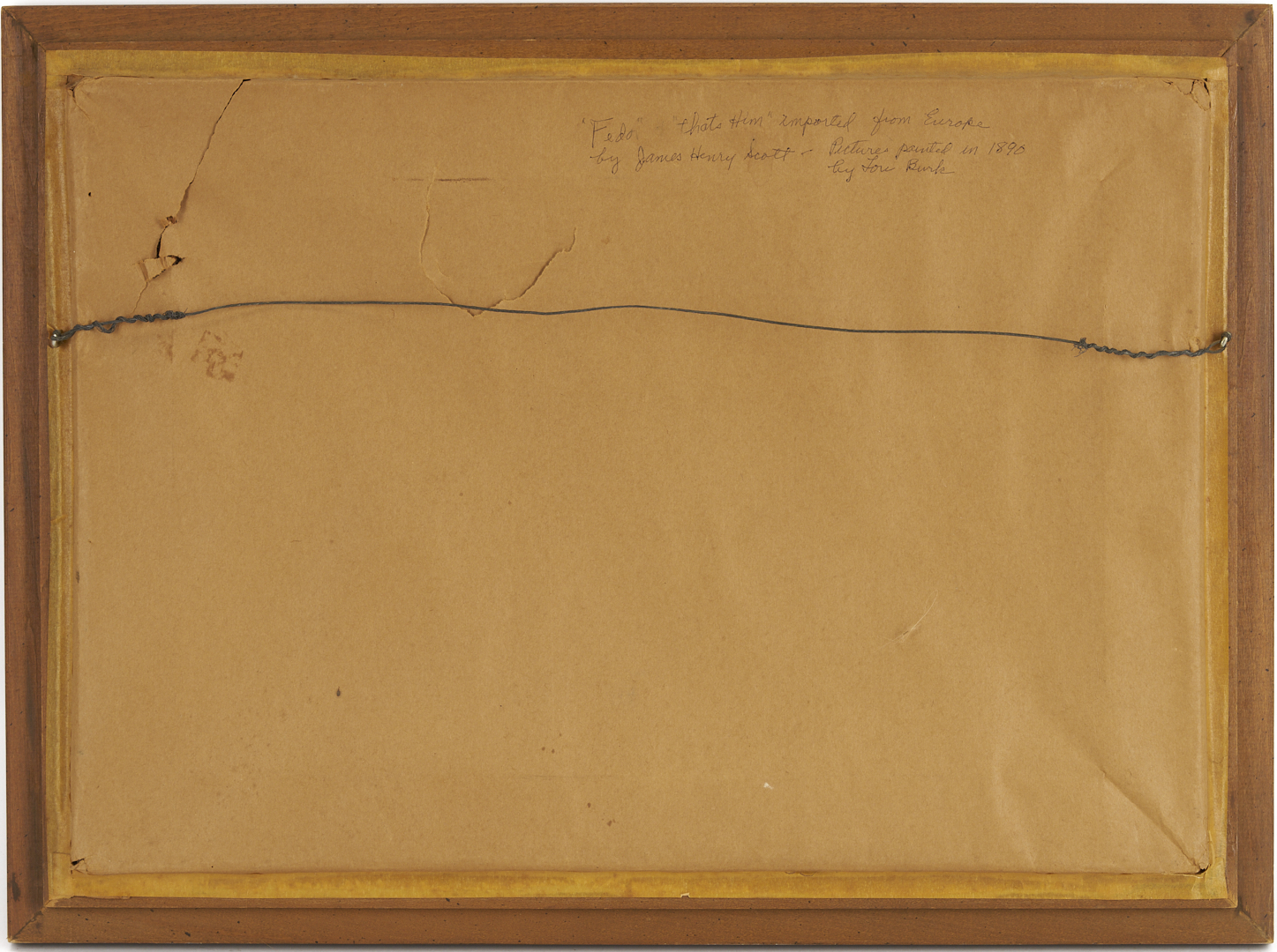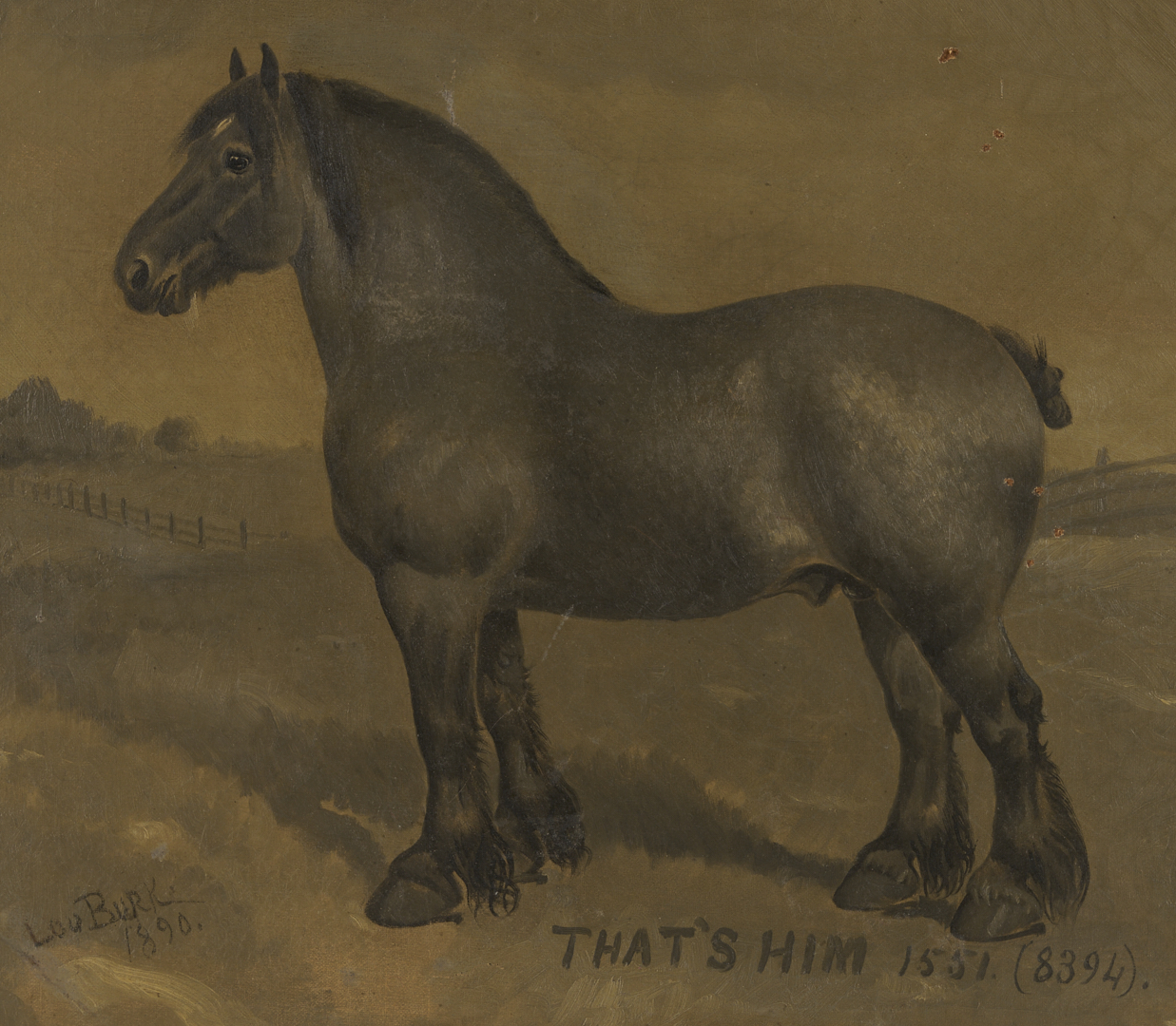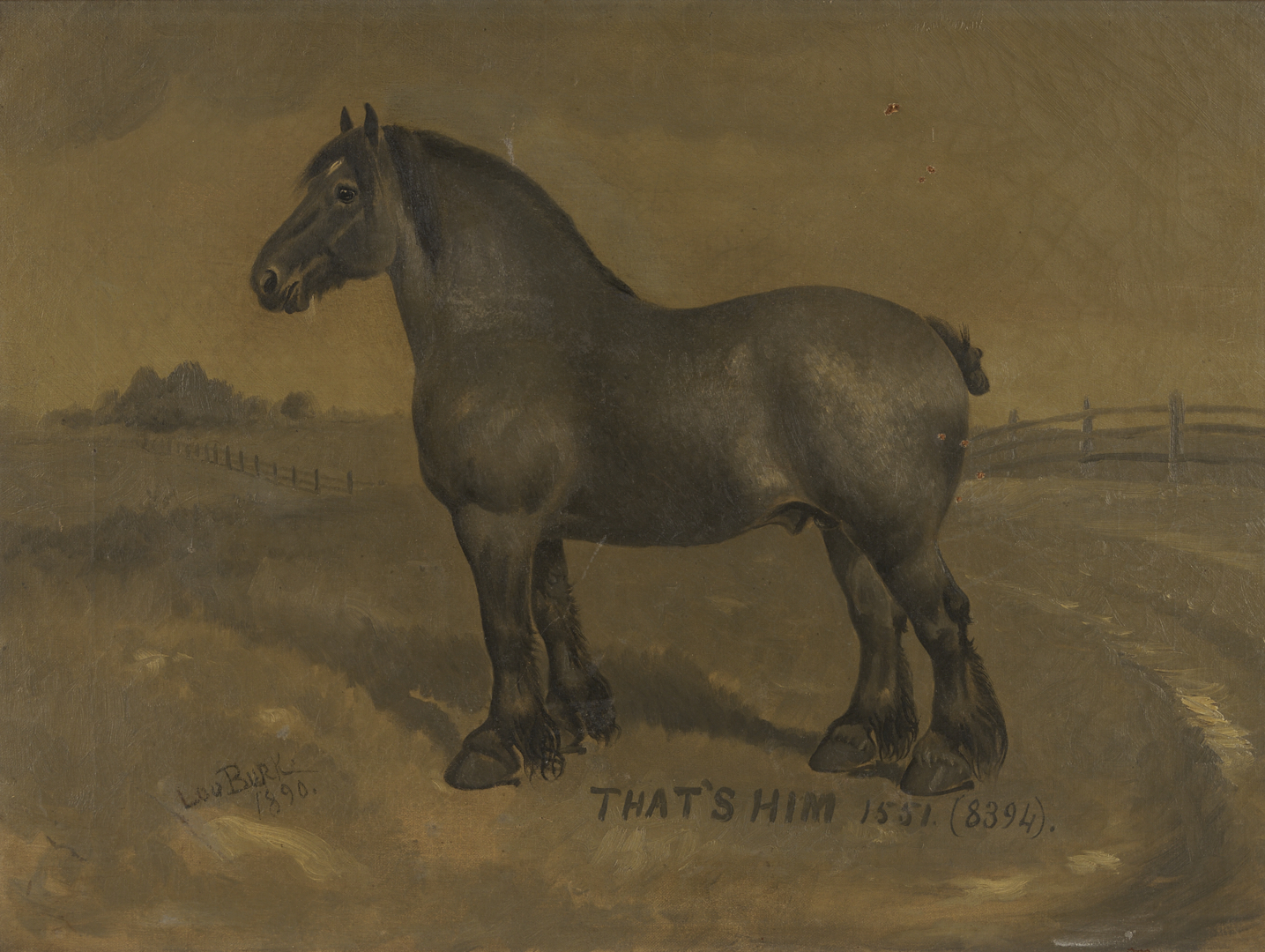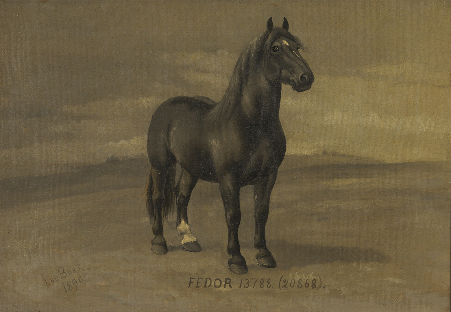 Lou Burk (American, 1845-1914), two oil on canvas grisaille paintings of horses “Fedor” and “That’s Him”. Both horses are depicted standing, in landscape settings, with their names and various numbers painted in the scene below. Each signed “Lou Burk” lower left and dated 1890. In molded wood frames. Fedor Sight: 13 1/2 in. H x 19 1/2 in. W. Frame: 17 in. H x 23 in. W. That’s Him Sight: 14 1/2 in. H x 19 1/2 in. W. Frame 19 in. H x 23 in. W. Inscription en verso of Fedor notes that both horses were imported from Europe by a man named James Henry Scott (possibly James Henry Scott of Barren County, KY, b. 1842). Note: Lou Burk was born in Kentucky in 1845. He grew up on a farm in Illinois and went on to a career painting cattle, horses and other animals for catalog illustrations for livestock farmers and breeders. Both of these paintings were likely done for catalog illustrations.