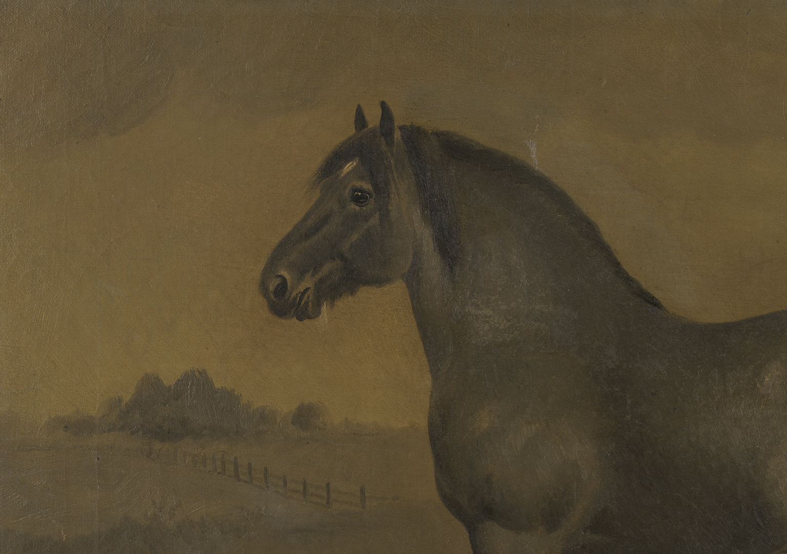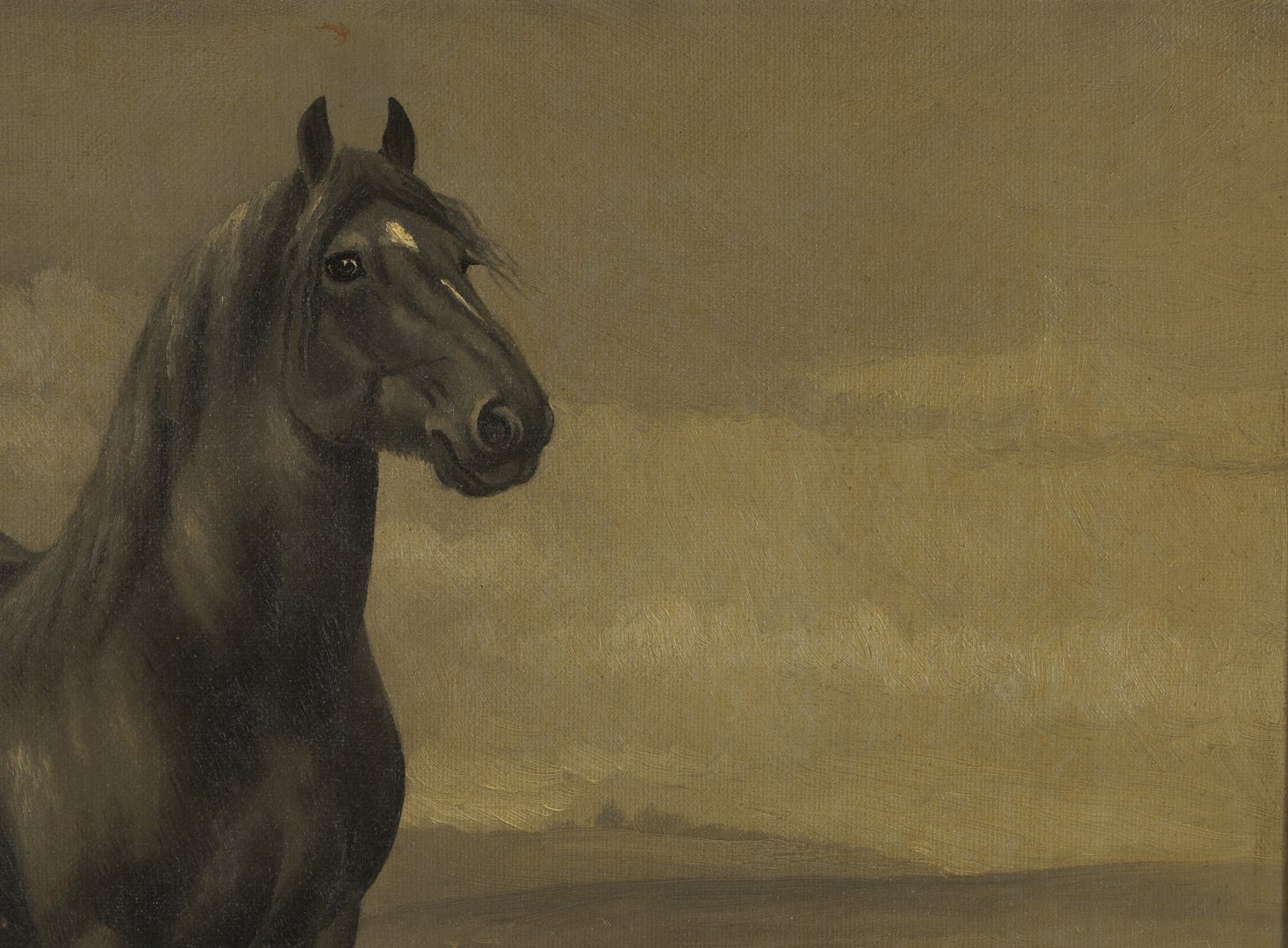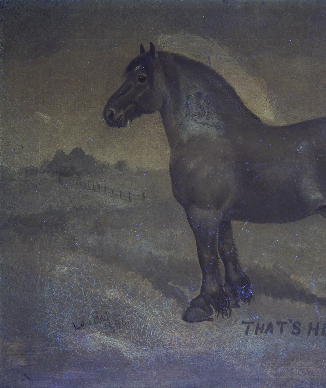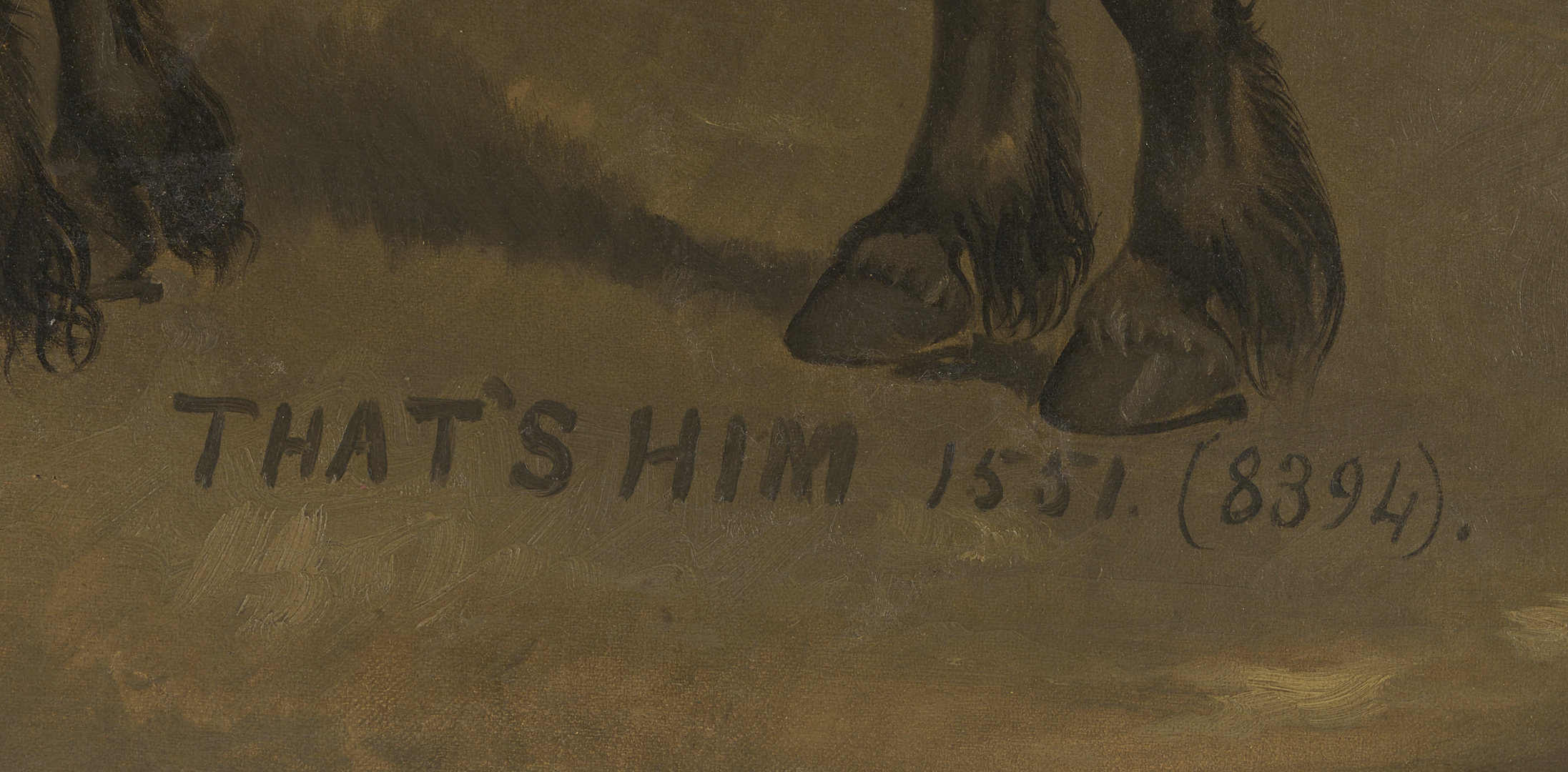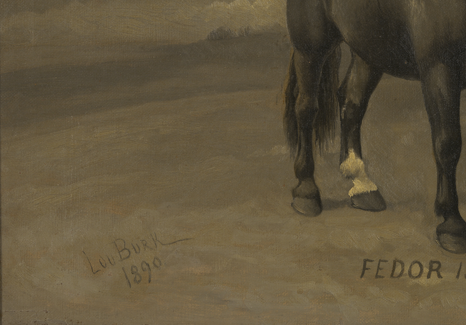 CONDITION: Both overall good condition with light craquelure. “Fedor”: Small 1/4 in. flake upper center above horse’s head. “That’s Him”: Canvas has been affixed to wax paper backing. With retouch to minor loss in sky above neck, 1/2 in. x 1/8 in., and possible old retouch to neck. Three small holes up to 1/8 in. diameter upper right quadrant, background. Four small holes (about 1/16 in. ea.) to center right, affecting horse’s haunch and grass area. Extraneous white paint drip lower right corner. 1/4 in. flake lower left.