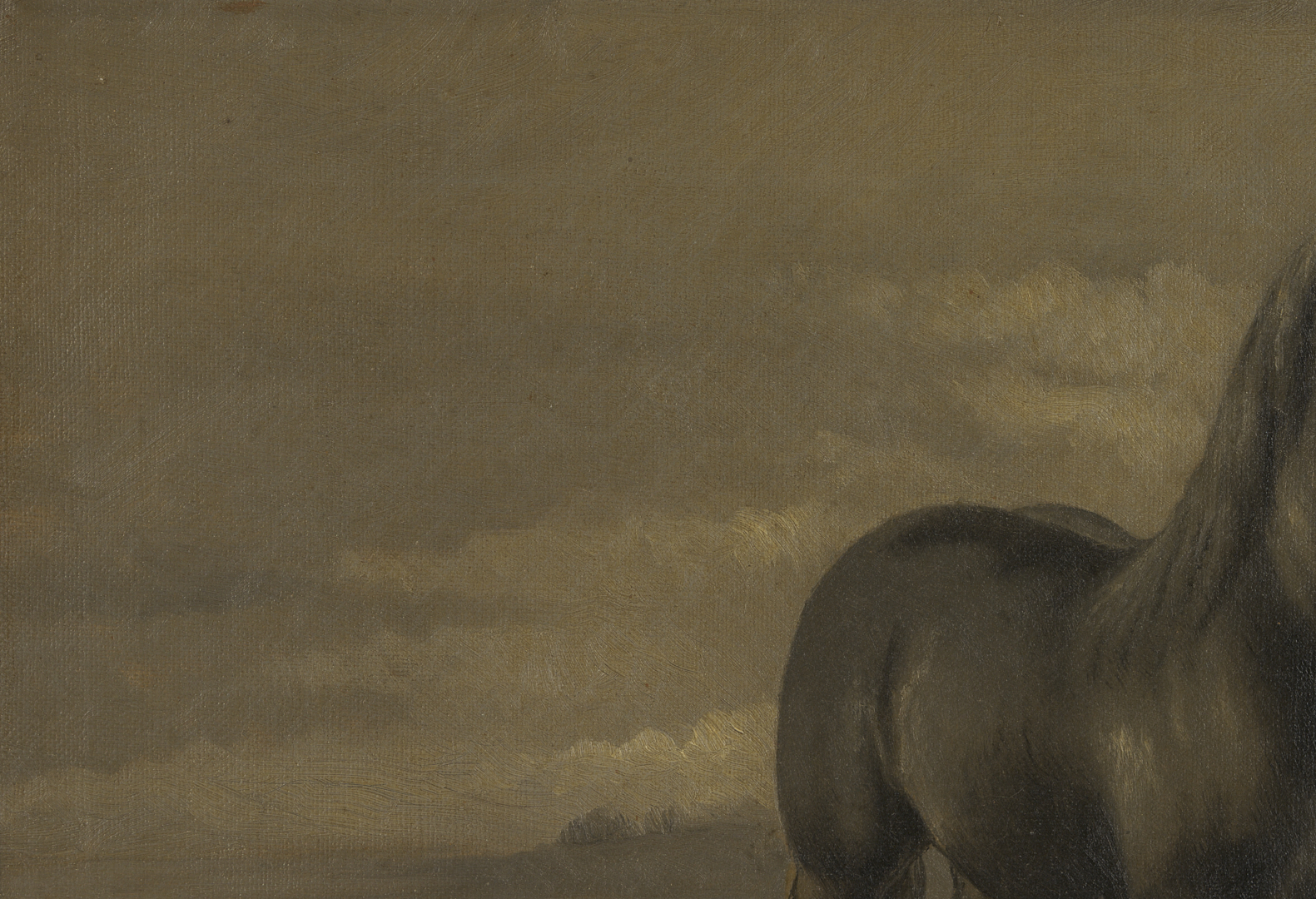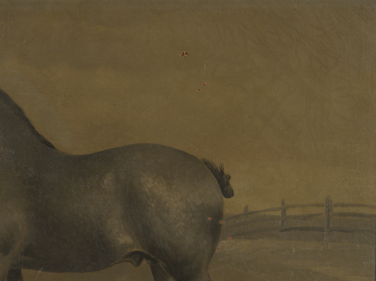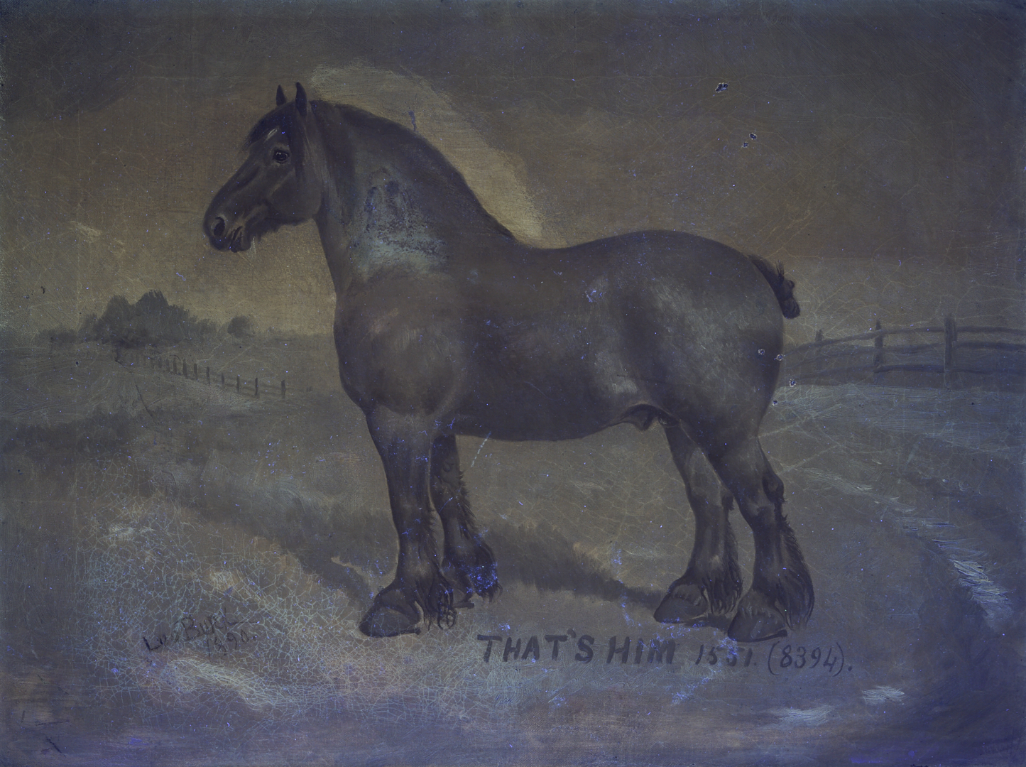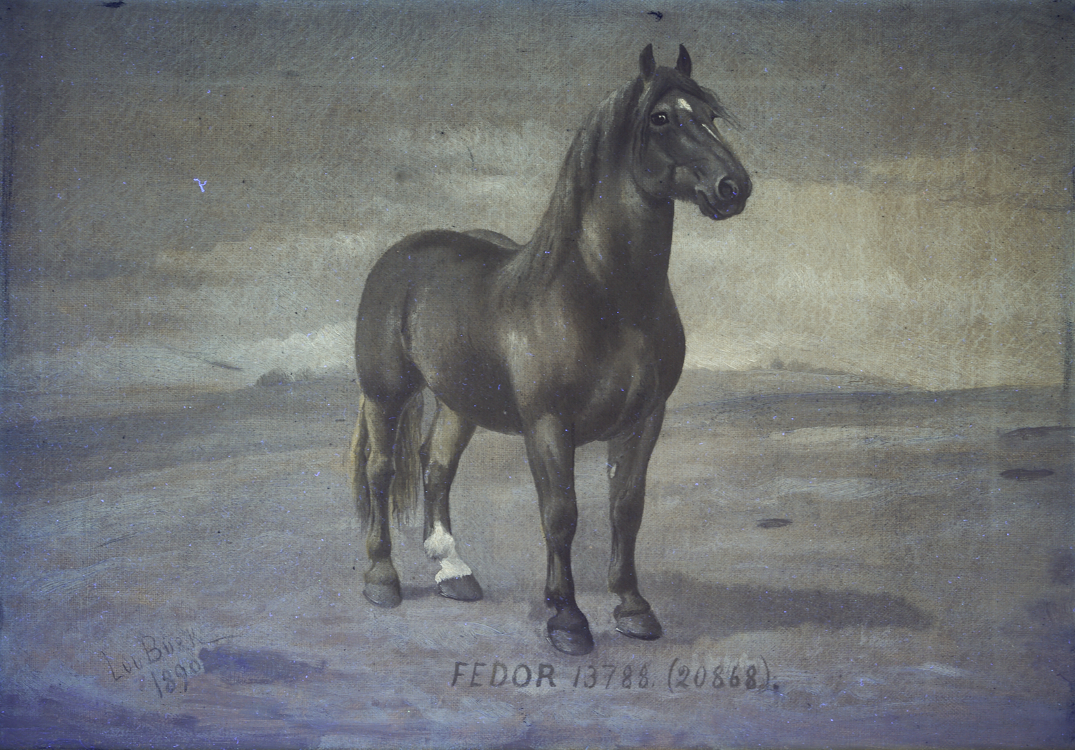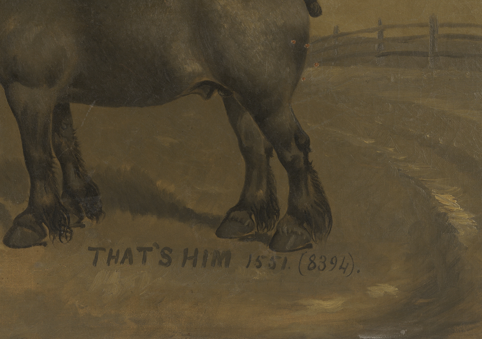 CONDITION: Both overall good condition with light craquelure. “Fedor”: Small 1/4 in. flake upper center above horse’s head. “That’s Him”: Canvas has been affixed to wax paper backing. With retouch to minor loss in sky above neck, 1/2 in. x 1/8 in., and possible old retouch to neck. Three small holes up to 1/8 in. diameter upper right quadrant, background. Four small holes (about 1/16 in. ea.) to center right, affecting horse’s haunch and grass area. Extraneous white paint drip lower right corner. 1/4 in. flake lower left.
