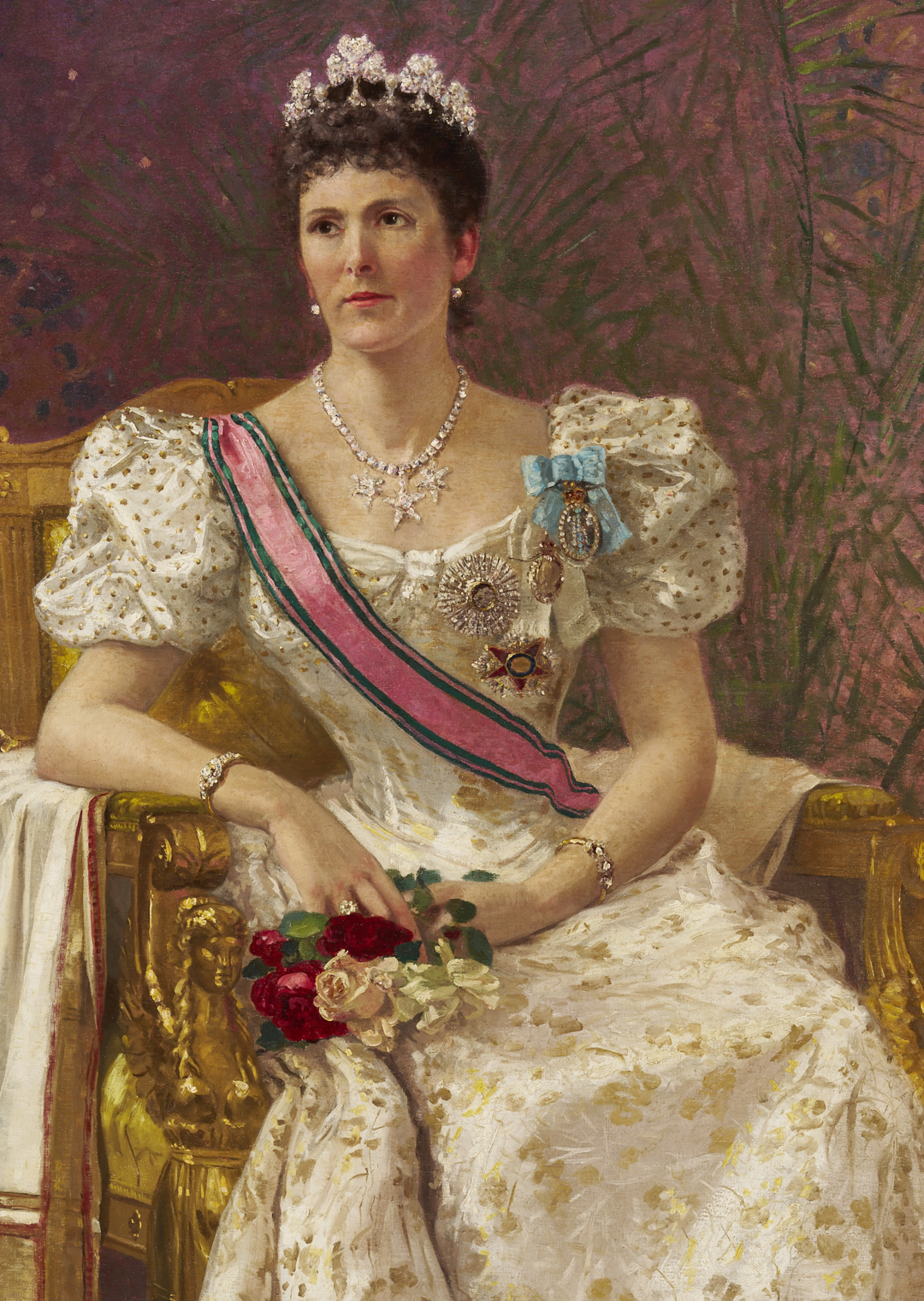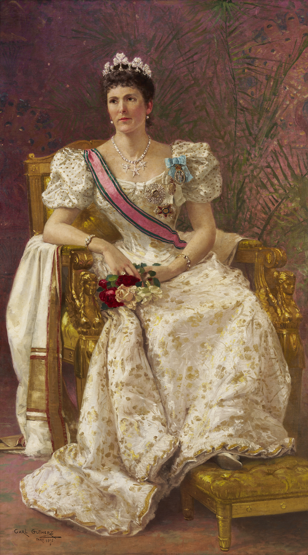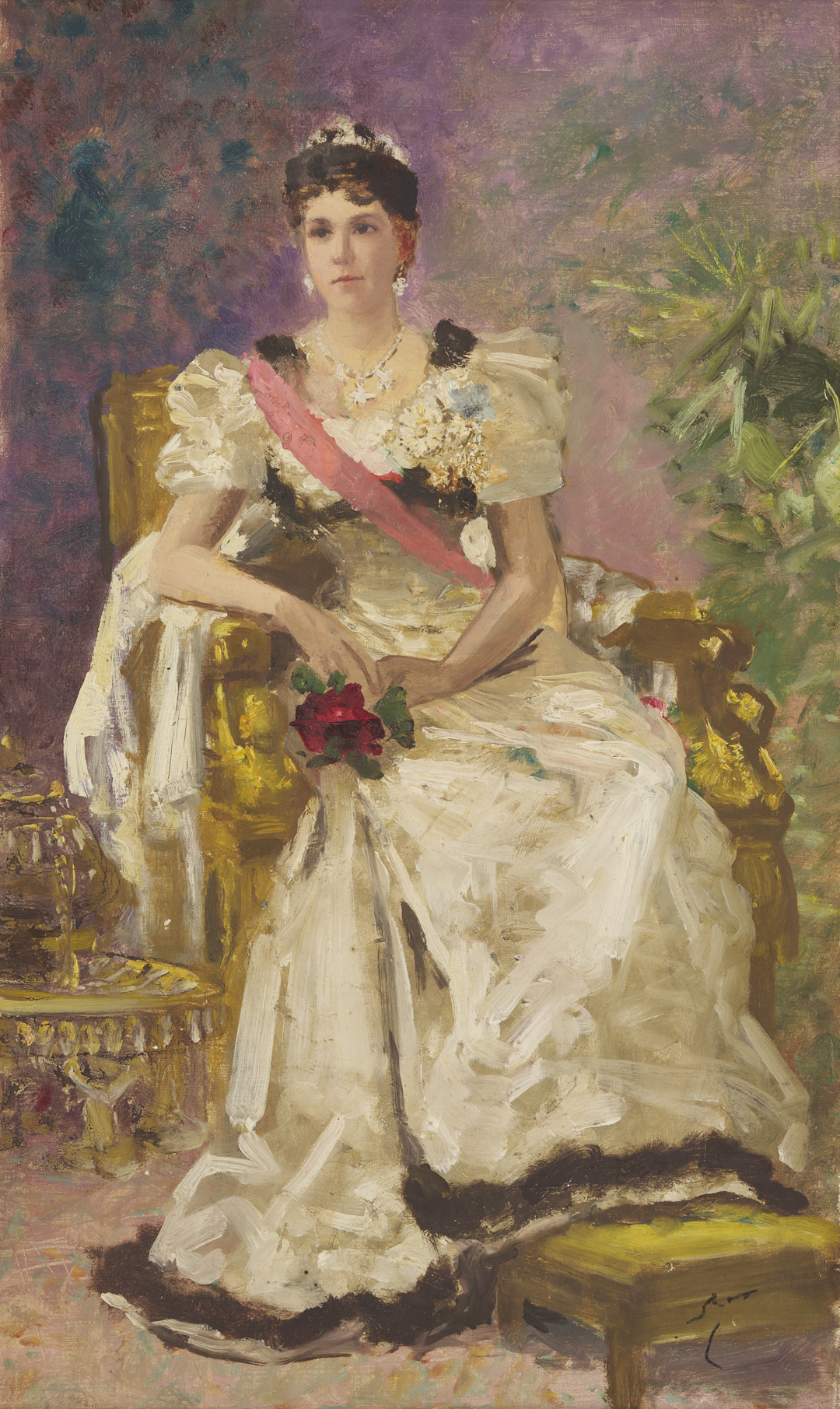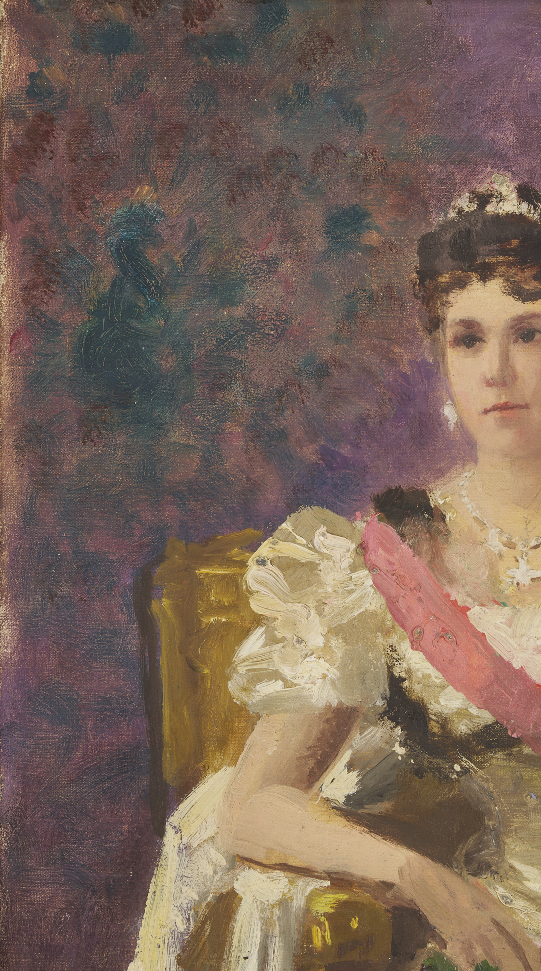 Carl Gutherz or Guthers (Tennessee/Missouri, 1844-1907) oil on canvas full length portrait of Lady Dufferin, Vicereine of India, 1893. She wears the Dufferin and Ava diamond and pearl shamrock tiara and diamond star necklace (without the parure’s matching earrings), along with other jewels and badges of orders, and is seated in a large gilded armchair with her feet resting on a footstool. Although this painting was executed after Lady Dufferin’s departure from British India in 1888, the palm fronds behind her suggest her time there and her accomplishments as Vicereine. Signed lower right. Housed in a molded gilt wood frame. Sight: 73 in H x 41 in. W. Framed: 80 in H x 48 in W. Literature: CARL GUTHERZ: POETIC VISION AND ACADEMIC IDEALS, eds. Marilyn Masler and Marina Pacini (Memphis, TN: Memphis Brooks Museum of Art, 2009), no. 39. Lot also includes Gutherz’s oil on canvas study for the portrait of Lady Dufferin. Here, she wears the complete diamond star necklace and earring parure (the earrings were not included in the final portrait). Housed in a molded gilt wood frame. Sight: 17 3/8 in. H x 10 3/8 in. W. Framed: 19 1/4 in. H x 12 3/8 in. W. Historical Note: In 1884, Lady Dufferin, the Marquess of Dufferin and Ava, also known as Hariot Georgina Hamilton-Temple-Blackwood, accompanied her husband to India when he was appointed Viceroy by Queen Victoria. At the suggestion of the Queen, she took a keen interest in the welfare of Indian women and recognized the need for improved medical care. She established the Countess of Dufferin Fund in 1885, which aimed to train female doctors and nurses and provide them with opportunities to work in India. The fund also supported the establishment of hospitals and dispensaries specifically for women. The Countess of Dufferin Fund played a significant role in improving healthcare access for women in India and paved the way for future advancements in women’s medical care. The fund also helped British and Irish women enter the medical profession, providing them with opportunities for employment and career advancement. Well-known during her life, Rudyard Kipling’s 1888 “The Song of the Women” commemorates her efforts as Vicereine and King George I of Greece is said to have noted that “there was no lady in Europe who could enter a room like Lady Dufferin.” Today, Lady Dufferin Hospital, a women’s hospital in Karachi, Pakistan, still bears her name. Artist Biography: Guthers, who was born in Switzerland, emigrated as a child to the U.S. in 1851. He lived with his family in Memphis, Tennessee, through the Civil War and then studied at the Ecole des Beaux Arts in Paris and the Academie Julian, as well as in Munich, Brussels, and Rome. In 1875 moved to St. Louis, Missouri, where he taught at Washington University and helped establish the St. Louis School and Museum of Fine Arts. Gutherz continued to take portrait commissions from Memphis, however, and even designed costumes and floats for the annual Memphis Mardi Gras. In 1884 he returned to Paris, where he studied with Gustave Boulanger and Joseph LeFevre. Here, he became associated with the Symbolist movement and produced his most successful paintings including large allegorical works, often featuring Christian imagery. Back in the U.S. he was hired to create murals for institutions including the Library of Congress, the People’s Church of St. Paul Minnesota, and the Allen County (Indiana) Courthouse. A year before his death, he produced a design for an arts and sciences pavilion which was the basis for the development of the Brooks Memorial Art Gallery, later the Memphis Brooks Museum of Art. Source: The Tennessee Encyclopedia.