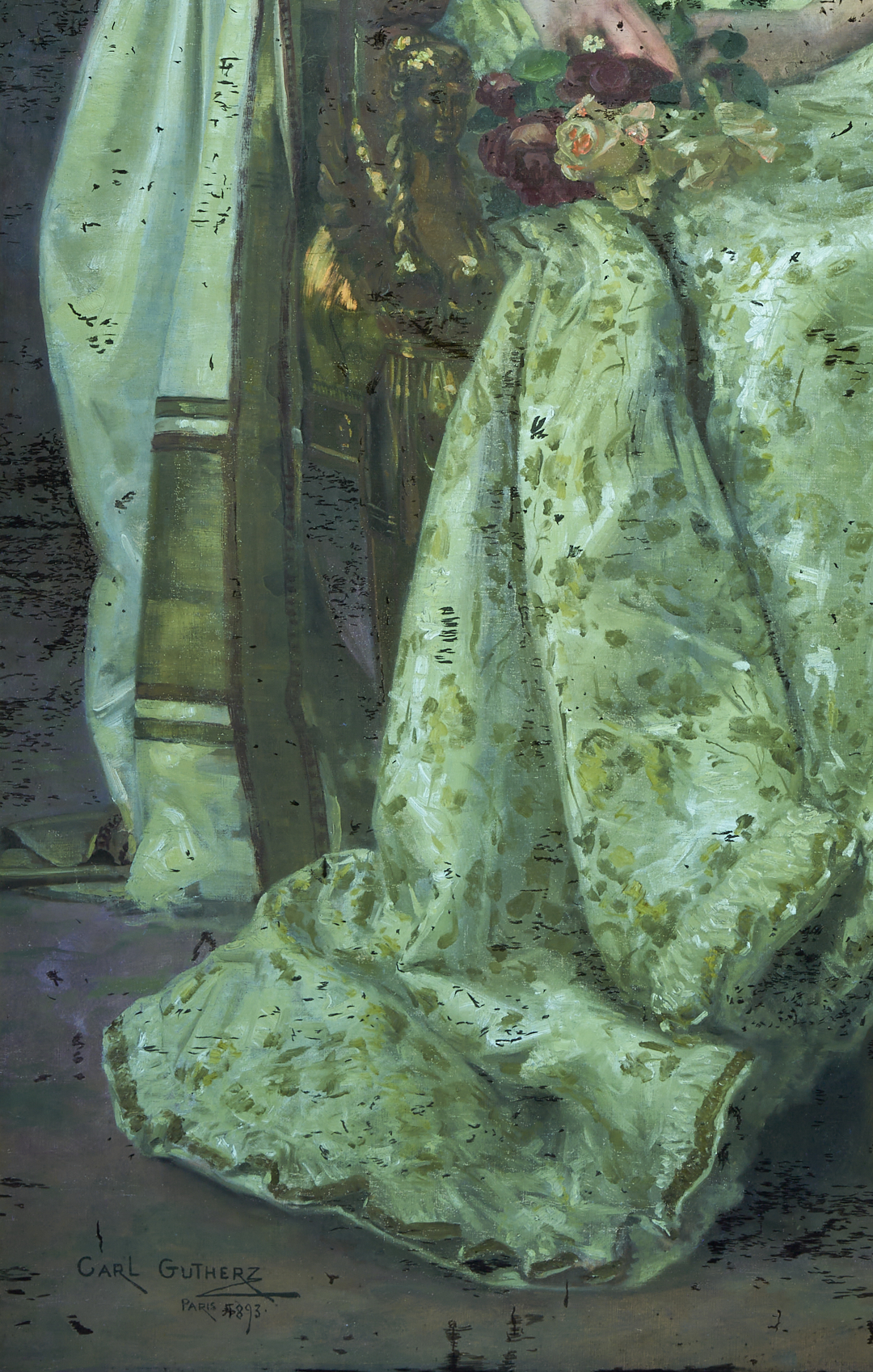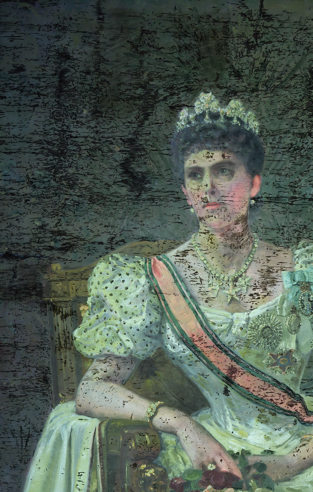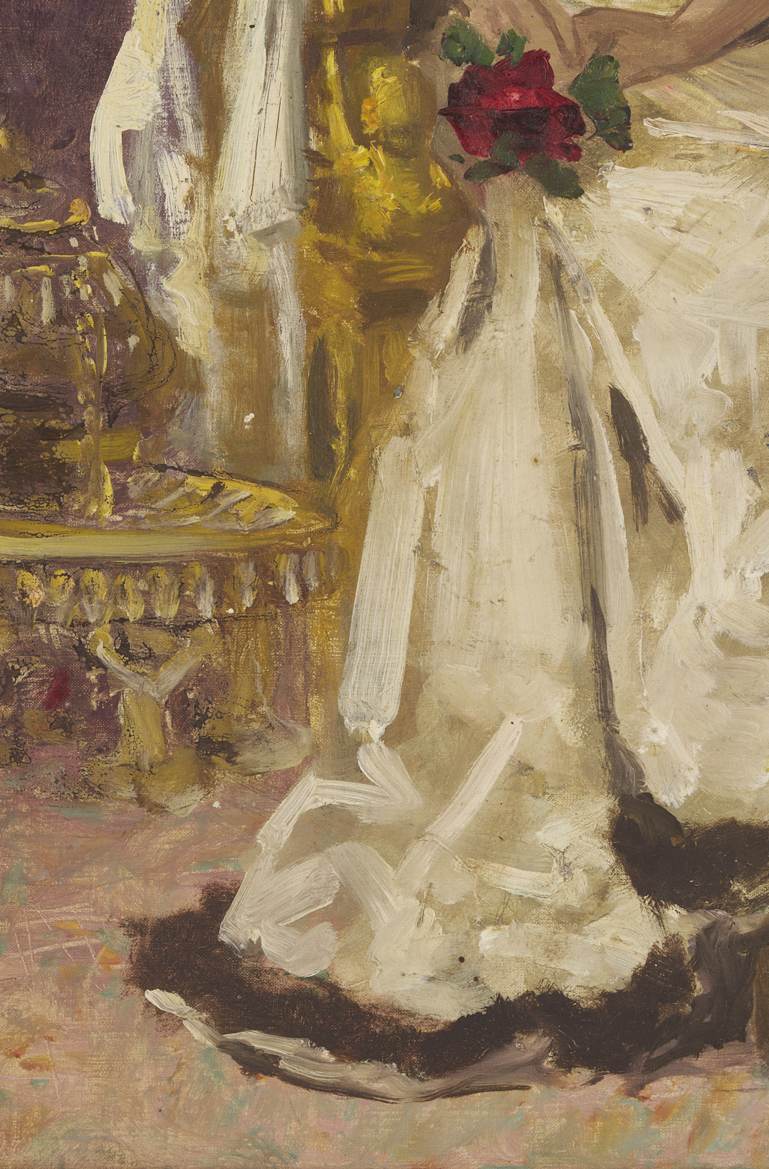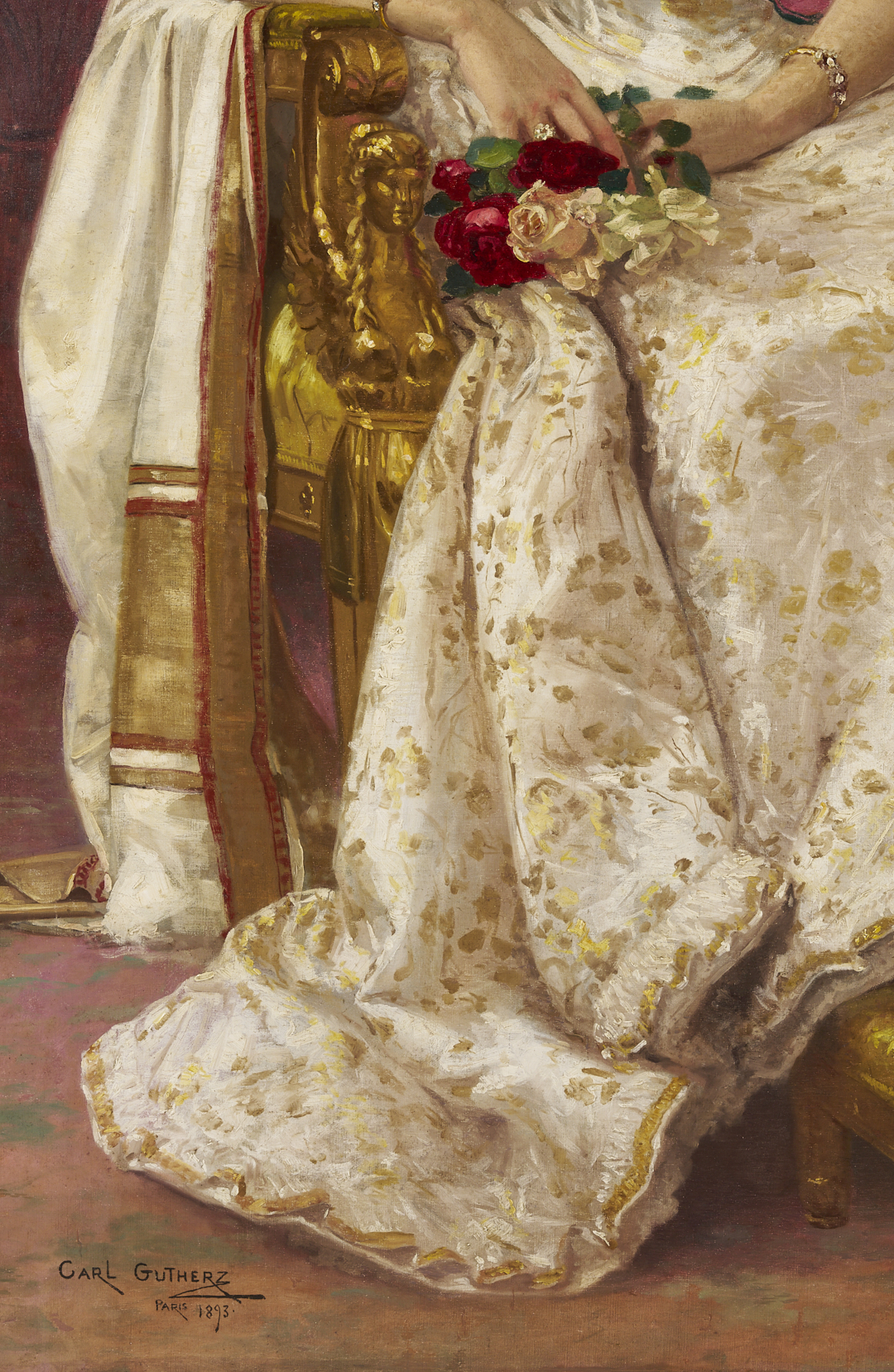 Carl Gutherz or Guthers (Tennessee/Missouri, 1844-1907) oil on canvas full length portrait of Lady Dufferin, Vicereine of India, 1893. She wears the Dufferin and Ava diamond and pearl shamrock tiara and diamond star necklace (without the parure’s matching earrings), along with other jewels and badges of orders, and is seated in a large gilded armchair with her feet resting on a footstool. Although this painting was executed after Lady Dufferin’s departure from British India in 1888, the palm fronds behind her suggest her time there and her accomplishments as Vicereine. Signed lower right. Housed in a molded gilt wood frame. Sight: 73 in H x 41 in. W. Framed: 80 in H x 48 in W. Literature: CARL GUTHERZ: POETIC VISION AND ACADEMIC IDEALS, eds. Marilyn Masler and Marina Pacini (Memphis, TN: Memphis Brooks Museum of Art, 2009), no. 39. Lot also includes Gutherz’s oil on canvas study for the portrait of Lady Dufferin. Here, she wears the complete diamond star necklace and earring parure (the earrings were not included in the final portrait). Housed in a molded gilt wood frame. Sight: 17 3/8 in. H x 10 3/8 in. W. Framed: 19 1/4 in. H x 12 3/8 in. W. Historical Note: In 1884, Lady Dufferin, the Marquess of Dufferin and Ava, also known as Hariot Georgina Hamilton-Temple-Blackwood, accompanied her husband to India when he was appointed Viceroy by Queen Victoria. At the suggestion of the Queen, she took a keen interest in the welfare of Indian women and recognized the need for improved medical care. She established the Countess of Dufferin Fund in 1885, which aimed to train female doctors and nurses and provide them with opportunities to work in India. The fund also supported the establishment of hospitals and dispensaries specifically for women. The Countess of Dufferin Fund played a significant role in improving healthcare access for women in India and paved the way for future advancements in women’s medical care. The fund also helped British and Irish women enter the medical profession, providing them with opportunities for employment and career advancement. Well-known during her life, Rudyard Kipling’s 1888 “The Song of the Women” commemorates her efforts as Vicereine and King George I of Greece is said to have noted that “there was no lady in Europe who could enter a room like Lady Dufferin.” Today, Lady Dufferin Hospital, a women’s hospital in Karachi, Pakistan, still bears her name. Artist Biography: Guthers, who was born in Switzerland, emigrated as a child to the U.S. in 1851. He lived with his family in Memphis, Tennessee, through the Civil War and then studied at the Ecole des Beaux Arts in Paris and the Academie Julian, as well as in Munich, Brussels, and Rome. In 1875 moved to St. Louis, Missouri, where he taught at Washington University and helped establish the St. Louis School and Museum of Fine Arts. Gutherz continued to take portrait commissions from Memphis, however, and even designed costumes and floats for the annual Memphis Mardi Gras. In 1884 he returned to Paris, where he studied with Gustave Boulanger and Joseph LeFevre. Here, he became associated with the Symbolist movement and produced his most successful paintings including large allegorical works, often featuring Christian imagery. Back in the U.S. he was hired to create murals for institutions including the Library of Congress, the People’s Church of St. Paul Minnesota, and the Allen County (Indiana) Courthouse. A year before his death, he produced a design for an arts and sciences pavilion which was the basis for the development of the Brooks Memorial Art Gallery, later the Memphis Brooks Museum of Art. Source: The Tennessee Encyclopedia.