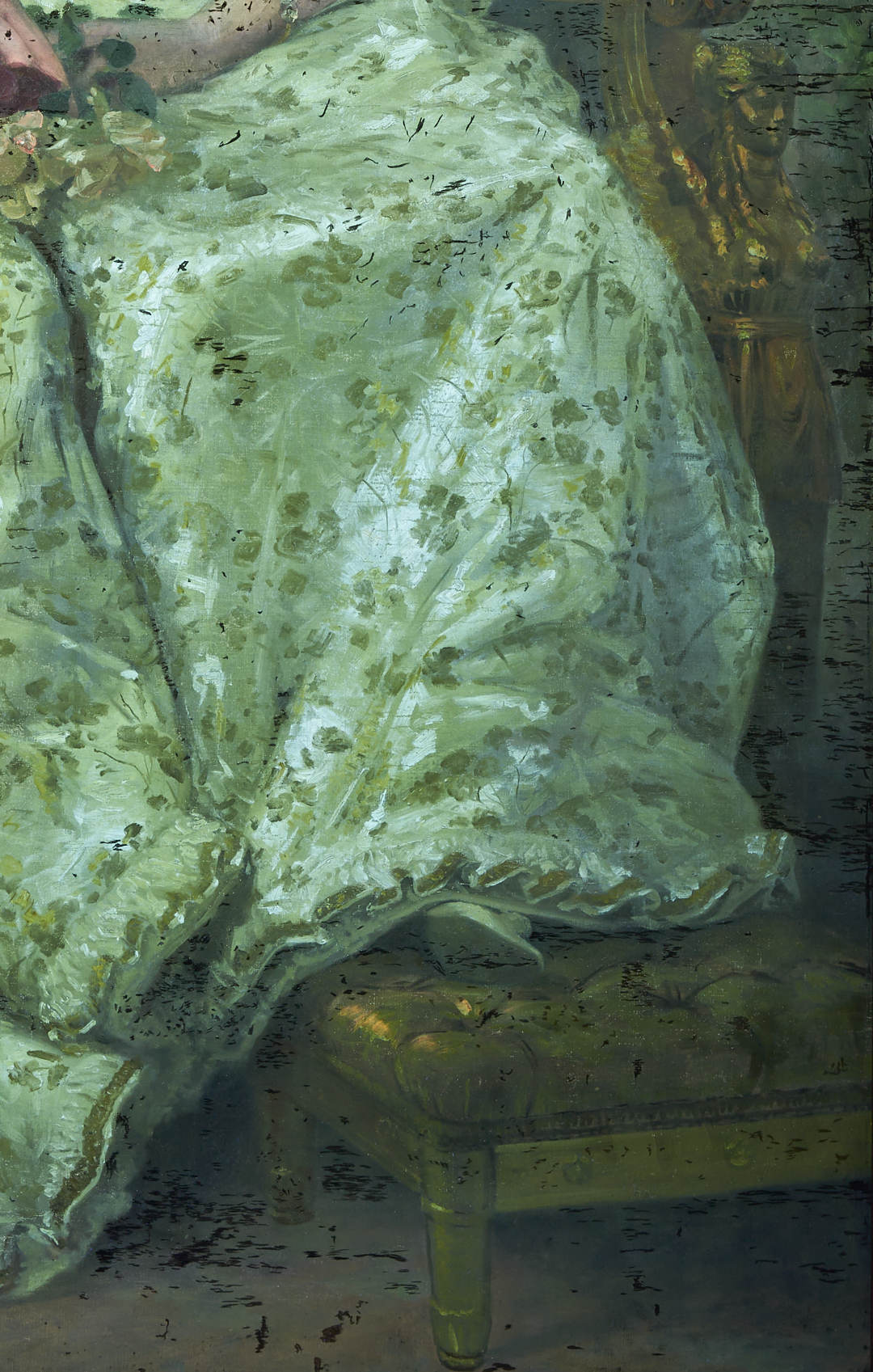 CONDITION: Final portrait canvas has been relined and affixed to new stretcher. With extensive retouching throughout, primarily to background. See UV photography. Study in overall very good condition. With black, painted lines to lower right. Canvas has been affixed to a new stretcher, not relined.