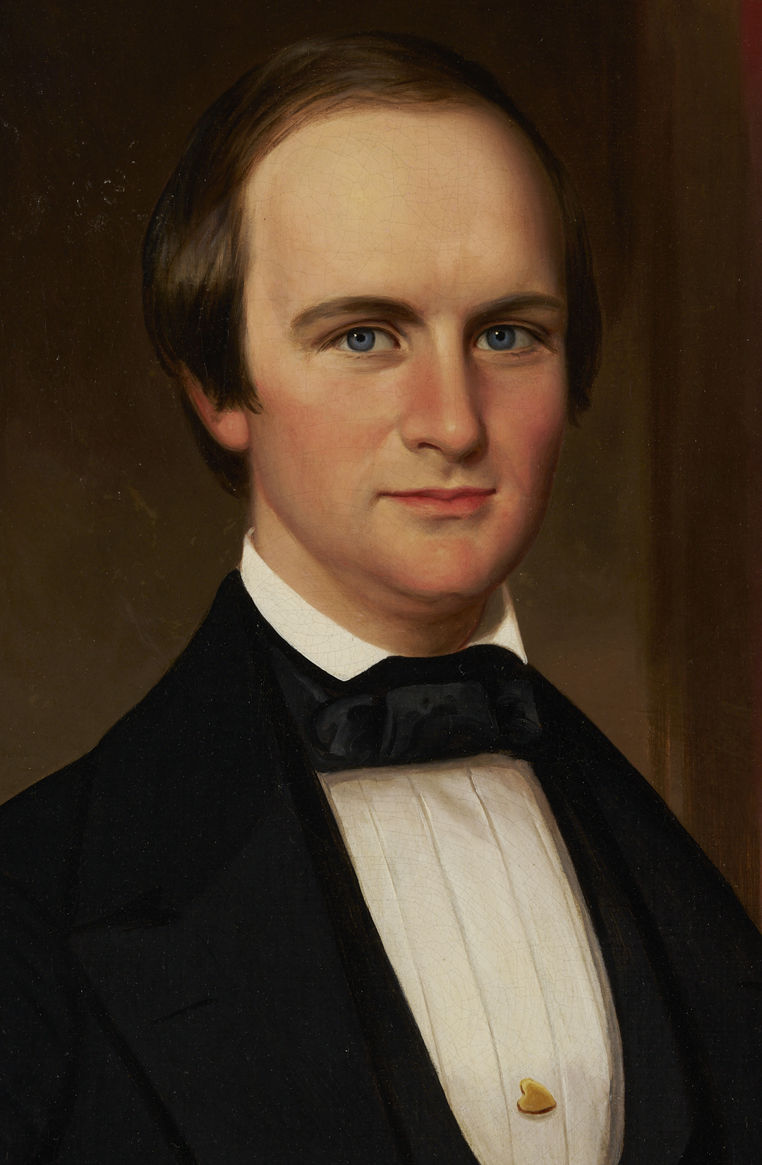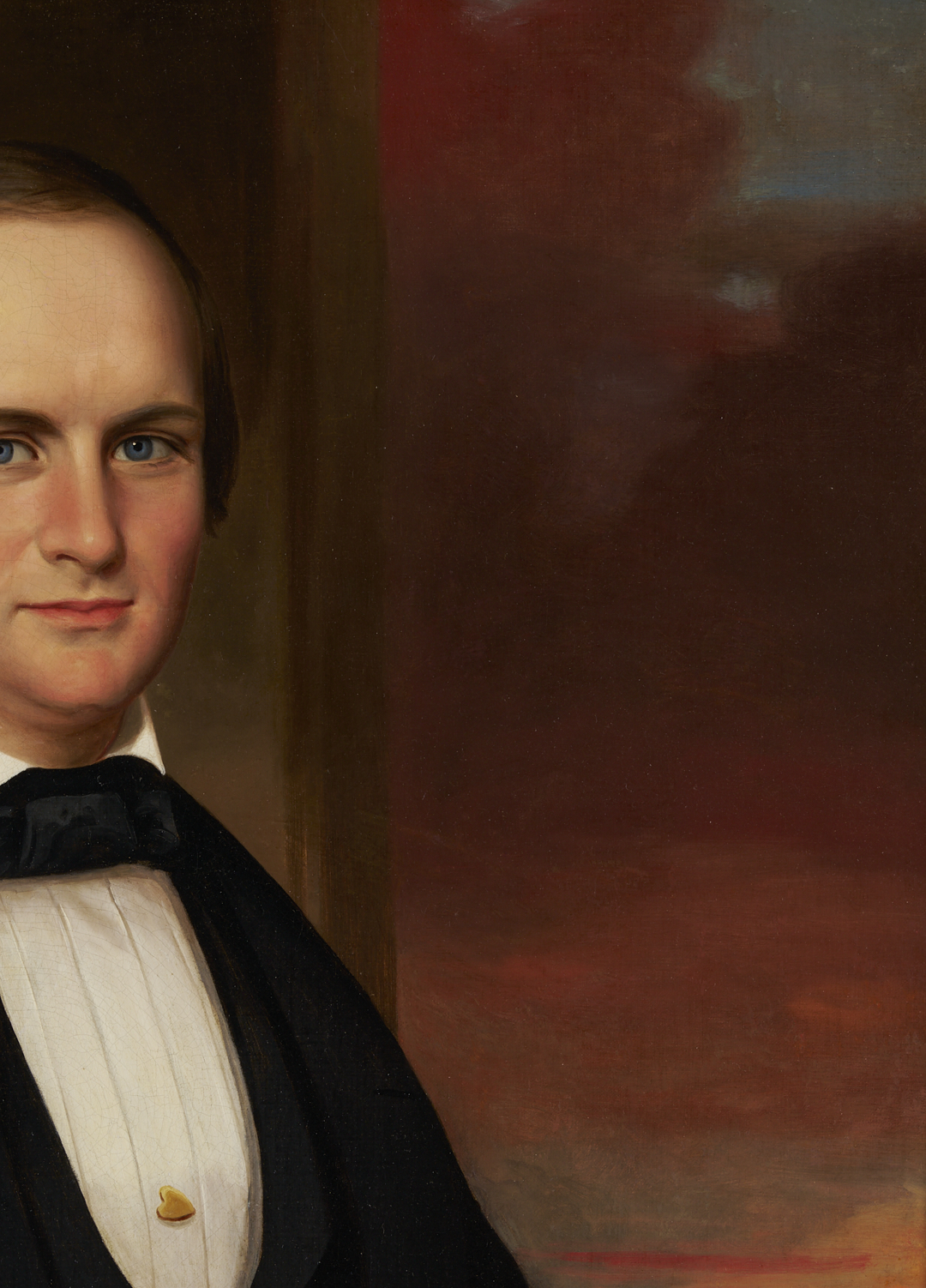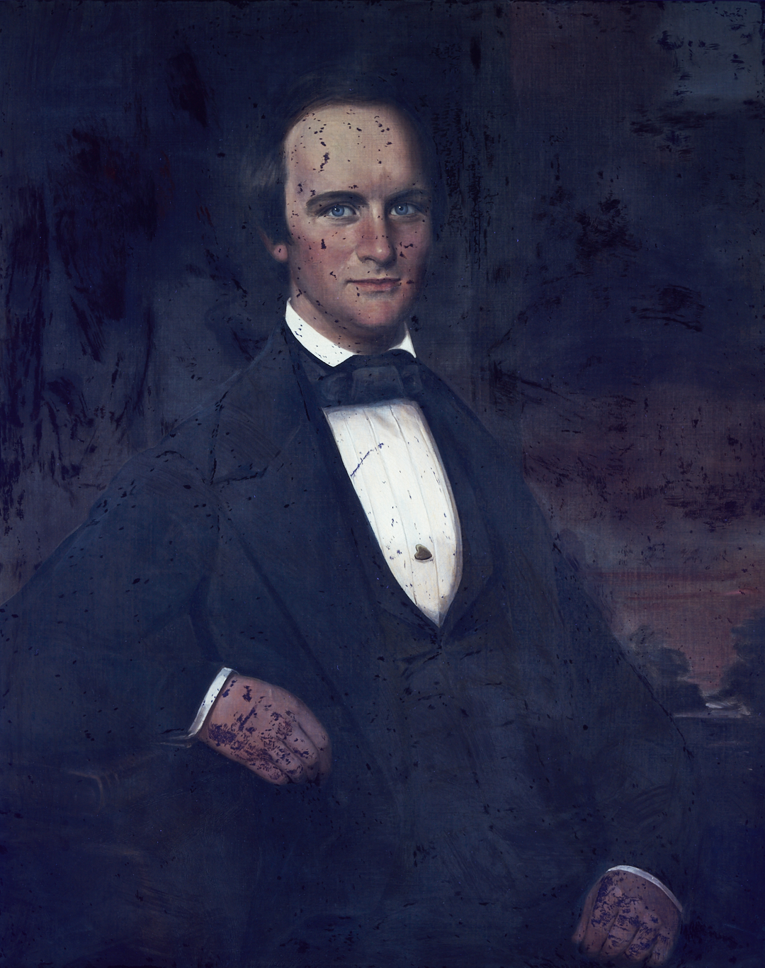 William Browning Cooper (Tennessee, 1811-1900), three-quarter length oil on canvas portrait depicting Tennessee senator Henry Cooper (1827-1884). The painting, probably made about the time of his marriage in 1850, portrays Cooper seated and wearing a black suit and cravat and gold heart pin, with his left arm resting on a book atop a draped table. A sunset landscape is partially visible in the background. Housed in a heavily carved giltwood and gesso Rococo-style frame. Unsigned. Sight: 35 3/8 in. H x 28 1/4 in. W. Framed: 47 1/4 in. H x 40 1/4 in. W. Historical information: Henry Cooper was born on August 22, 1827, in Columbia, Maury County, Tennessee to Lt. Matthew Delamere Cooper and Mary Agnes Cooper. He married Ann Eliza Strickland, whose portrait, also by William Cooper, is also included in this auction (Lot #187). Henry Cooper attended Dixon Academy in Shelbyville and graduated from Jackson College in 1847. After studying law, he was admitted to the bar in 1850 and began practicing in Shelbyville. Cooper served in the Tennessee House of Representatives from 1853 to 1855 and again from 1857 to 1859. As early as 1857, he was a fierce political enemy of Andrew Johnson, even though Johnson had employed Cooper’s brother Edmund as his secretary, and he opposed secession. In April 1862, Henry Cooper was appointed judge of Tennessee’s seventh judicial circuit, a position he held until resigning in January 1866. He then became a professor at the Lebanon Law School from 1866 to 1867 before moving to Nashville, where he returned to private practice. His political career continued in the Tennessee State Senate from 1869 to 1870. In 1871, Cooper was elected as a Democrat to the United States Senate, where he served one full term from March 4, 1871, to March 3, 1877. He chose not to seek renomination in 1876. After leaving the Senate, Cooper pursued mining ventures in Mexico. Tragically, on February 4, 1884, he was killed by bandits in Tierra Blanca, Guadelupe y Calvo, Mexico, where he was living and working at the time (https://bioguide.congress.gov/). Artist biography: William Browning Cooper was born in Smith County, Tennessee. He graduated with honors in 1832 from the National Academy of Design in New York, thanks largely to the financial support of his older brother, fellow Middle Tennessee portraitist Washington Bogart Cooper. He also went to Europe in 1838, studying painting in Italy and France. Cooper returned to Tennessee about 1840 and worked in Memphis, Nashville, Columbia, Pulaski, and Northern Alabama. During and after the Civil War, he also worked in Kentucky. At various times, he also worked in Washington, DC, St. Louis, Chicago , Natchez, New Orleans and Little Rock. Cooper spent his final years in Chattanooga, but is not listed in that city’s business directories. He was struck and killed by a trolley in Chattanooga in 1900 and is buried in Macon, GA. (Source: The Tennessee Historical Quarterly: Vol. XLVI, Winter 1987, “Portrait Painting in Tennessee”).