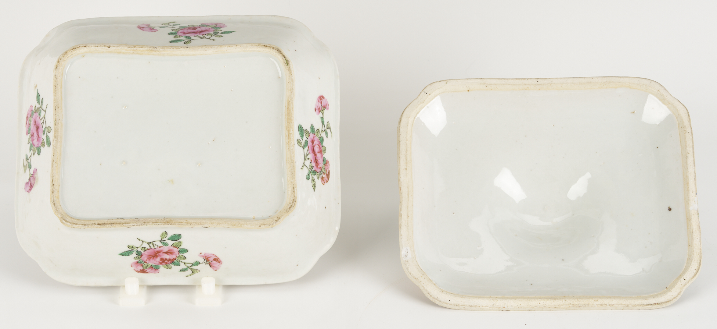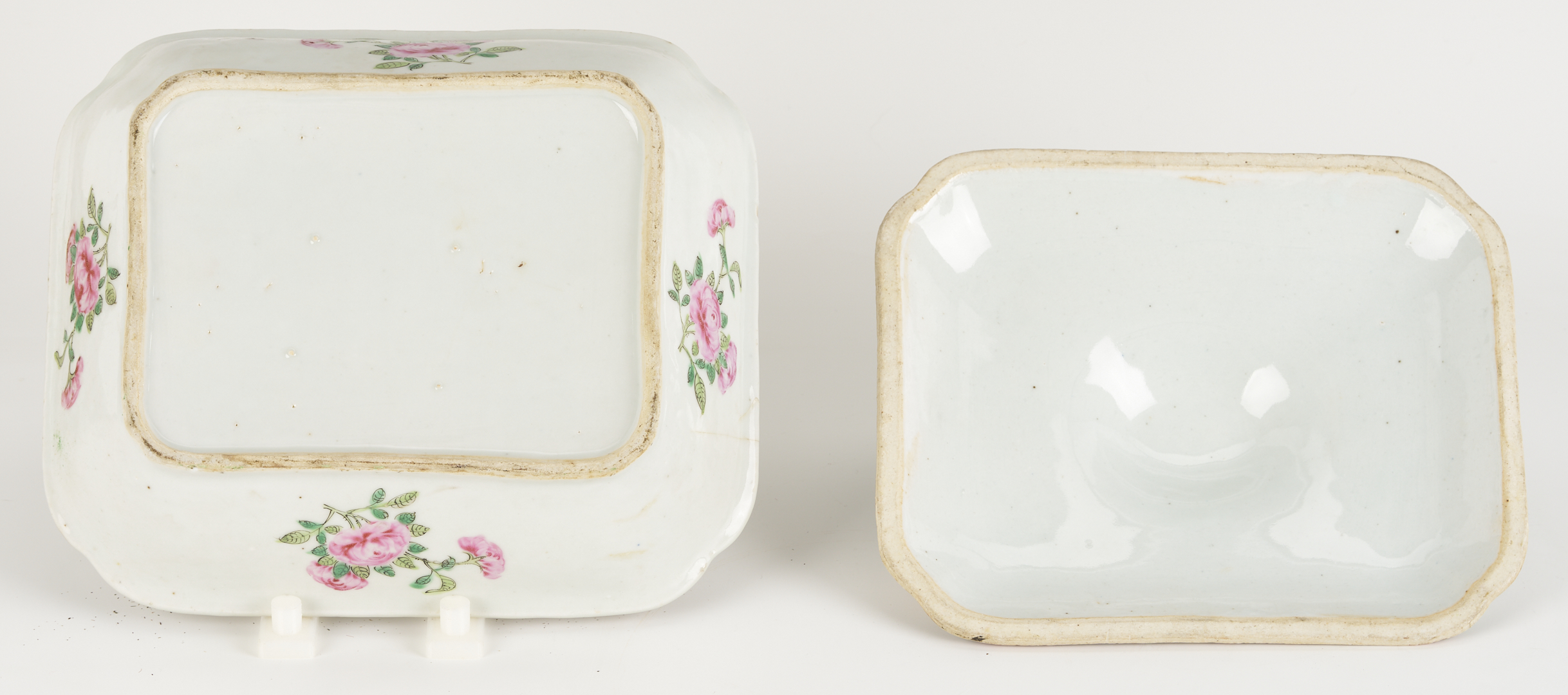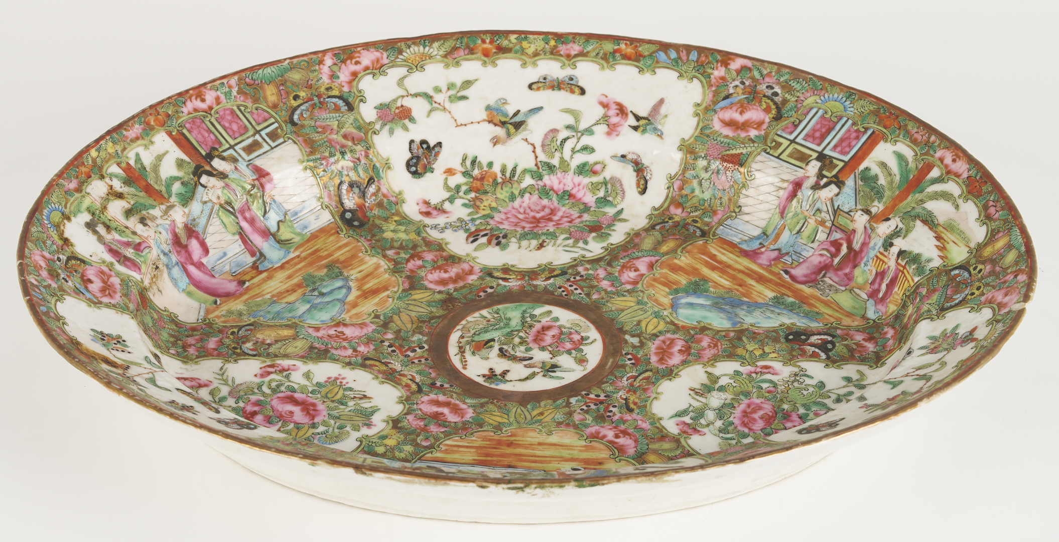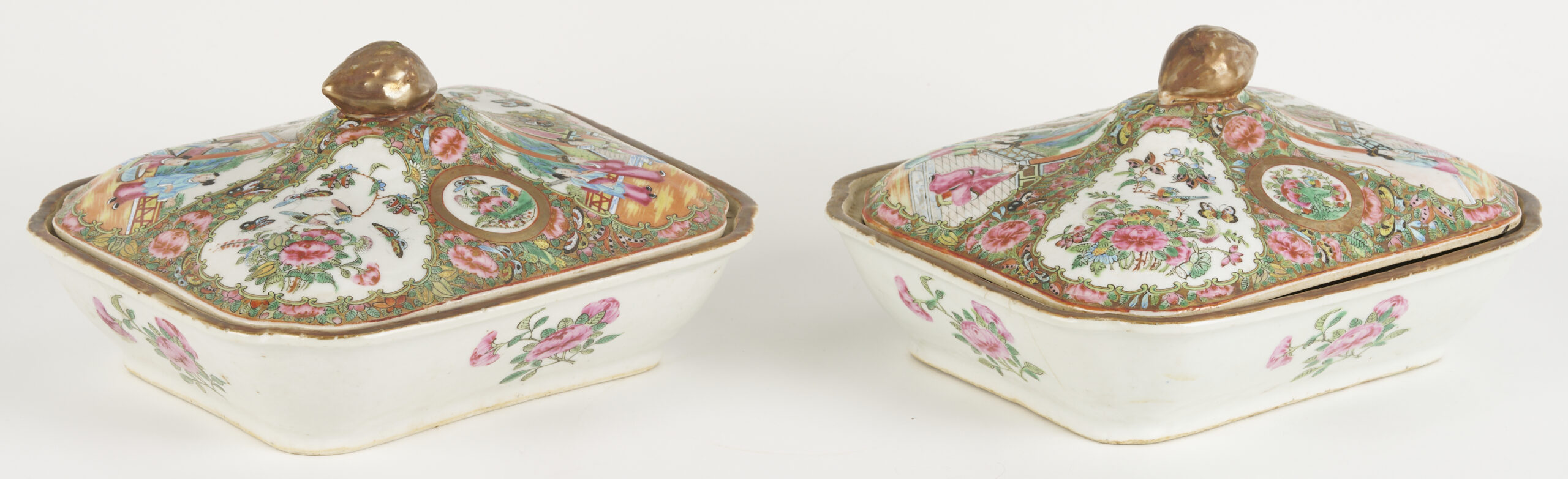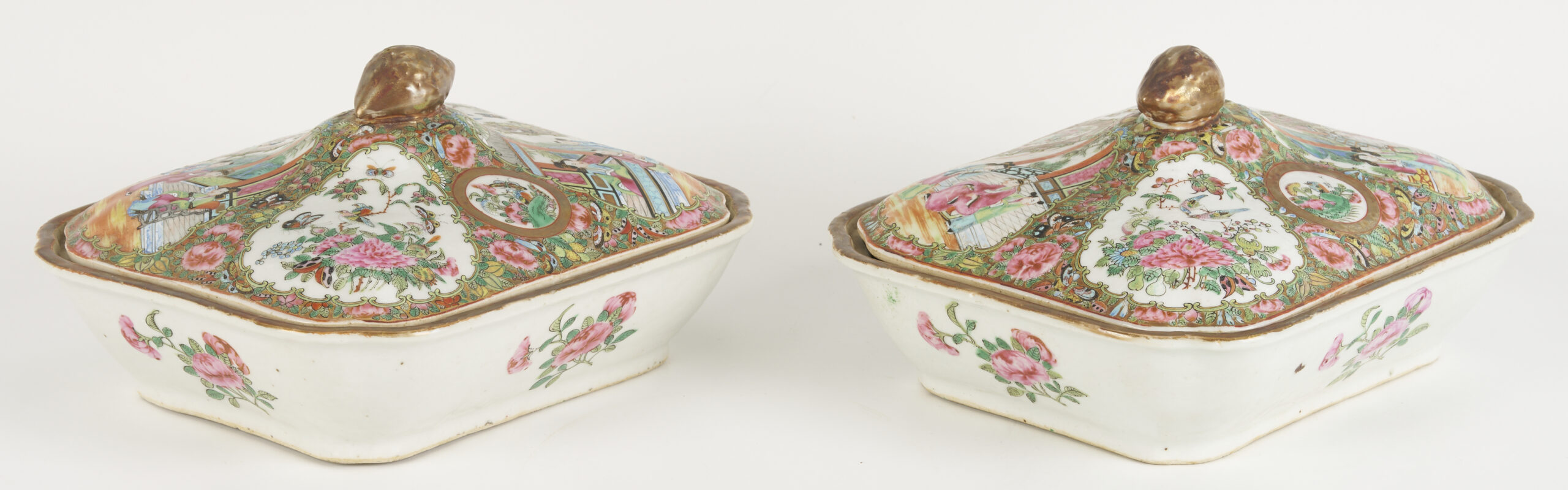 1st item: Chinese Export Rose Medallion porcelain vase with polychrome enamel-decorated vignettes of court scenes, interspersed with bird, floral, and insect motifs. 2 1/8 in. H x 14 in. W x 11 1/2 in. H. 2nd & 3rd items: Pair of Chinese export Rose Medallion porcelain covered entree dishes with polychrome enamel decorated vignettes of court scenes interspersed with bird, floral, and fruit vignettes, decoration repeated on the bowl interior with additional floral decoration to the outer bowl body. Gilt oval finial, shaped rim, and body. 5 in. H x 9 3/8 in. W x 8 in. H. All pieces 19th century.