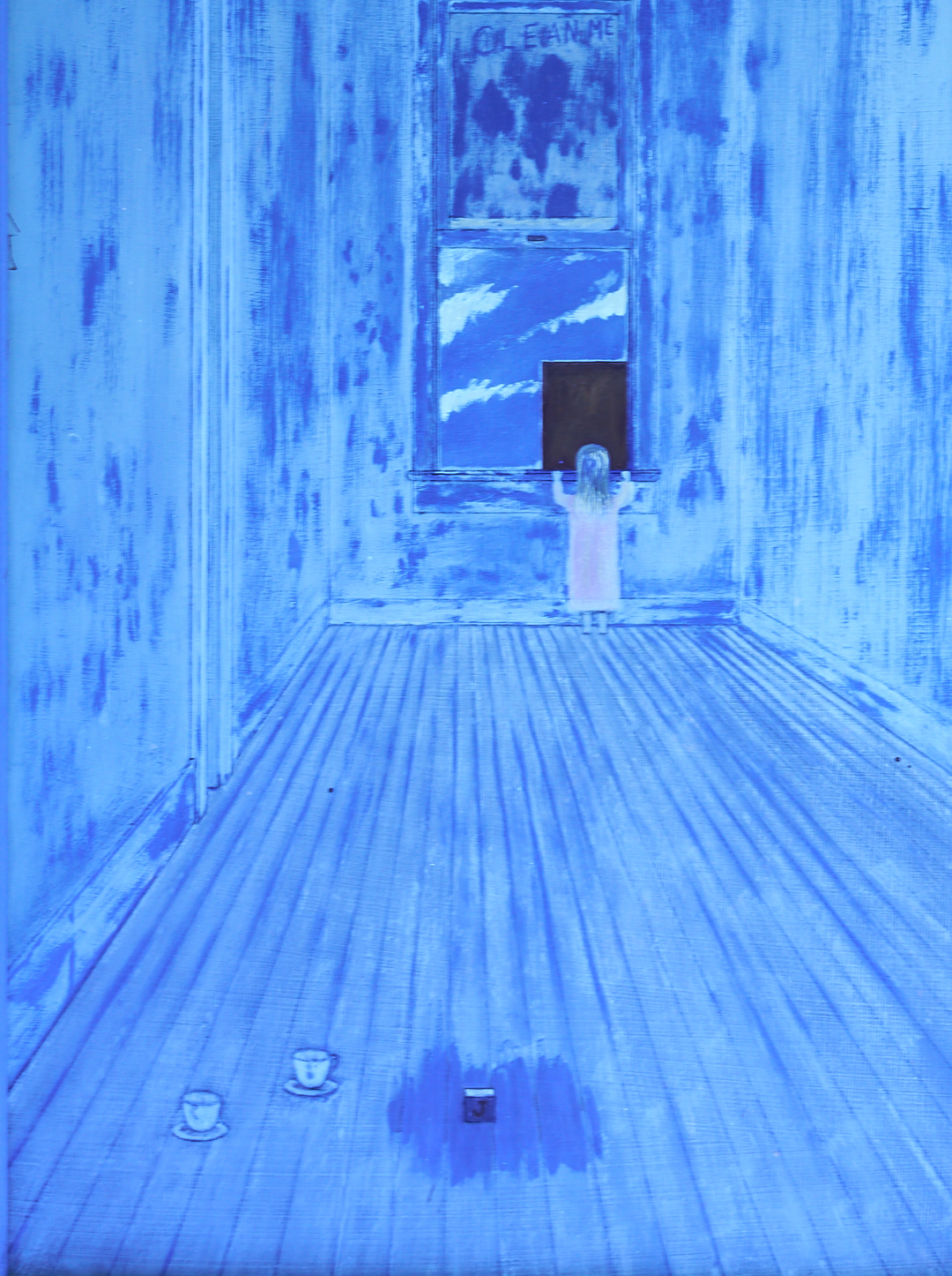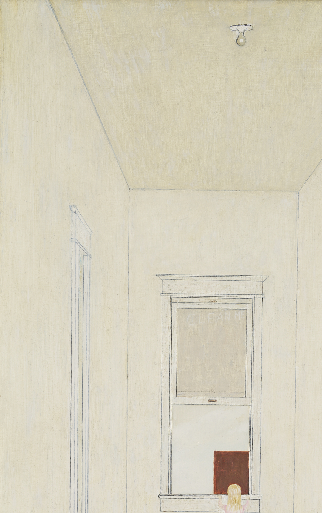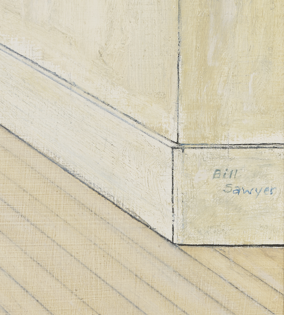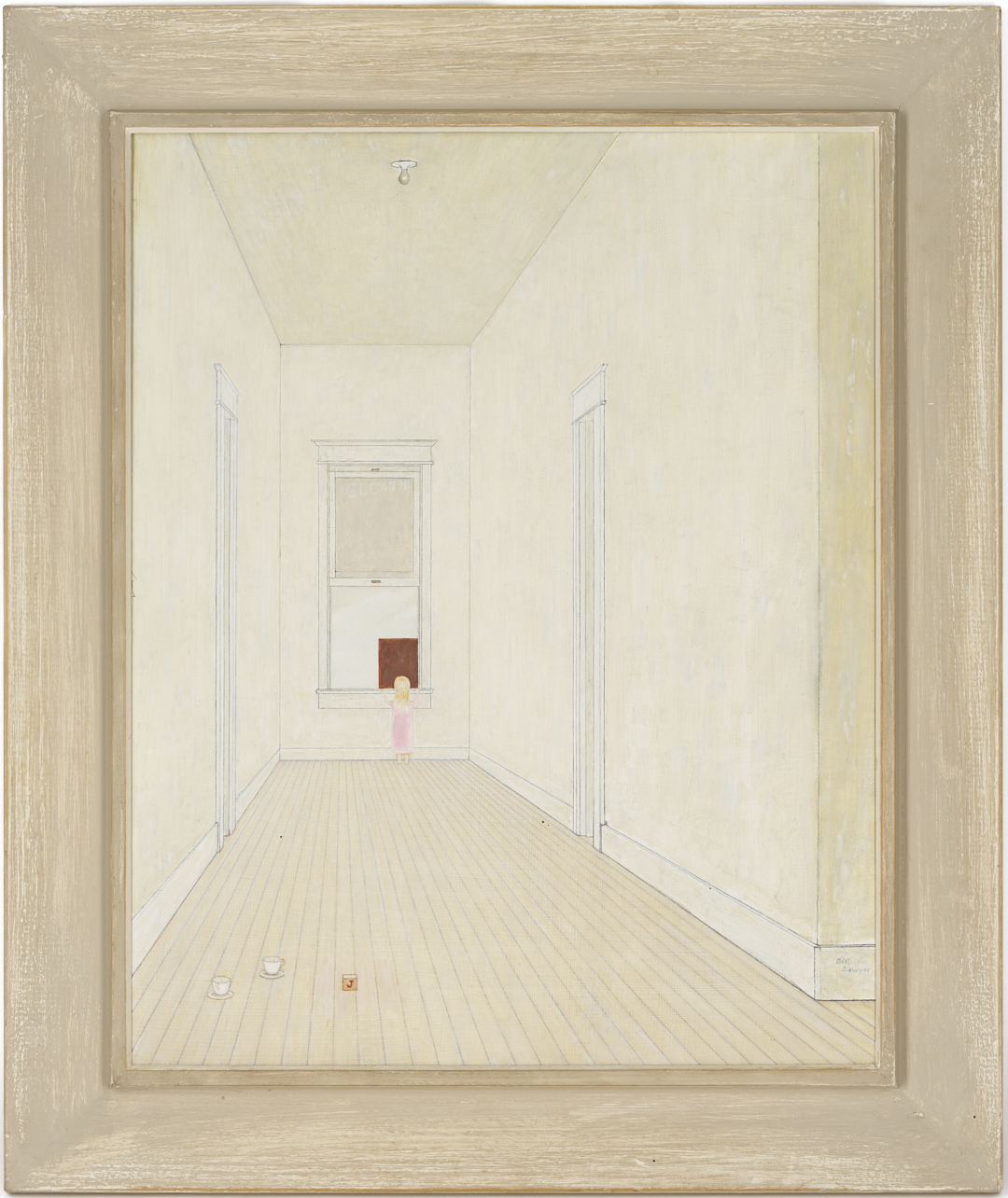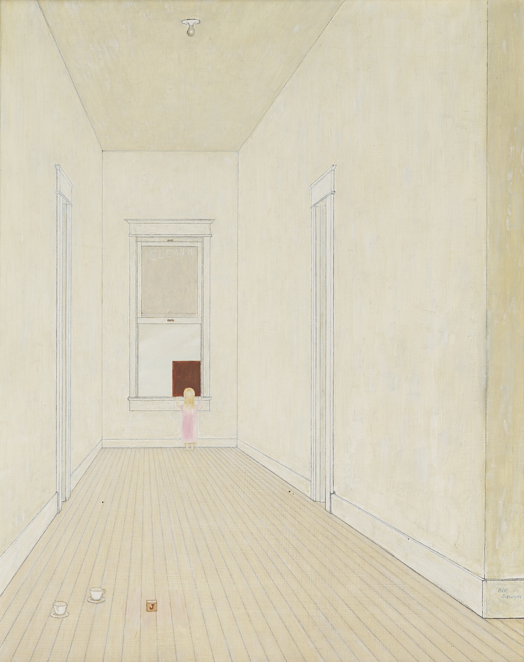 William “Bill” Rozelle Sawyer (American/Tennessee, 1936-2020), oil on board painting of a little girl in a pink dress peering out a window at the end of a long hallway, with her back to the viewer. Only a brick-red square, probably the corner of an adjacent building, hints at what has captured her attention. The words “clean me” are finger-printed onto the glass of the raised sash, and two teacups and a block sit abandoned in the foreground. Signed “Bill Sawyer” lower right. Housed in a beige-painted wooden frame. Sight: 19 1/2 in. H x 15 1/2 in. W. Framed: 25 in. H x 21 in. W.
