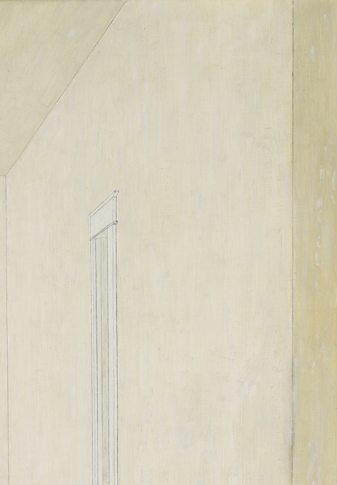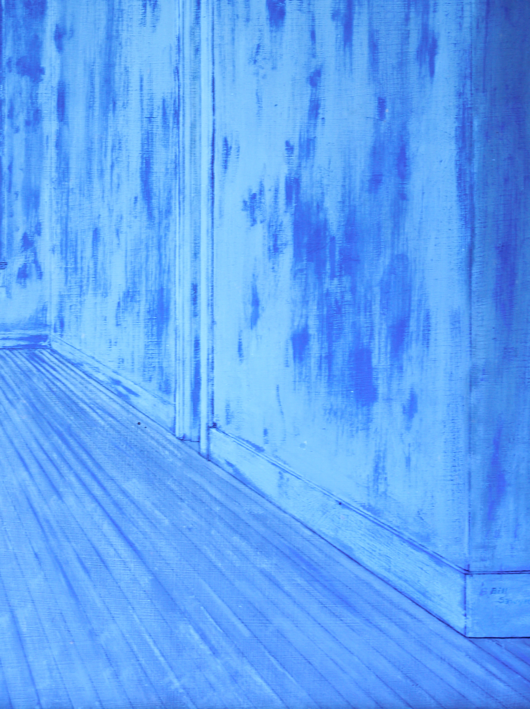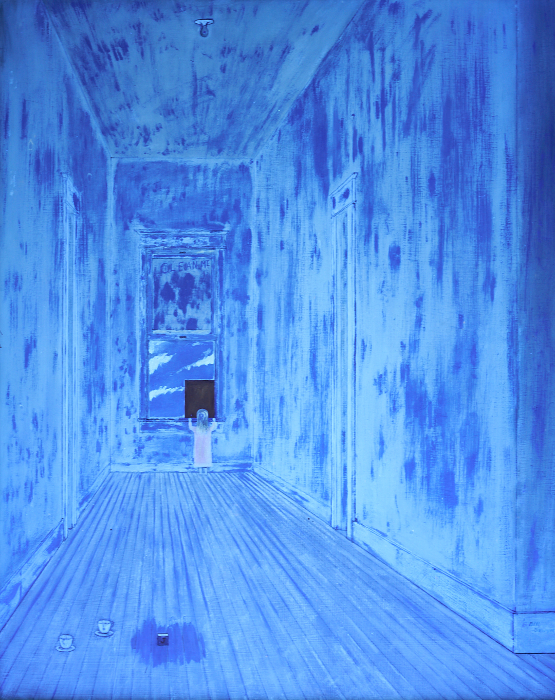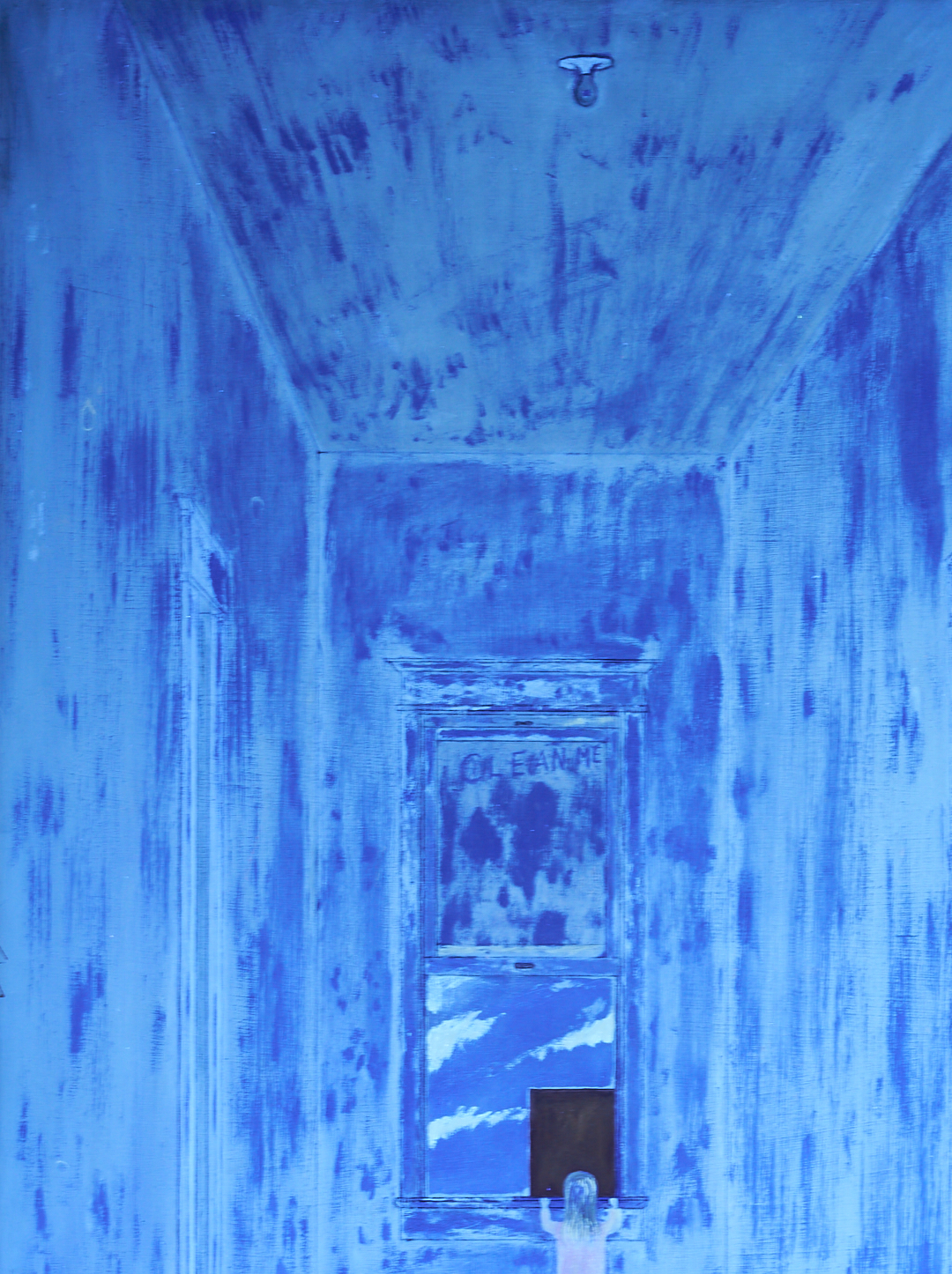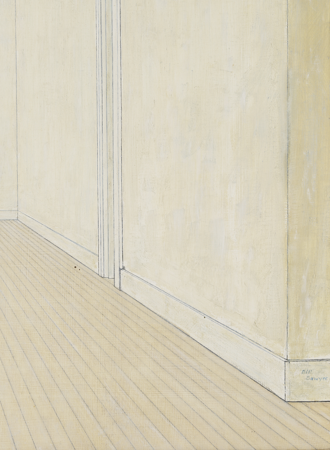 William “Bill” Rozelle Sawyer (American/Tennessee, 1936-2020), oil on board painting of a little girl in a pink dress peering out a window at the end of a long hallway, with her back to the viewer. Only a brick-red square, probably the corner of an adjacent building, hints at what has captured her attention. The words “clean me” are finger-printed onto the glass of the raised sash, and two teacups and a block sit abandoned in the foreground. Signed “Bill Sawyer” lower right. Housed in a beige-painted wooden frame. Sight: 19 1/2 in. H x 15 1/2 in. W. Framed: 25 in. H x 21 in. W.
