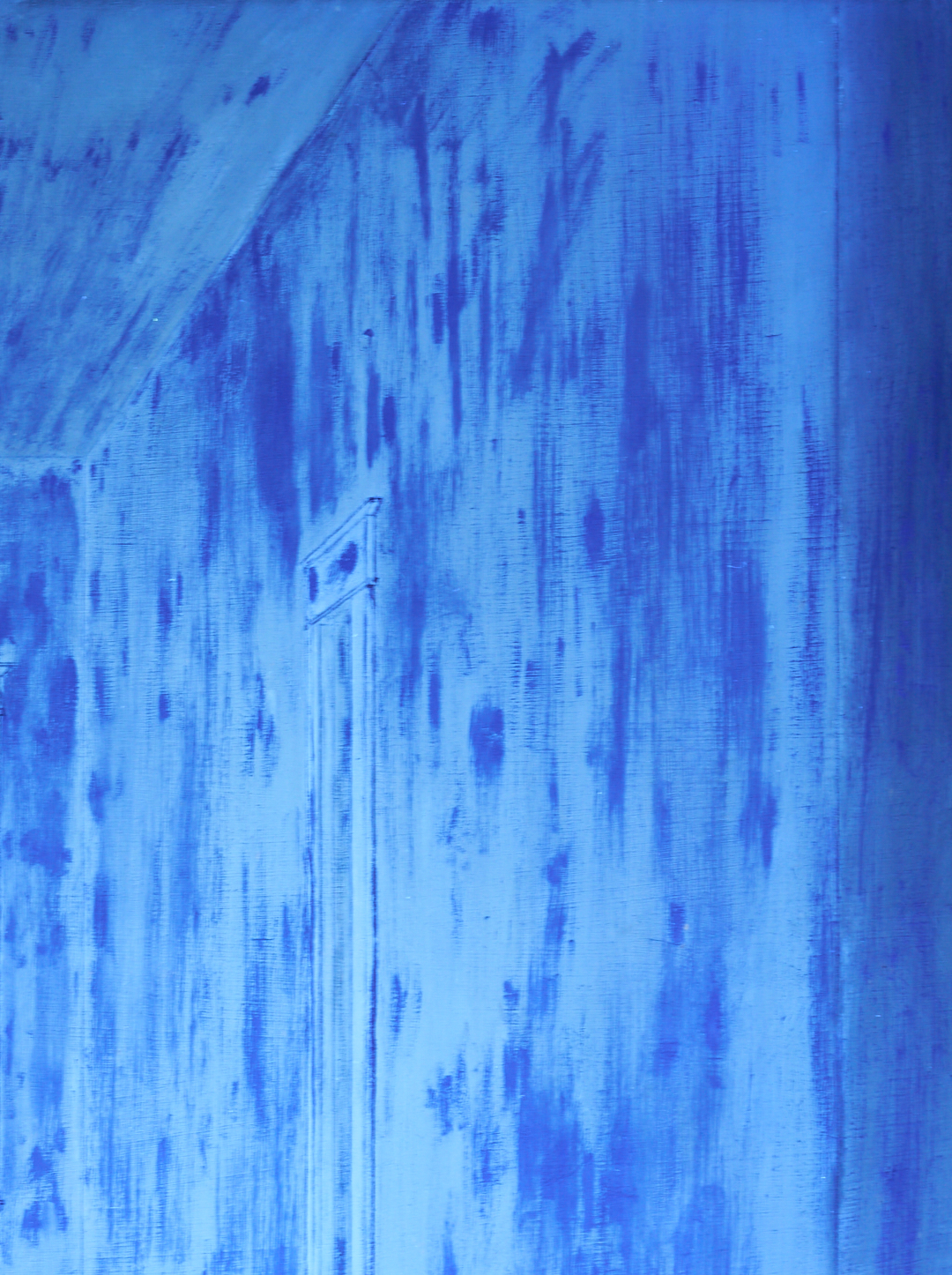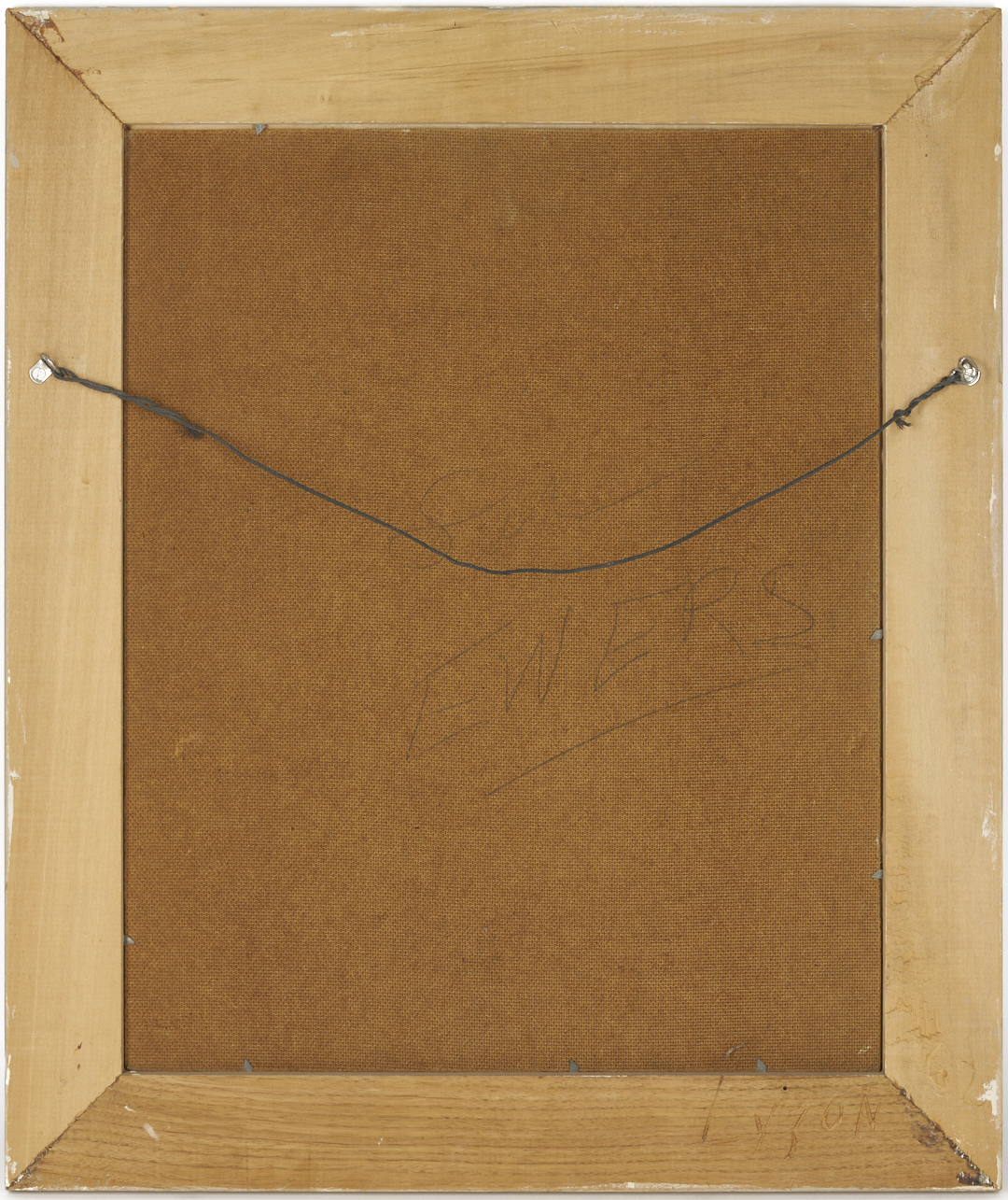 CONDITION: Overall excellent condition. A couple of tiny inclusions or errant paint drips to floor, and some scratching left center edge, under the frame. Areas of fluorescence under ultraviolet light throughout, especially around block in foreground, are possibly inherent.