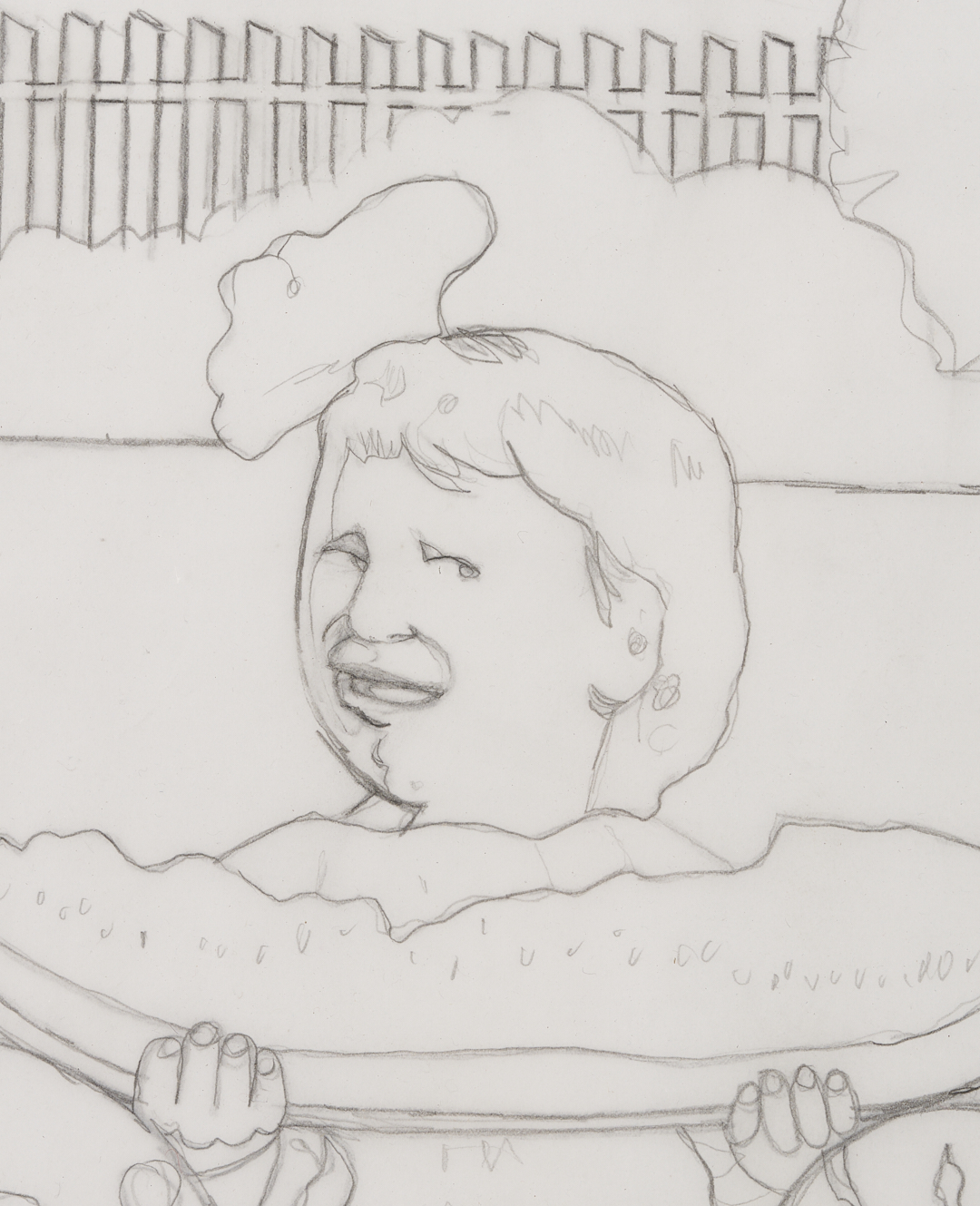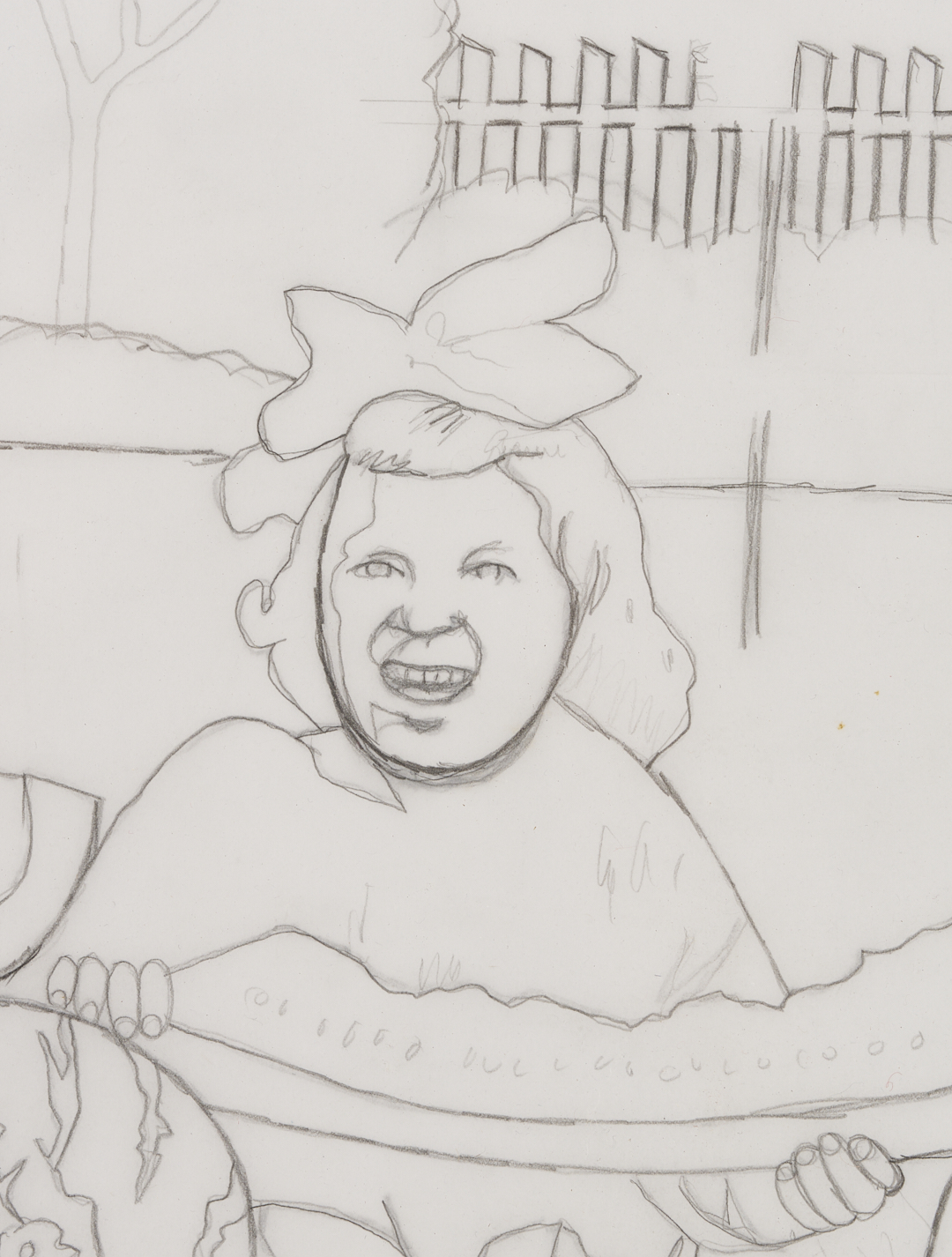Carroll Cloar (American/Tennessee/Arkansas, 1913-1993) drawing, graphite on paper, study for “Watermelon Girls.” Two young girls sit before an outdoor fence, enjoying oversized slices of watermelon. Trees and bushes are partially drawn in the background. Signed “Carroll Cloar 86” lower right and titled lower left. Unframed. 34 in. W x 23 in. H. Note: the acrylic painting for which this work was a study was painted in 1986 and is in the collection of the Historic Arkansas Museum. (ref. Encyclopedia of Arkansas).