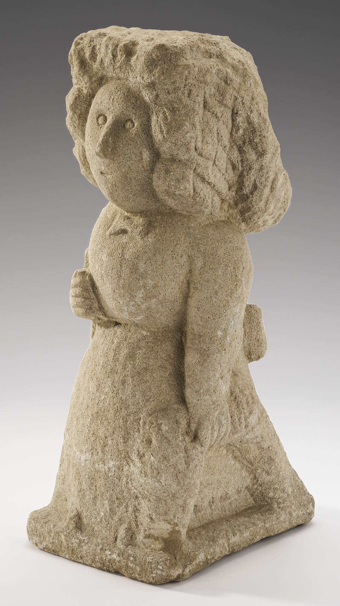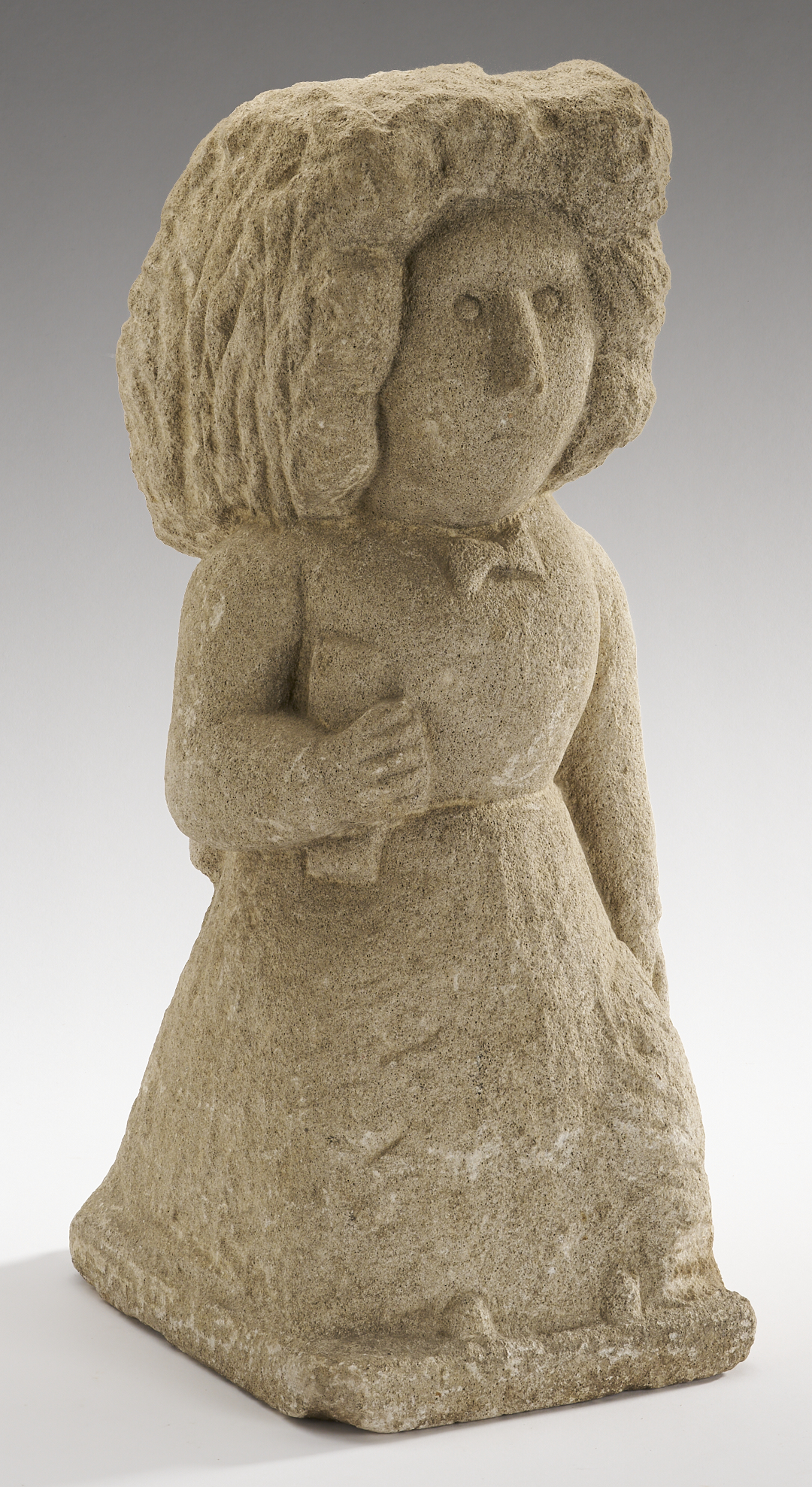 William Edmondson (American/Tennessee, 1874-1951), “Schoolteacher Lifting her Skirt,” carved limestone sculpture of a woman with thick, deeply-incised medium length hair, wearing a long dress with bow at neck and in back. With her right arm she holds a book against her side and with her left she raises the hem of her dress to reveal a scalloped slip or undergarment. Her shoes extend over the carved, rectangular base. Underside of base marked “101”. 15 1/2 in. H x 6 in. W. x 8 in. D.