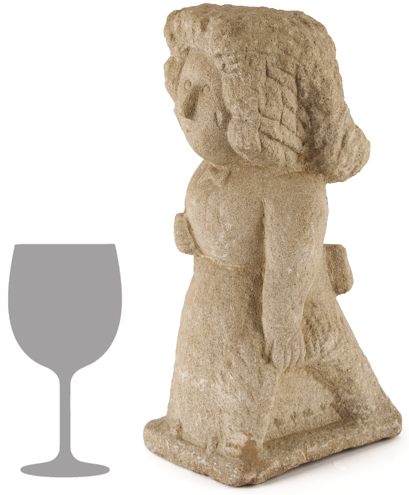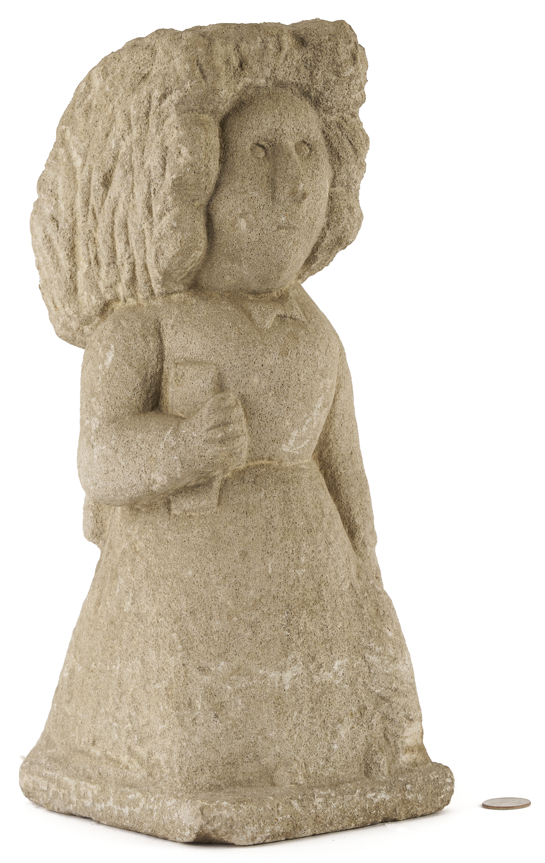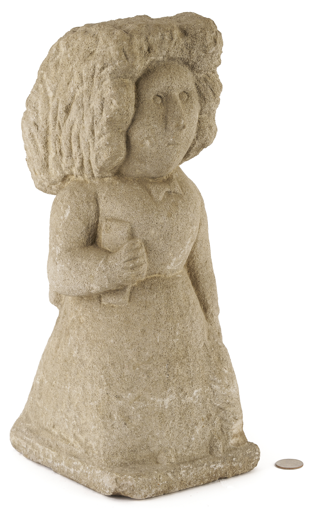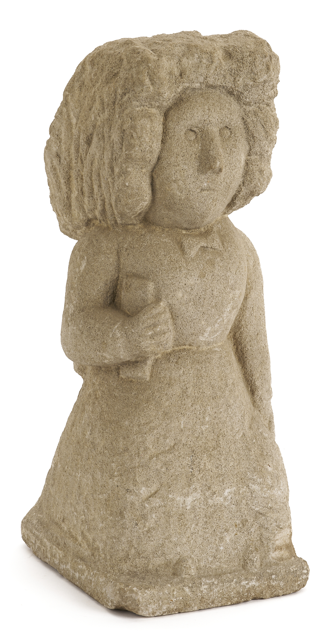 William Edmondson (American/Tennessee, 1874-1951), “Schoolteacher Lifting her Skirt,” carved limestone sculpture of a woman with thick, deeply-incised medium length hair, wearing a long dress with bow at neck and in back. With her right arm she holds a book against her side and with her left she raises the hem of her dress to reveal a scalloped slip or undergarment. Her shoes extend over the carved, rectangular base. Underside of base marked “101”. 15 1/2 in. H x 6 in. W. x 8 in. D. Exhibited, “Will Edmondson’s Mirkels,” catalog no. 101, Cheekwood (Nashville, TN), 1964. Note: this sculpture is also pictured in a Feb. 9, 1941 article about Edmondson in the Nashville, Tennessean newspaper, along with two other female figures all noted as “showing the broad and rich humor of his [William Edmondson’s] views on the human race.” The article was a preview for a one-man exhibit of more than 30 Edmondson works at the Nashville Art Gallery at 419 Union Street. However, the article does not make it clear whether this sculpture was included in that exhibit. (A copy of the newspaper article containing the photograph of this sculpture is available to the winning bidder). Another sculpture, “Two Doves,” from the same collection, is also for sale in this auction. Artist biography: William Edmondson, the first African American artist to have a solo exhibit at the Museum of Modern Art, was born in Davidson County, Tennessee, the son of freed slaves. He worked most of his life as a railroad employee and janitor. A spiritual experience at the age of 57 prompted him to begin sculpting limestone, and he credited divine inspiration for the works produced during his 17-year art career. In the 1930s, his work caught the attention of well-connected Nashville arts patrons Alfred and Elizabeth Starr and Harper’s Bazaar photographer Louise Dahl-Wolfe, wife of Nashville-born artist Meyer Wolfe. Louise Dahl-Wolfe’s now-famous photographs of Edmondson and his yard full of limestone sculptures brought him to the attention of the New York art world including Alfred Barr, Jr., director of the Museum of Modern Art, resulting in the landmark 1937 exhibit. Although Edmondson’s earliest work was more utilitarian in nature, encompassing tombstones and birdbaths, as his style matured his subject matter grew to include Biblical figures, various animals, and female figures, frequently based on women he knew from his community.