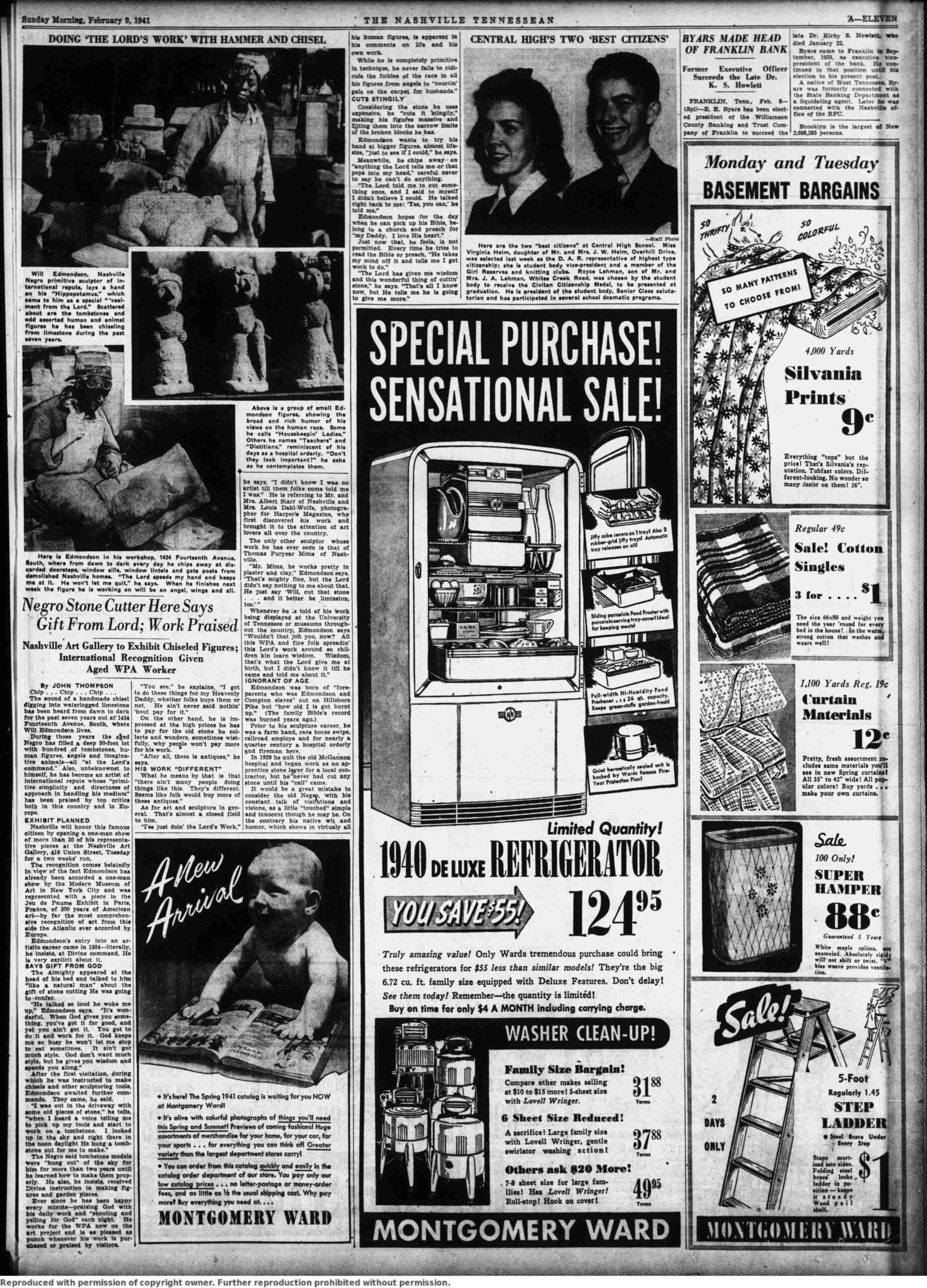 The collection of Wharton McDaniel, by descent from his parents, Mr. and Mrs. William R. Rutherford McDaniel of Nashville and later, Texarkana, TX. Bill McDaniel was a publisher, radio station owner, publicist, and an editor at the Nashville Tennessean newspaper. In the late 1930s, Bill McDaniel and William Edmondson both worked for the Federal Works Progress Administration in Nashville. In his role at the WPA, McDaniel served as director of the Tennessee Writers’ Project, and published Tennessee: A Guide to the State (which briefly referenced Edmondson and his work). Mrs. McDaniel volunteered with the Nashville Art Gallery, a WPA-backed initiative intended to highlight the work of local artists.