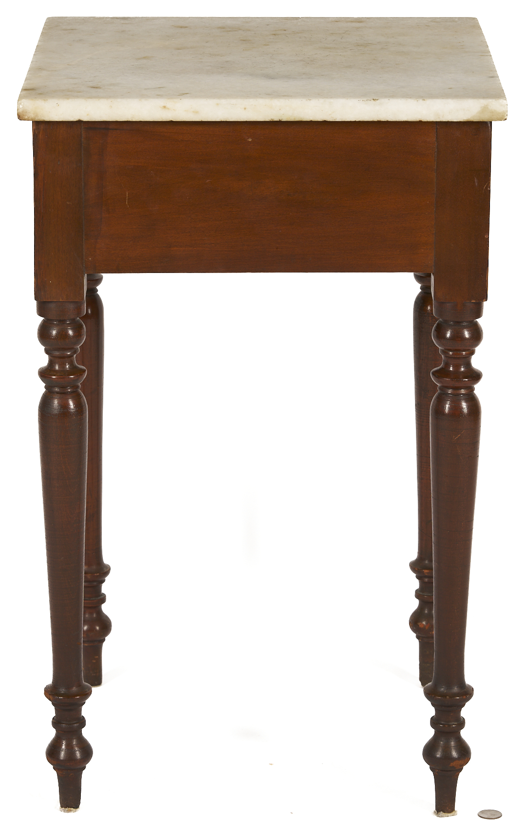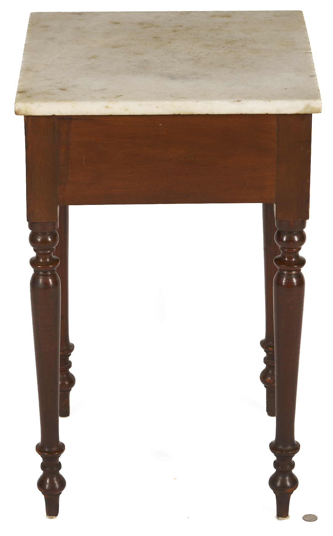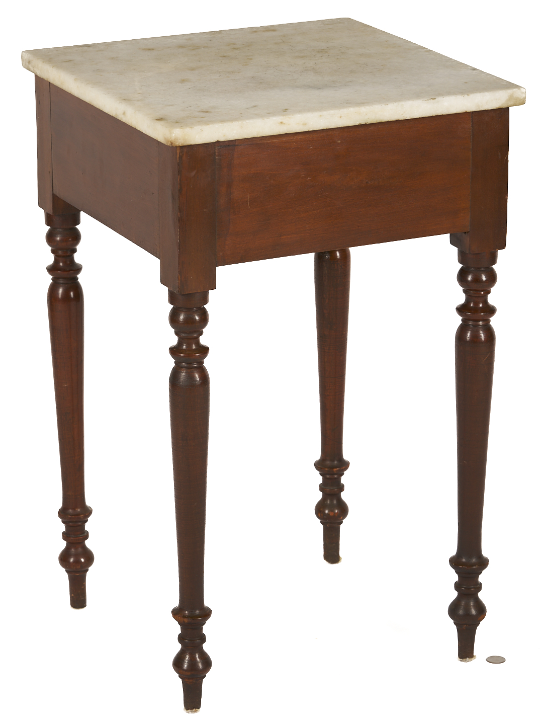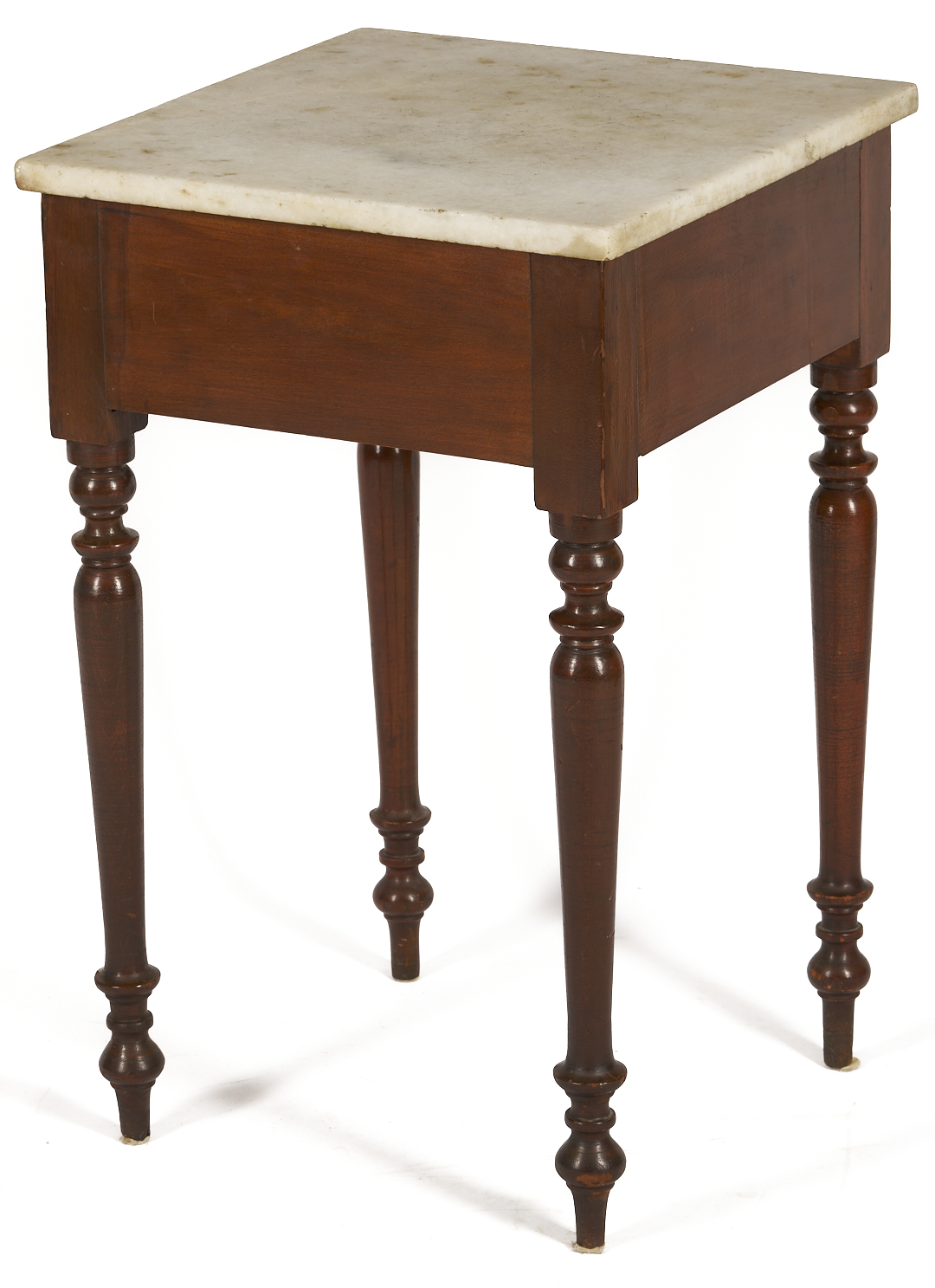 Middle Tennessee cherry mixing table with marble slab top atop a plain deep skirt, supported on four turned legs ending in ball and spike feet. 29 in. H x 18 in. square. Circa 1845.