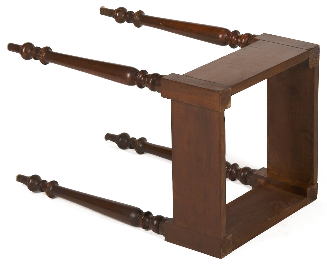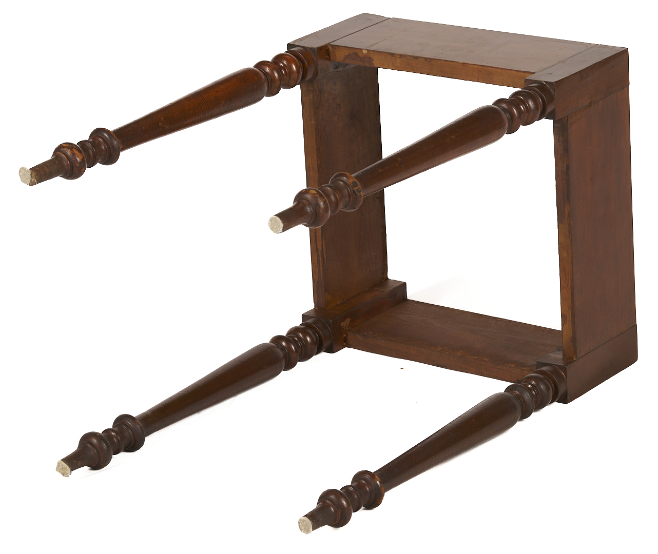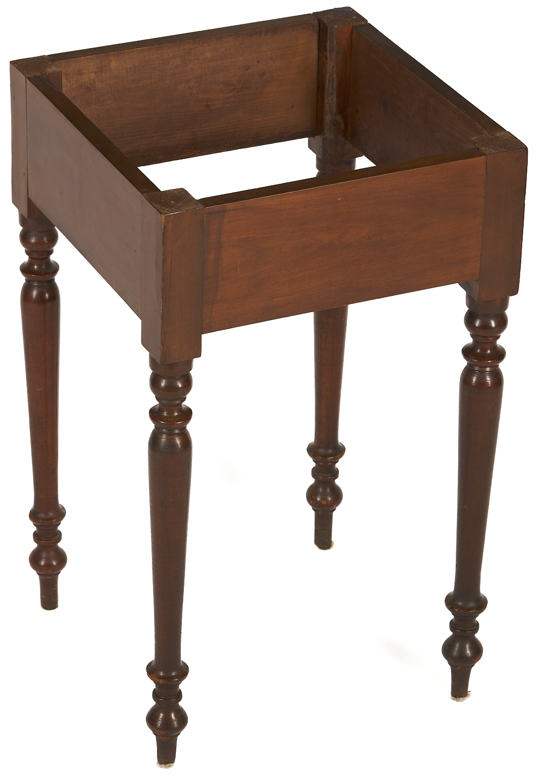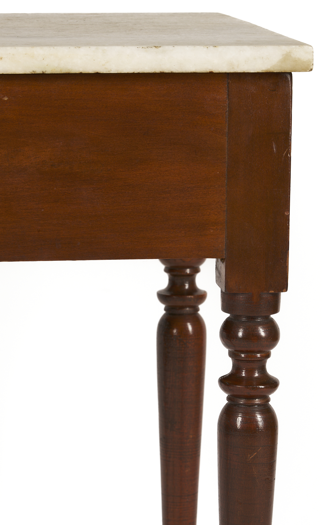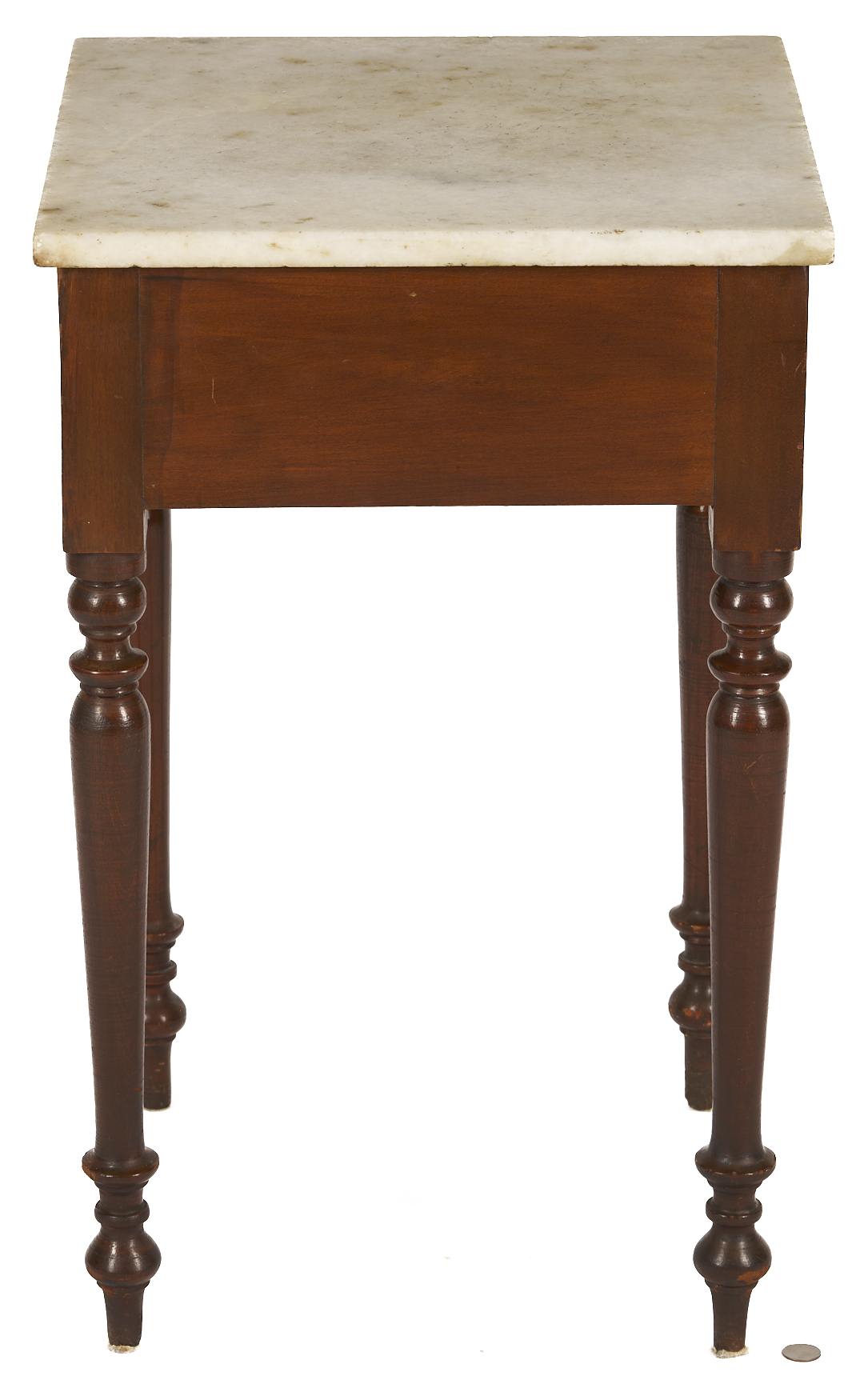 Middle Tennessee cherry mixing table with marble slab top atop a plain deep skirt, supported on four turned legs ending in ball and spike feet. 29 in. H x 18 in. square. Circa 1845.